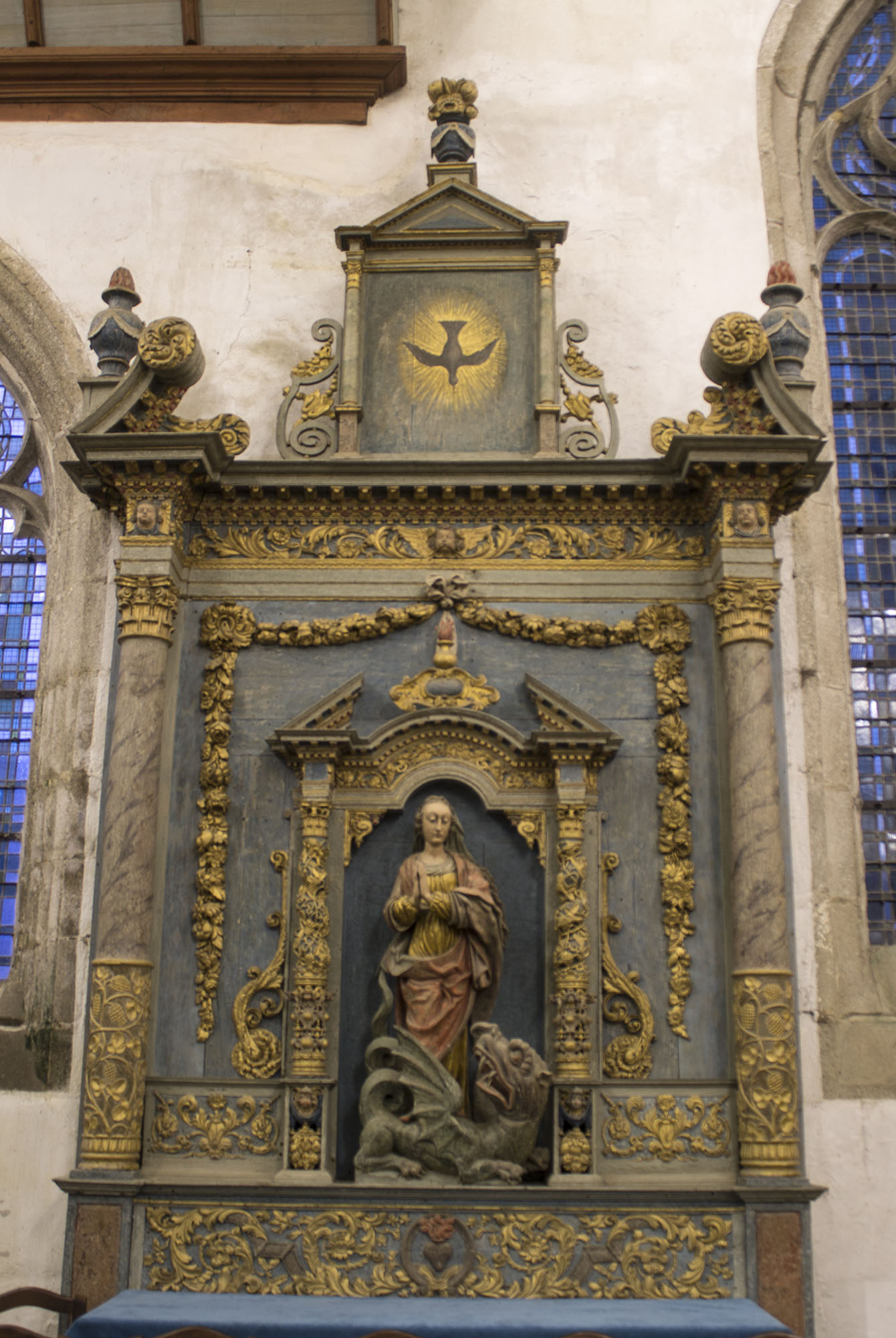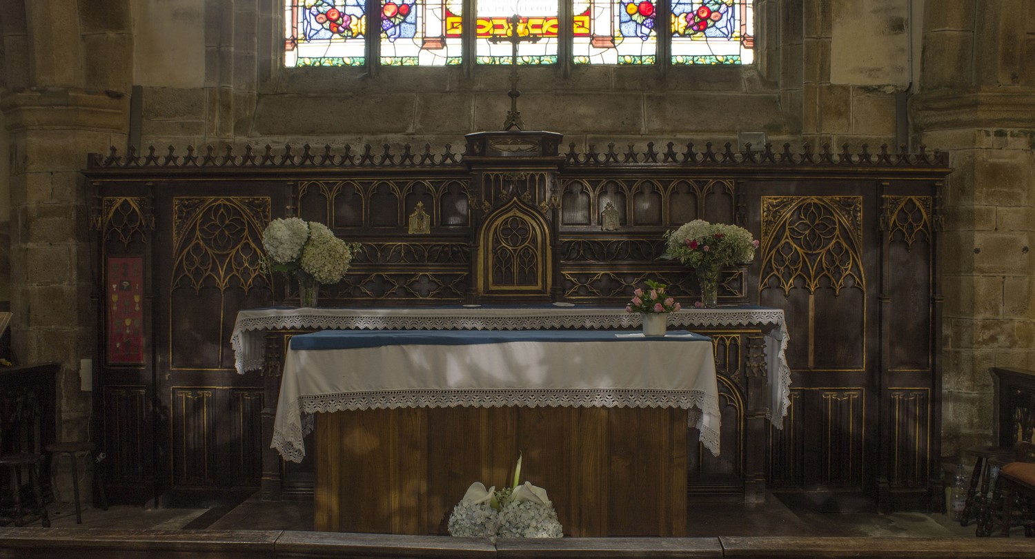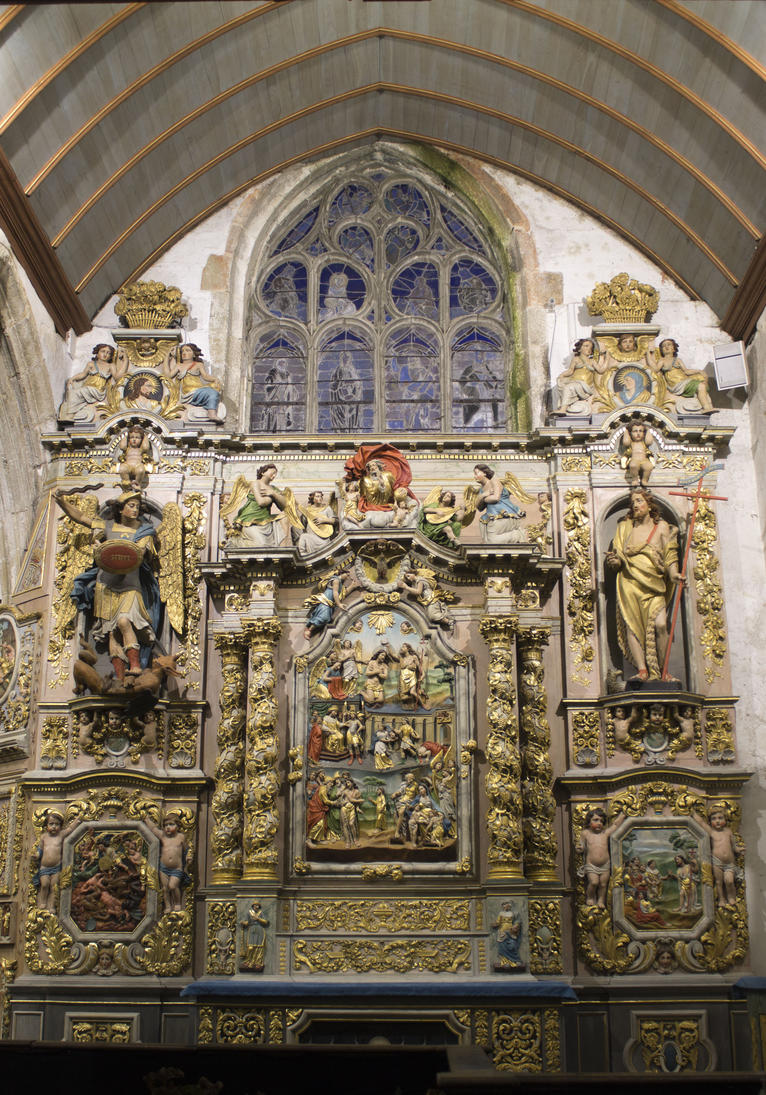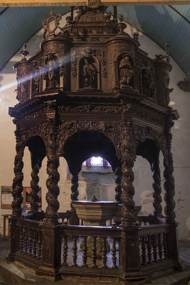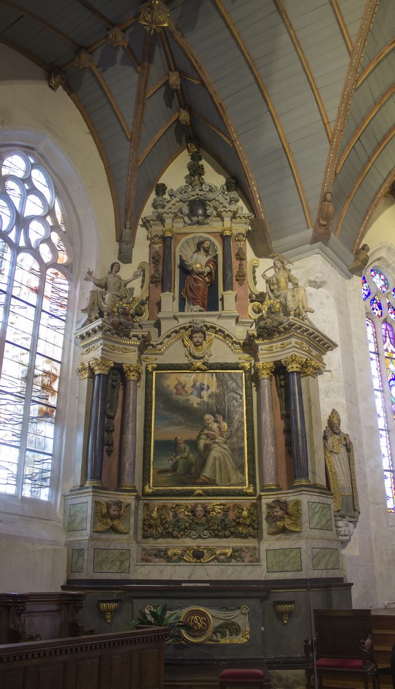 ► L’église a vu sa nef et son chœur s’habiller au XVII de nombreux retables en bois du style baroque bretonnant. Le XVII fut une période faste pour l’expansion de la foi chrétienne dans la région, en particulier grâce à l’activité de Julien Maunoir et de Michel le Nobletz qui inventa l’usage de dessins à symbolique chrétienne nommés en breton "taolennoù" ou tableaux de mission. Les stalles sculptées de démons aquatiques rappellent l’affinité de la culture bretonne avec cette élément.