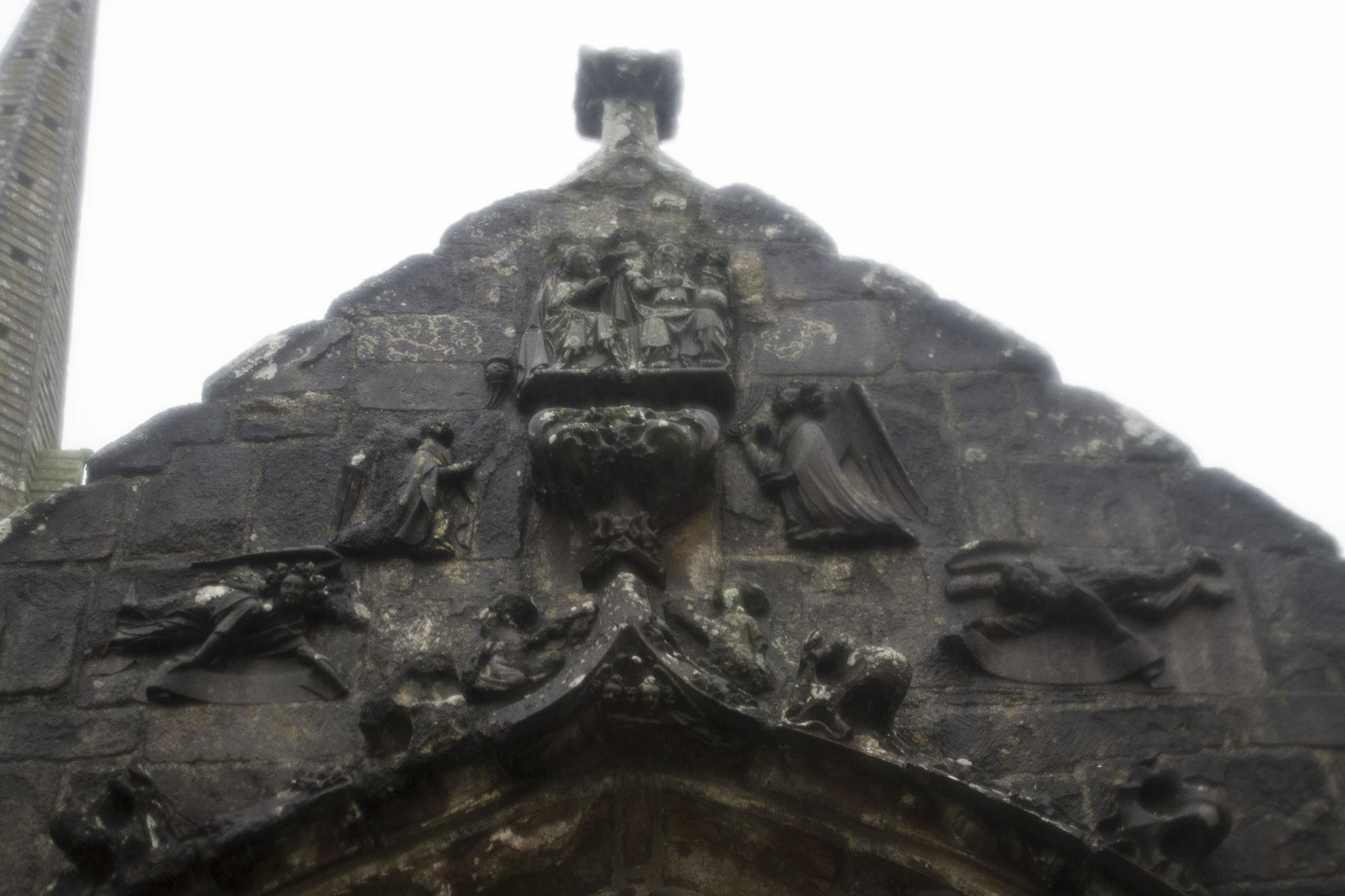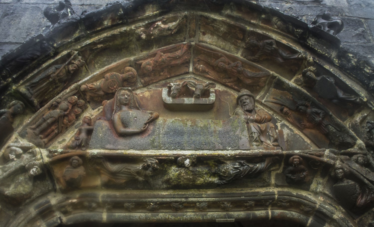 Le tympan du porche sud avec une scène de la nativité et le symbole du sel alchimique propre aux armoiries de la famille de Kersauzon.
