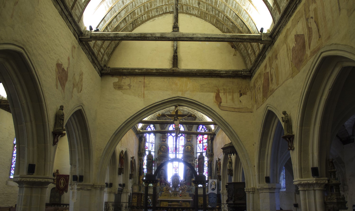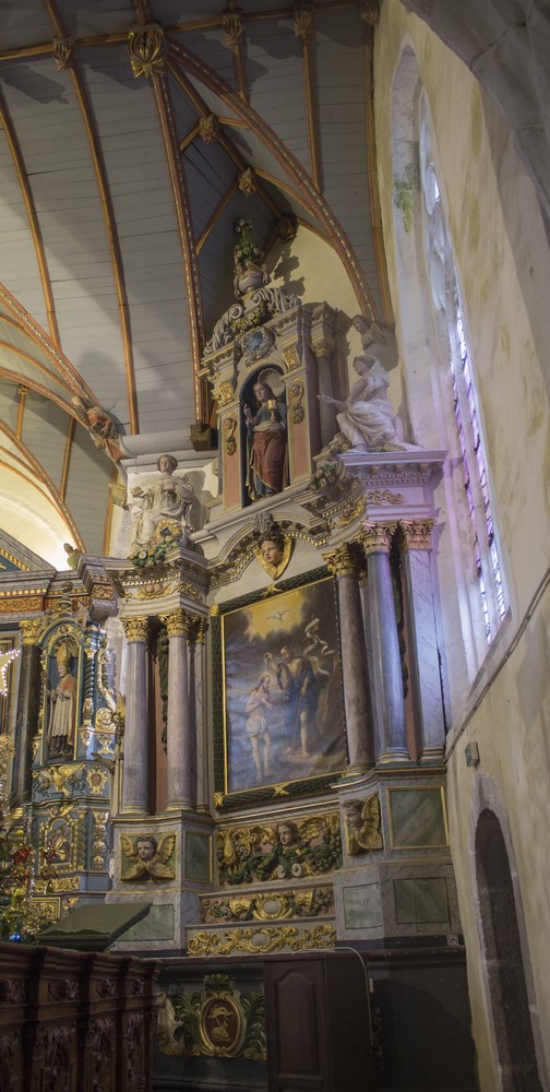 Nef de l’église très richement décorée de retables dans un style baroque breton avec sa chaire f.XVI.