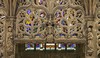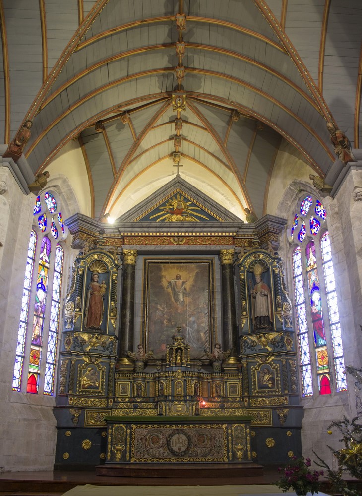 Nef de l’église avec son vitrail rayonnant ainsi qu’une Descente de croix.