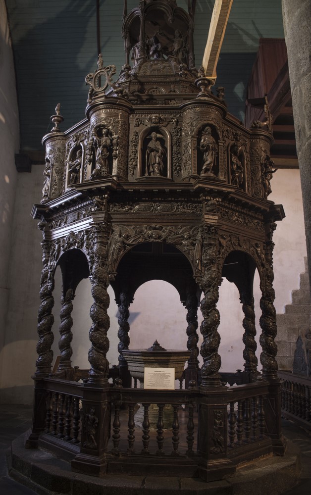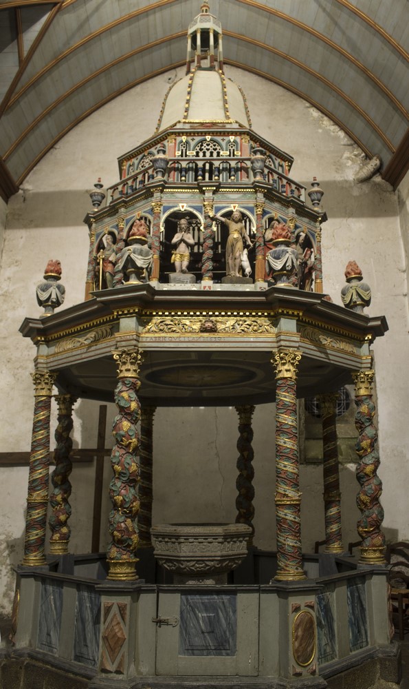Baptistère፧ de baptistère en chêne sculpté et daté de 1675.
