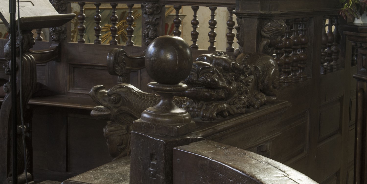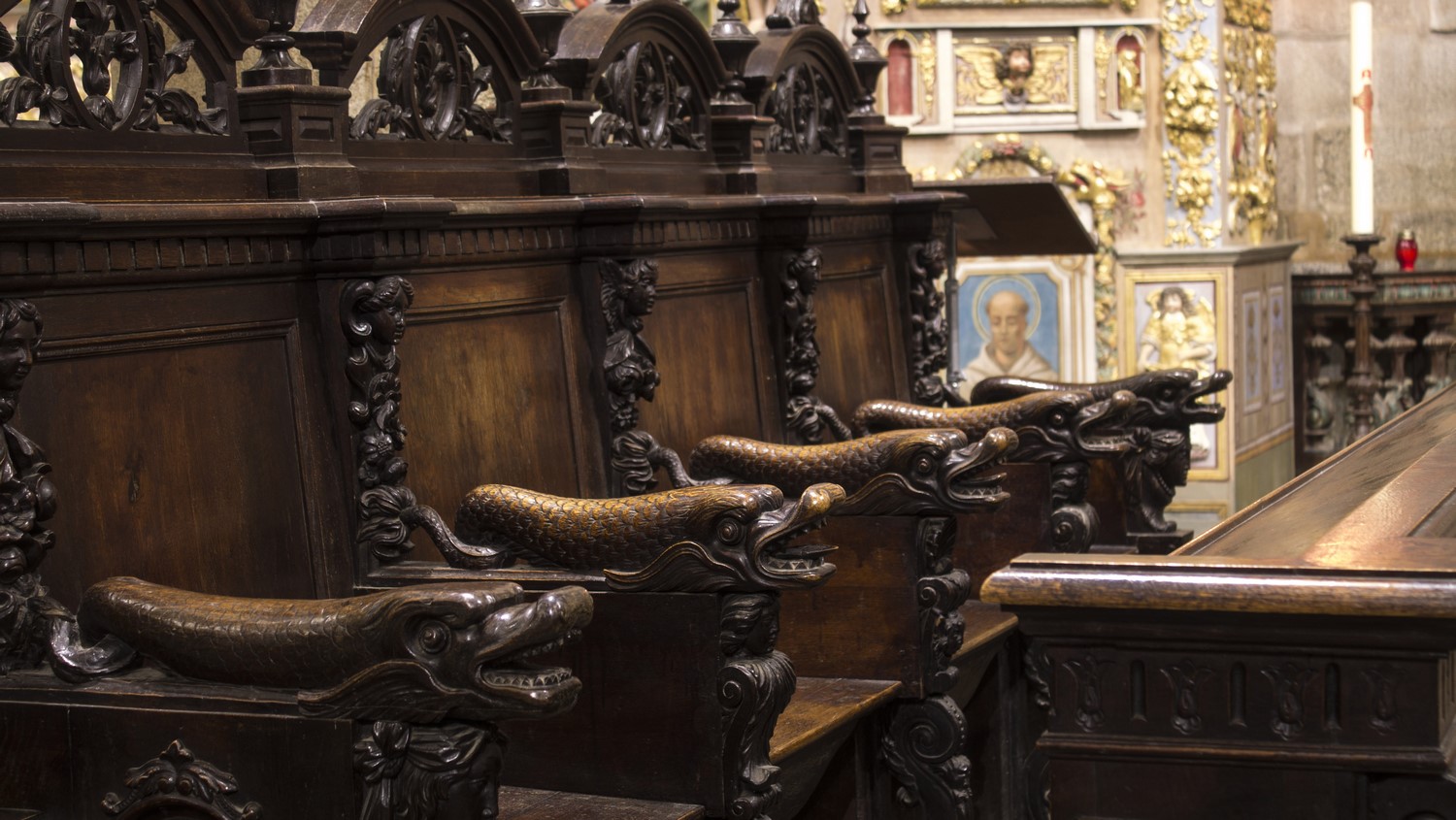 Stalles du chœur en bois du XVII avec ses accoudoirs ornés de démons aquatiques.