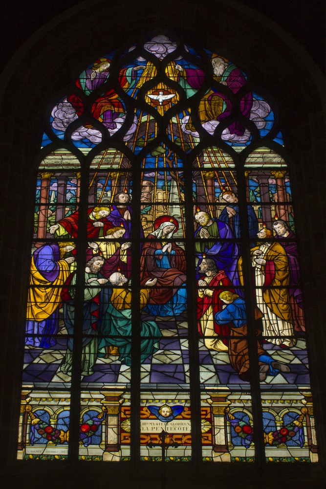 Façade sud avec ses vitraux dont les lobes aux motifs celtiques évoquent le taijitu.