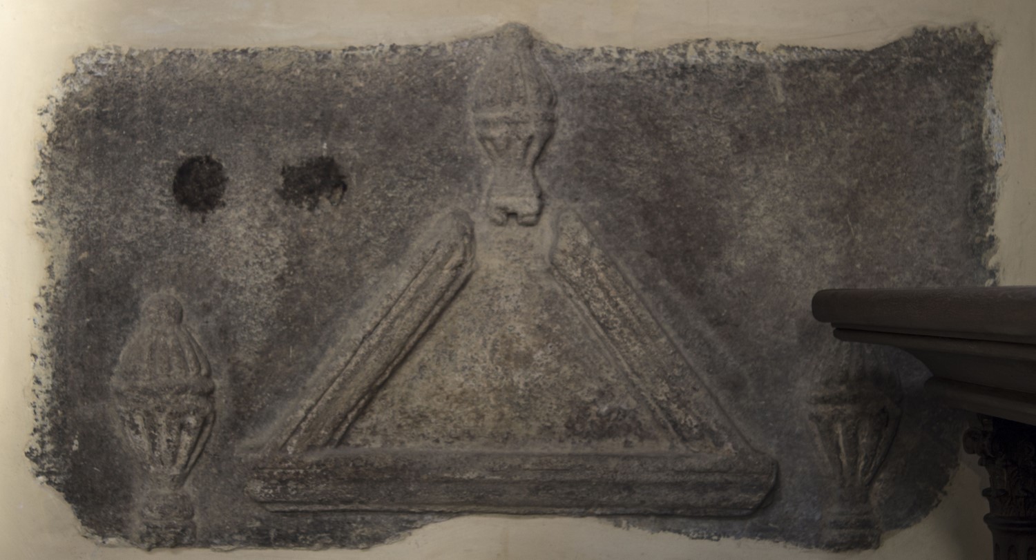 Symbole de la trinité gravé dans une pierre du mur nord de la nef.