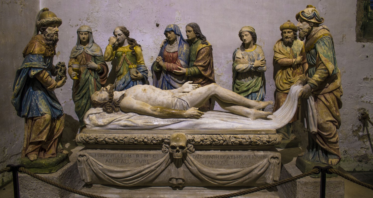 ► L’église repose sur une crypte qui abrite une Mise au tombeau du d.XVIII sculptée par Jacques Lespaignol et qui a repris la composition de celle de Bourges.