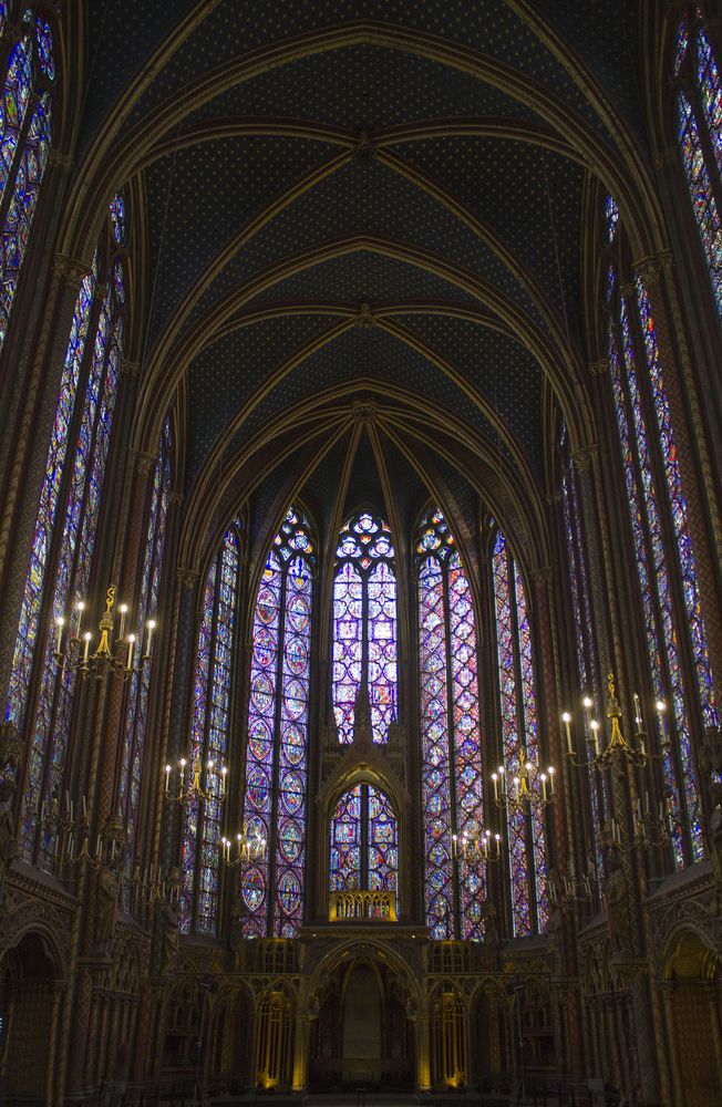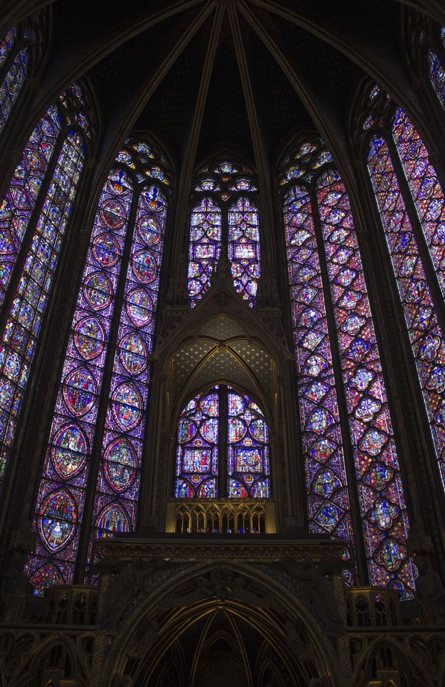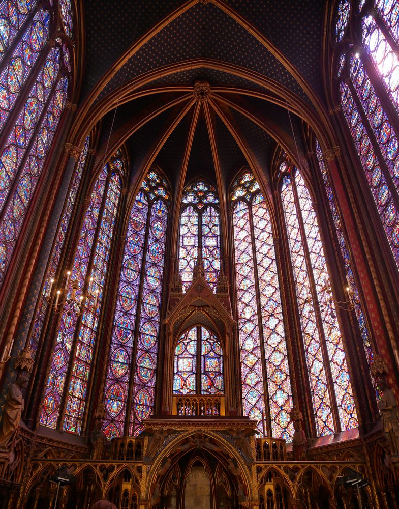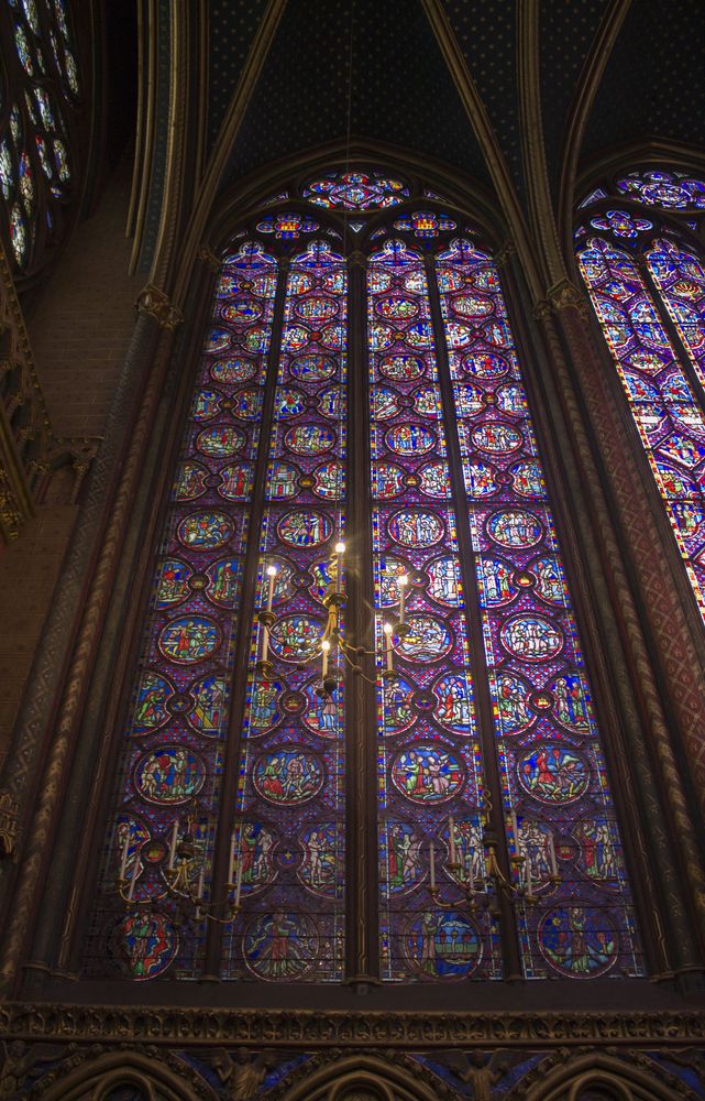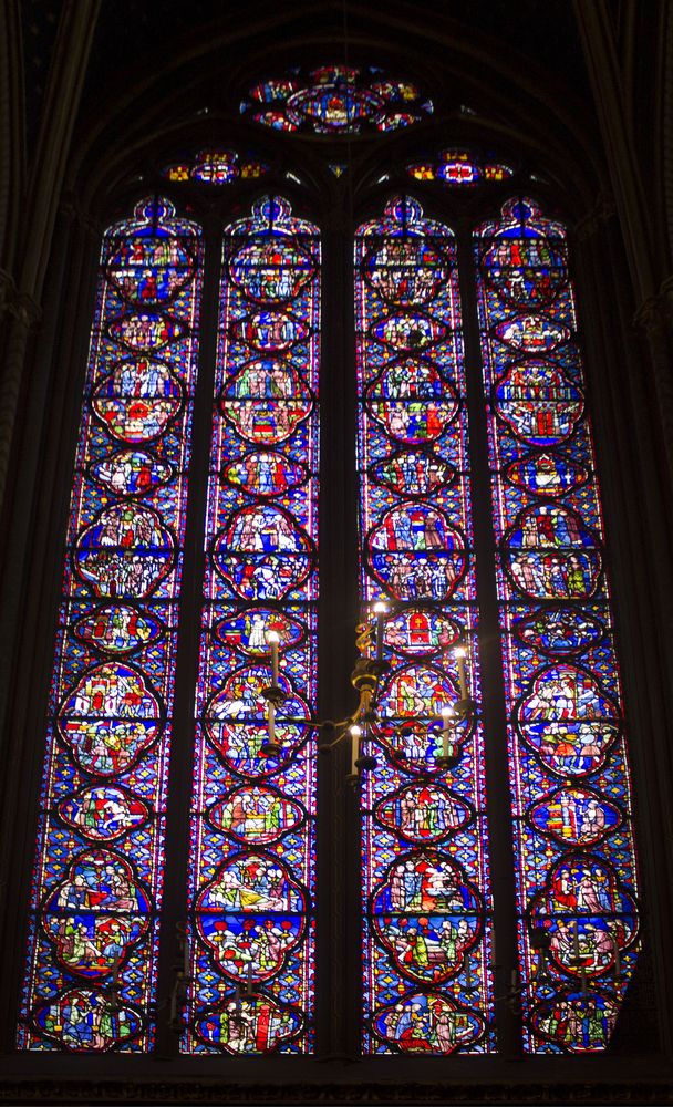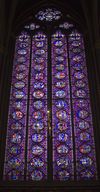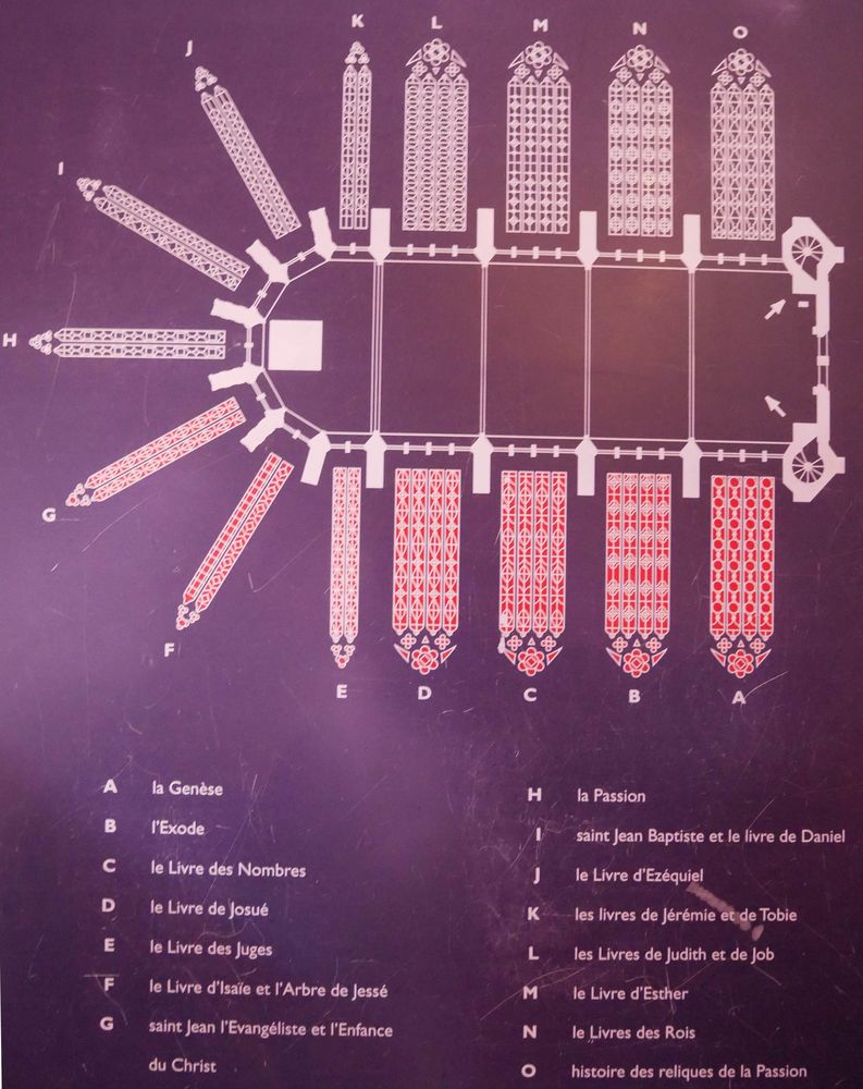 Chapelle haute du portail au chœur. L’imposant programme des verrières 1242 – 1248 se déroule sur 1113 scènes réparties sur 15 verrières pour une surface de 640 m2. Environ 70% des vitraux sont d’origine.