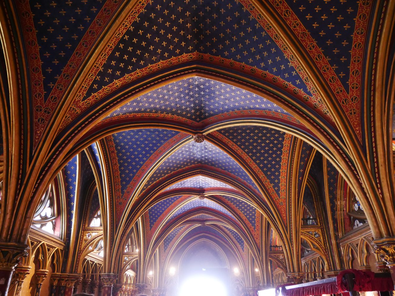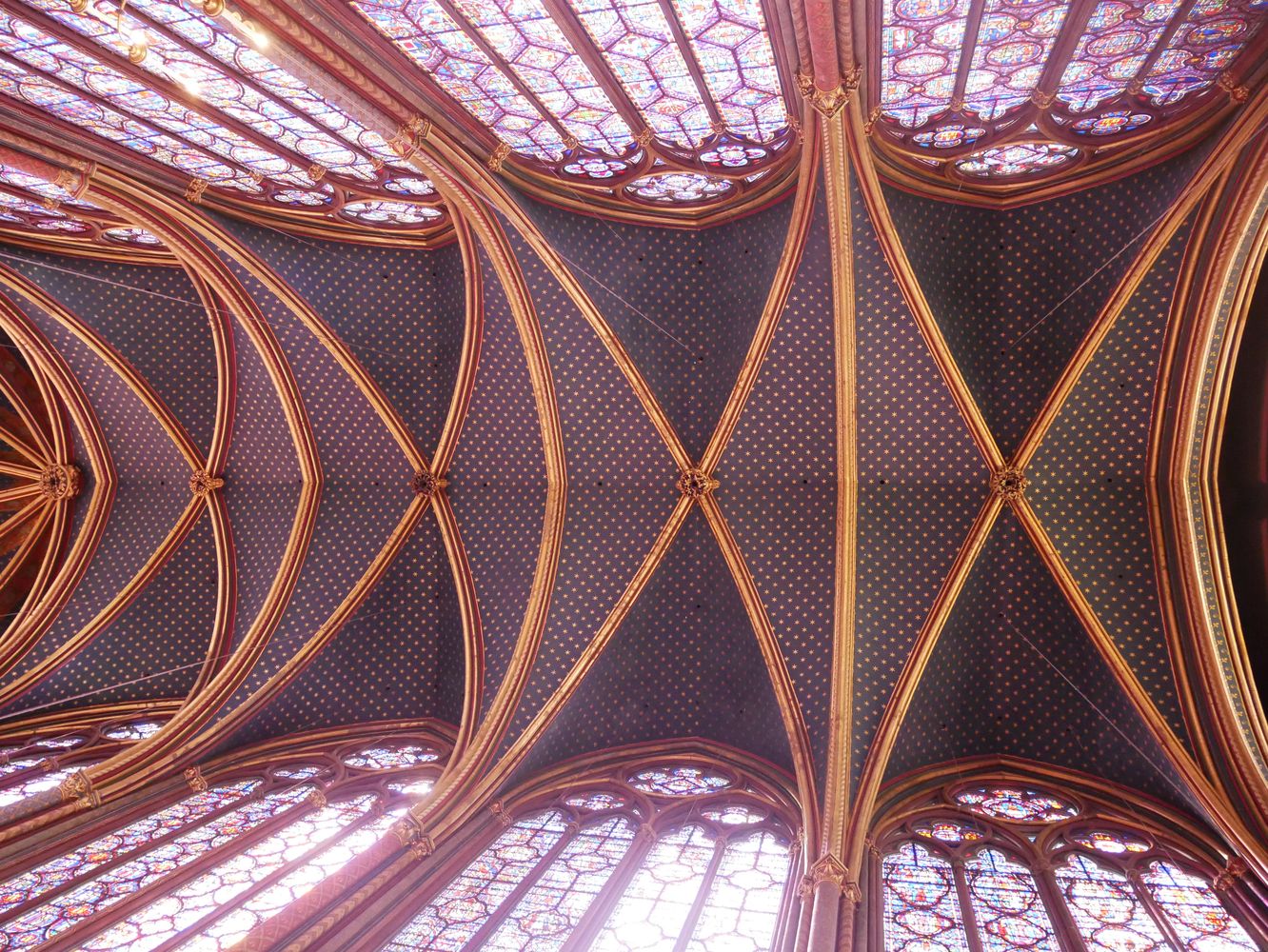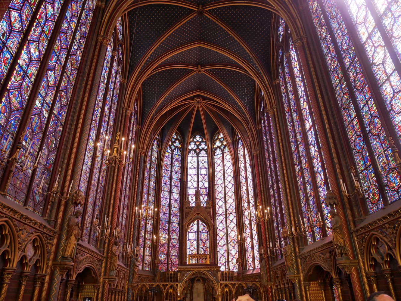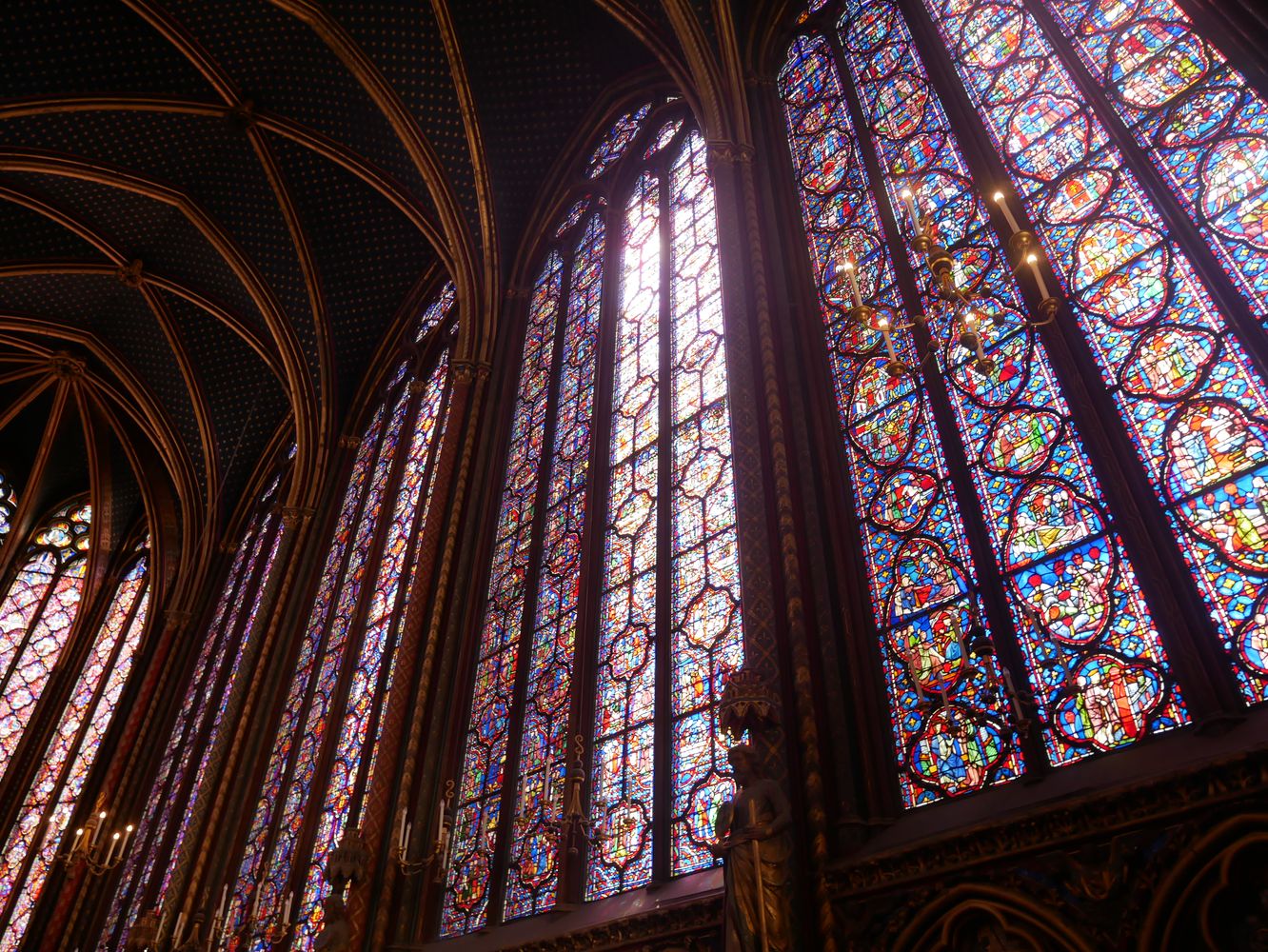 Chapelle haute du portail au chœur. L’imposant programme des verrières 1242 – 1248 se déroule sur 1113 scènes réparties sur 15 verrières pour une surface de 640 m2. Environ 70% des vitraux sont d’origine.