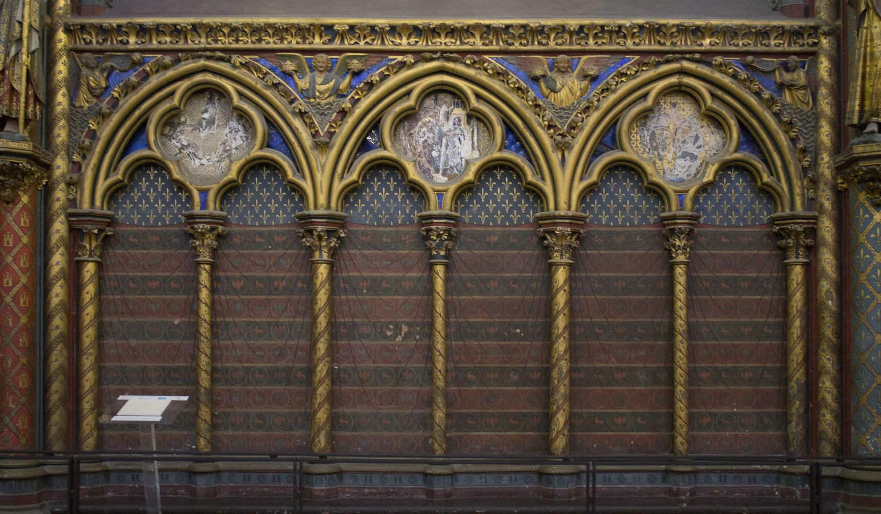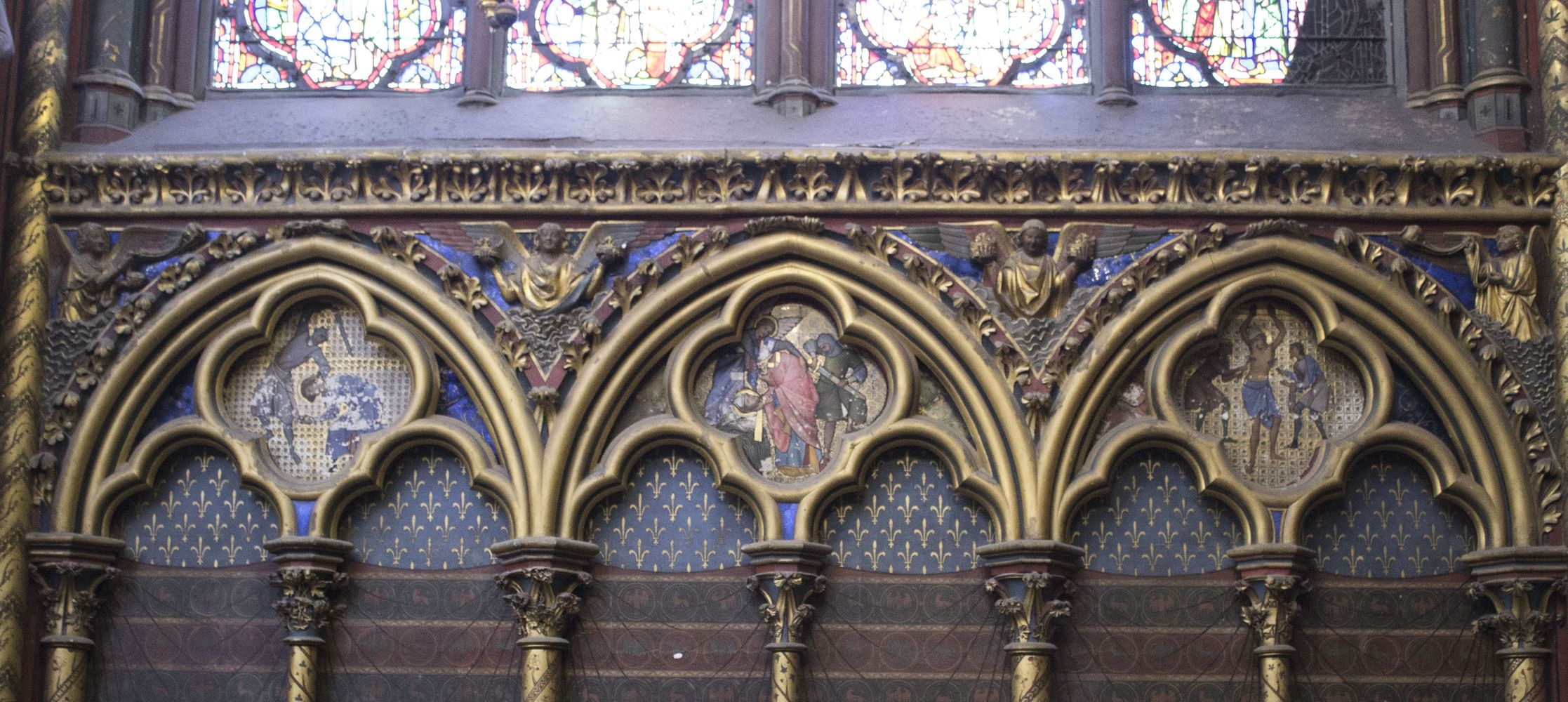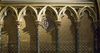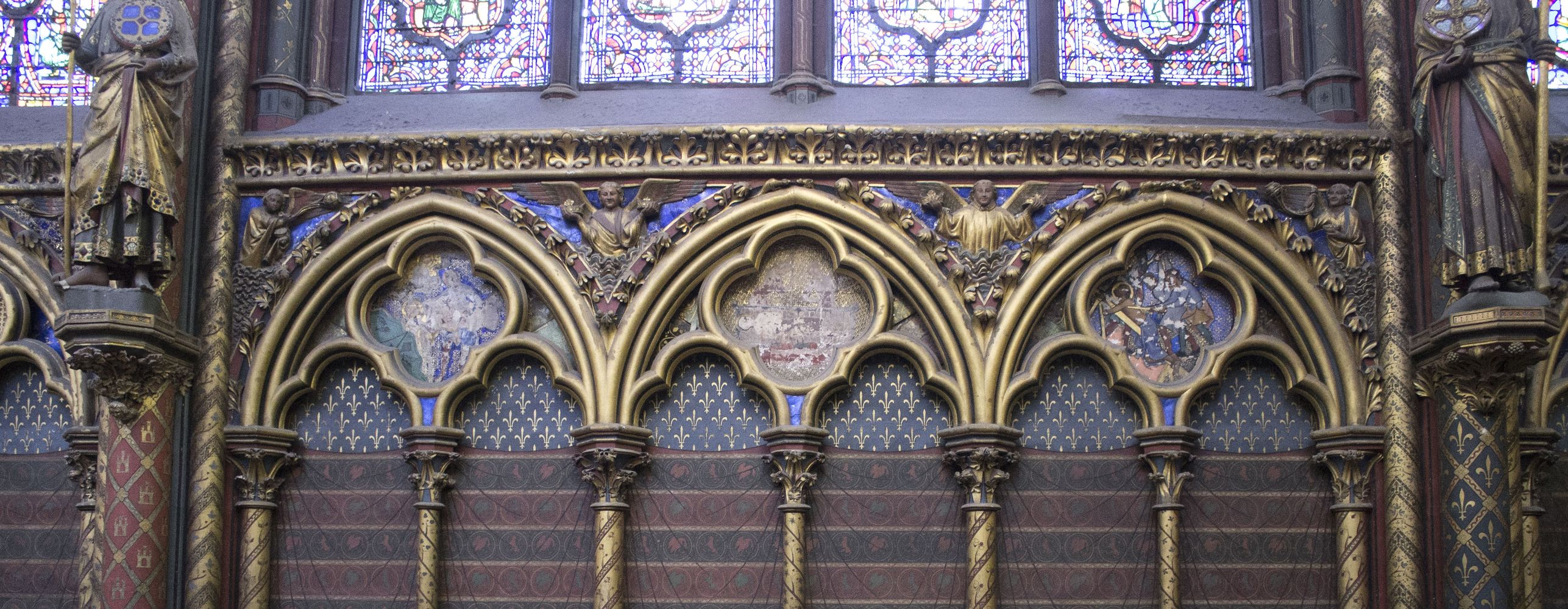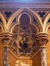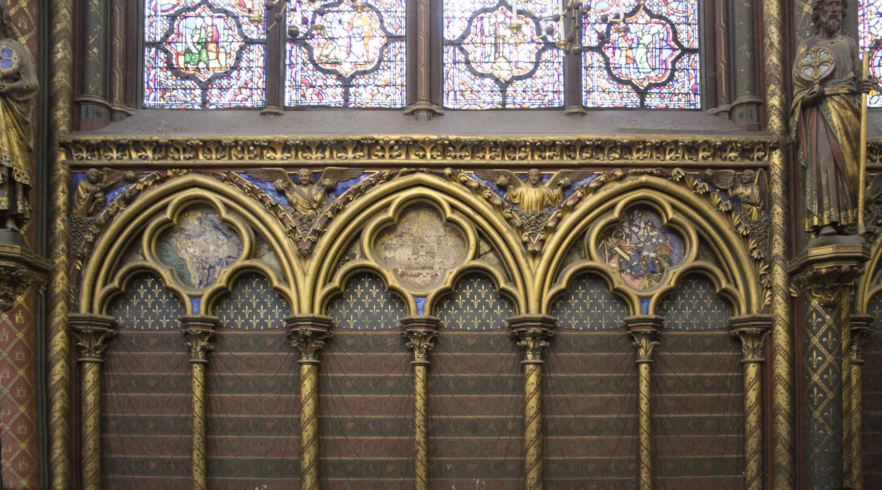 Arcatures tréflées accompagnées de médaillons d’apôtres sertis de (fausses) pierres précieuses.