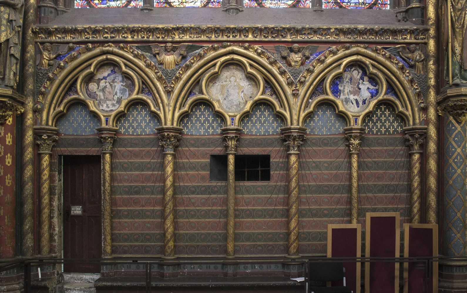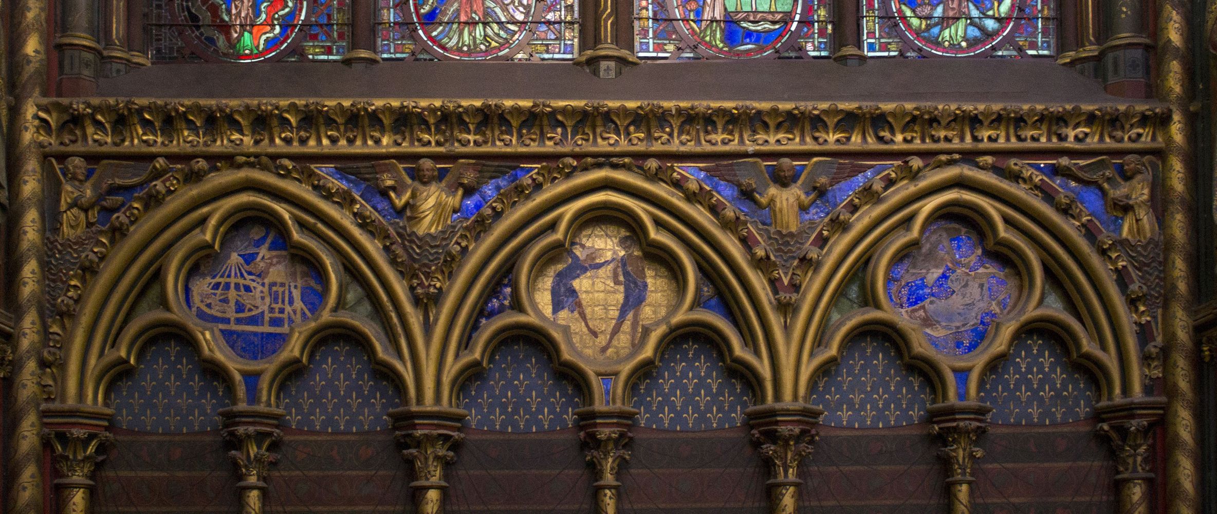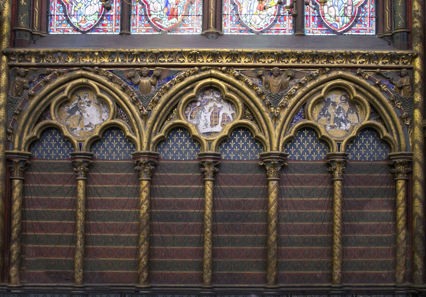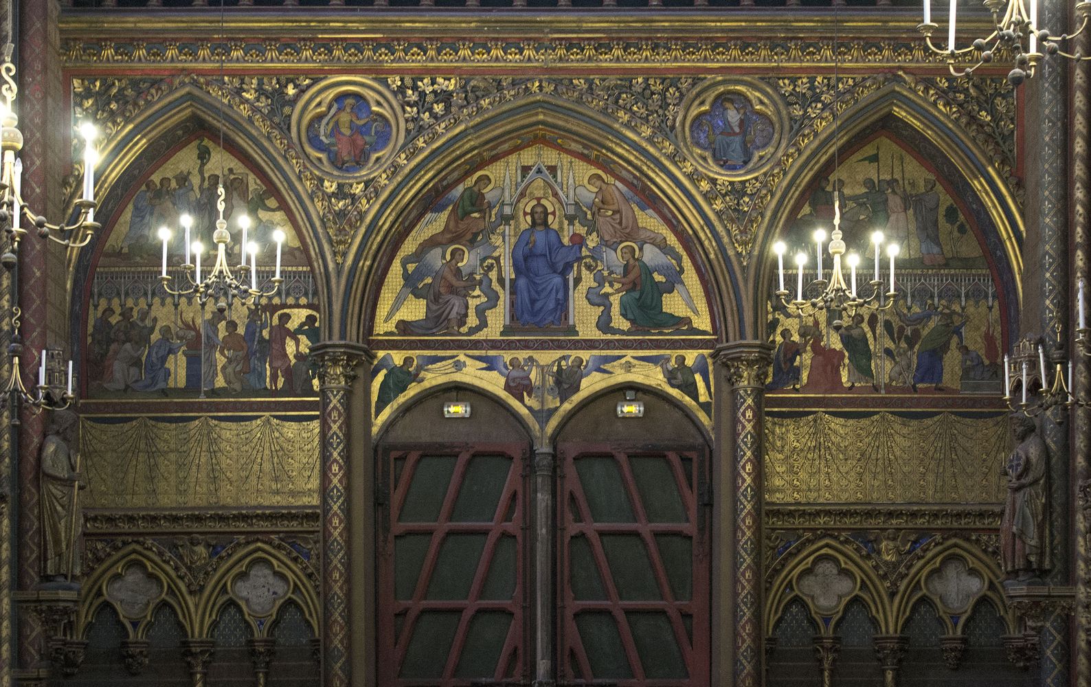 Arcatures tréflées accompagnées de médaillons d’apôtres sertis de (fausses) pierres précieuses.