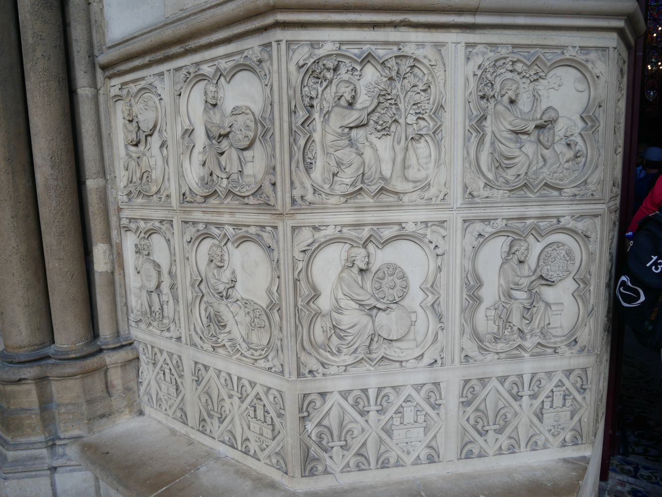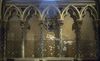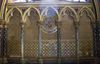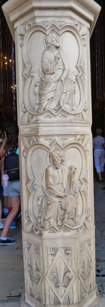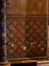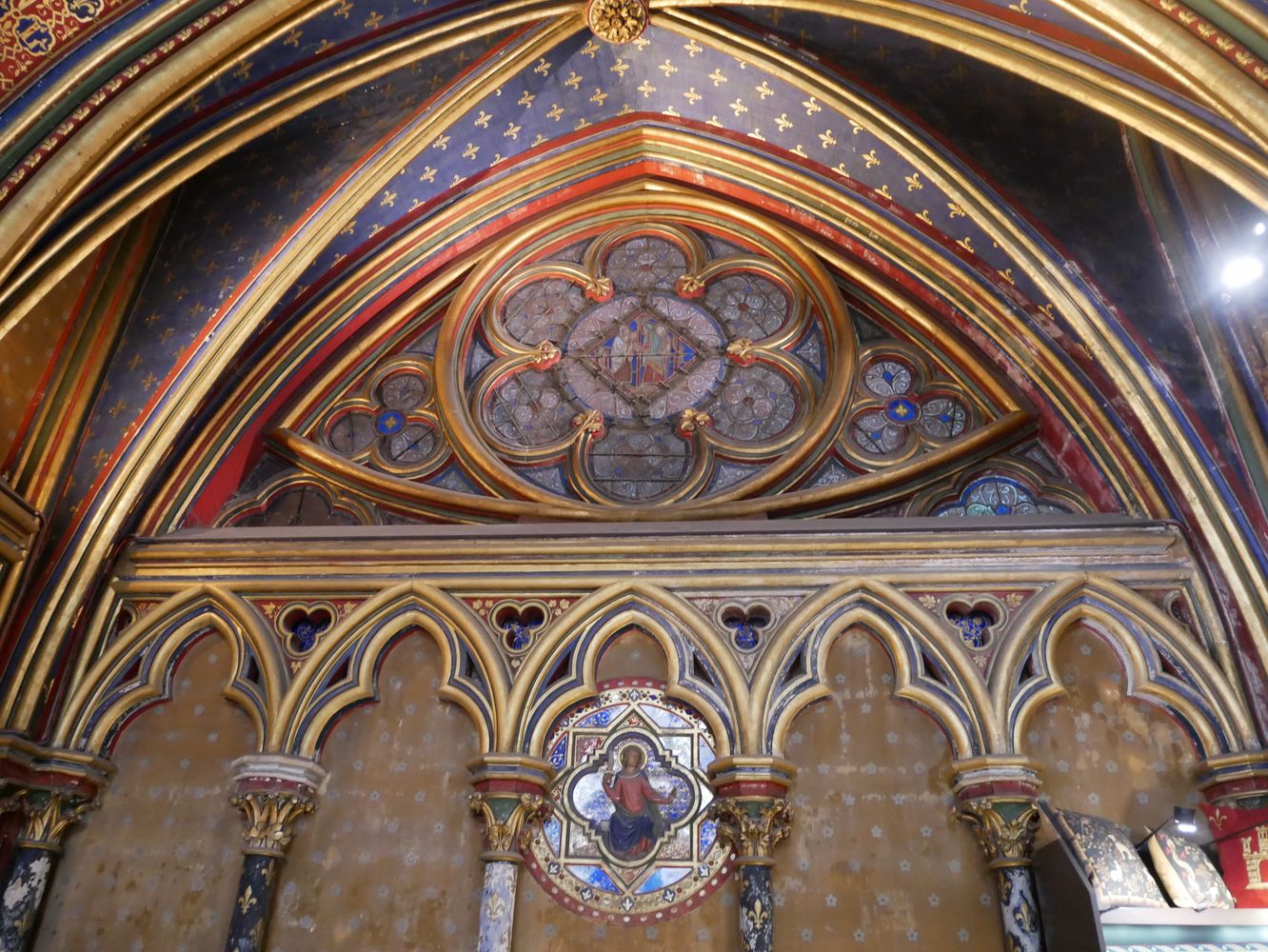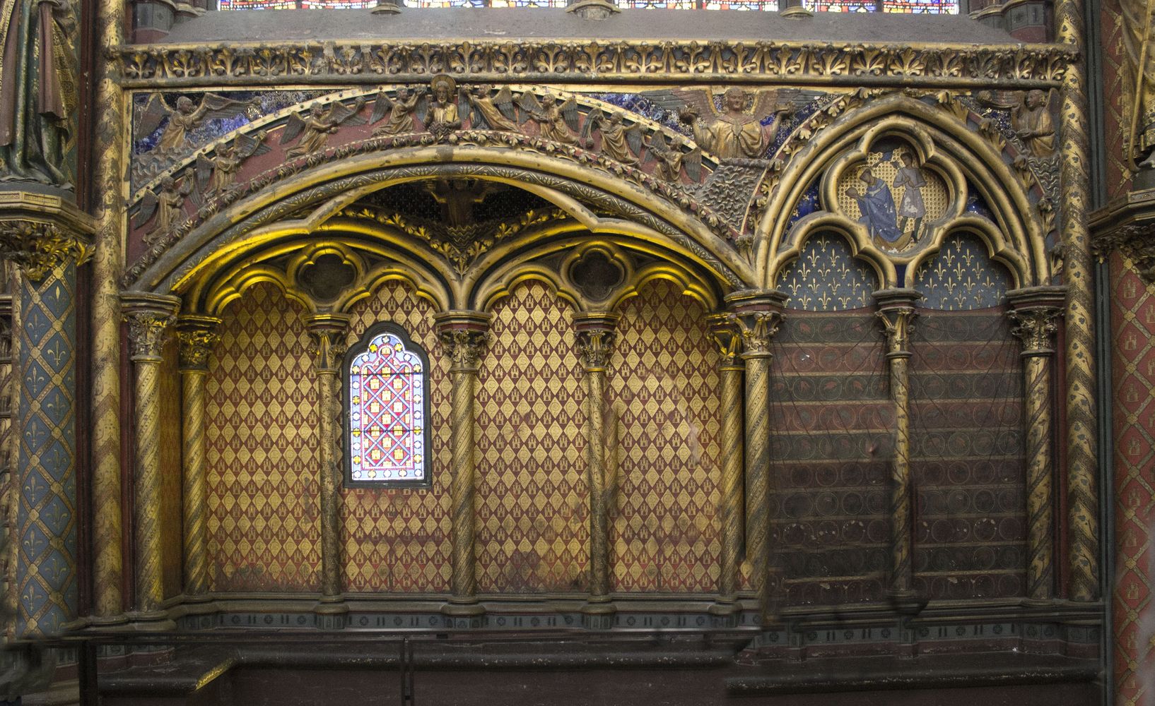 Arcatures tréflées accompagnées de médaillons d’apôtres sertis de (fausses) pierres précieuses.