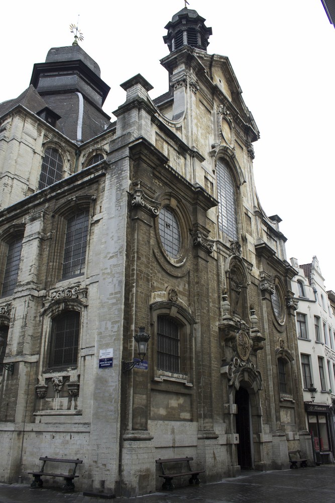 ◆ La construction de l’église actuelle que l’on doit à Joseph Poelaert est éclectique : elle se situe esthétiquement entre baroque et gothique et date de 1854 – 1874. Cette date de construction tardive par rapport à ses sœurs du centre-ville en fait la seule église située dans le Pentagone que l’on édifie après le d.XIX. Ne reste de l’ancienne église que le clocher baroque de 1629 – 1664.