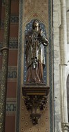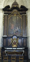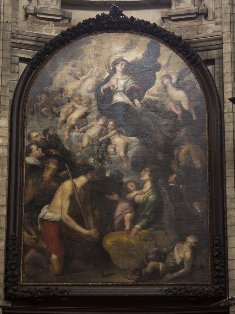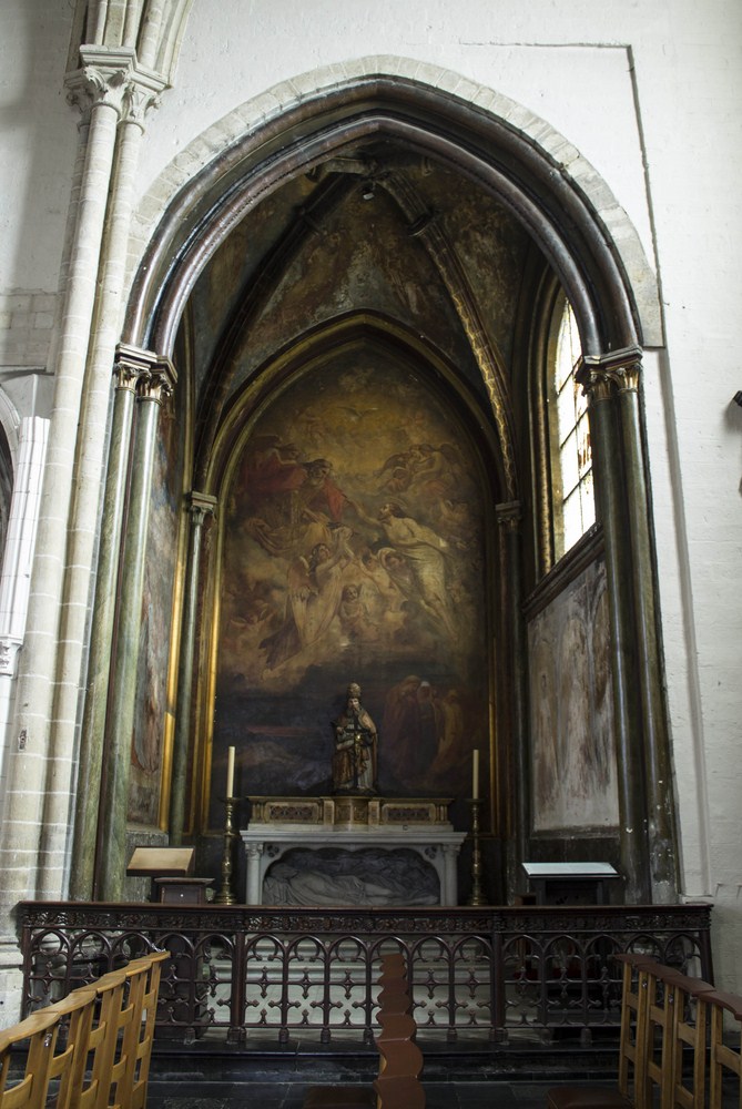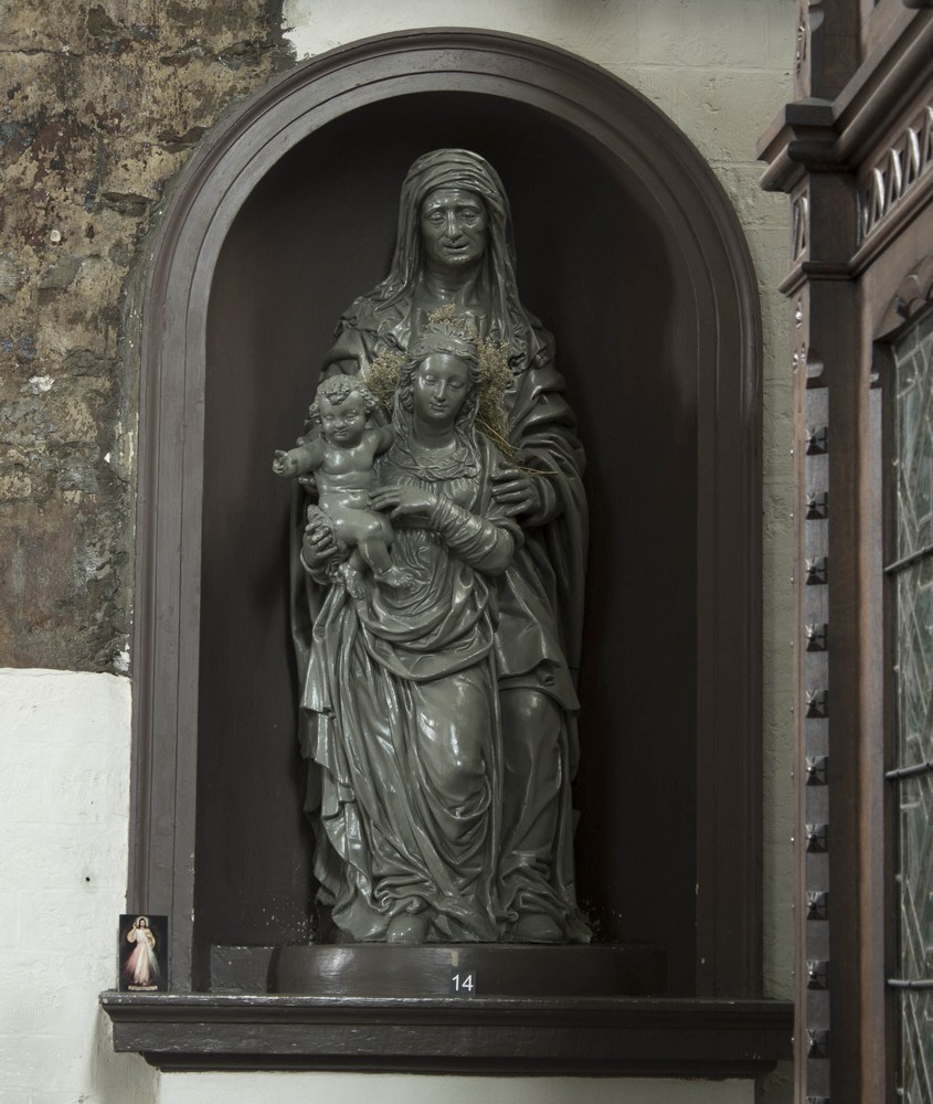 ◆ À noter encore que l’église abrite une Vierge noire du XVI, Notre-Dame d’Assistance, originellement placé dans la niche d’une maison. Transférée de l’ancienne Église Sainte-Catherine à la nouvelle, elle fut placée dans l’église après qu’elle fut retrouvée flottante sur de la tourbe alors que des vandales l’eurent jeté à l’eau. Il s’agit de l’une des neuf Vierges noires que possède la Belgique.
