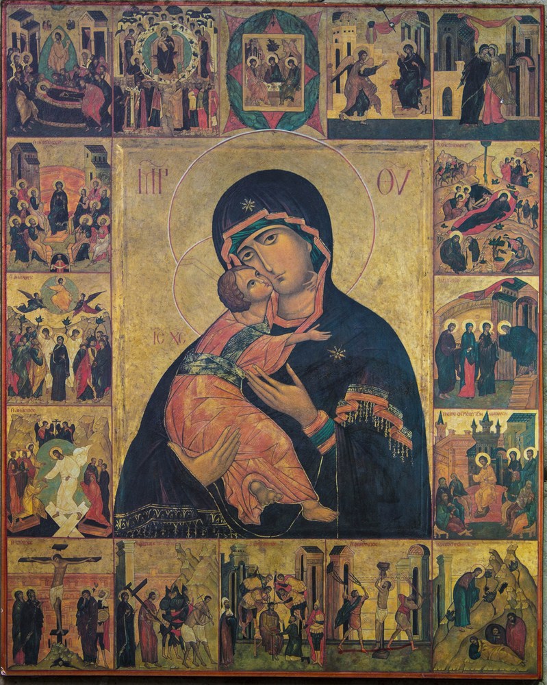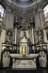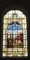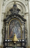 Icône de Notre-Dame de Vladimir surplombé d’une Hospitalité d’Abraham et entourée dans l’ordre horaire des Quinze Mystères du rosaire. L’église est en effet la paroisse des Catholiques Polonais de Bruxelles.