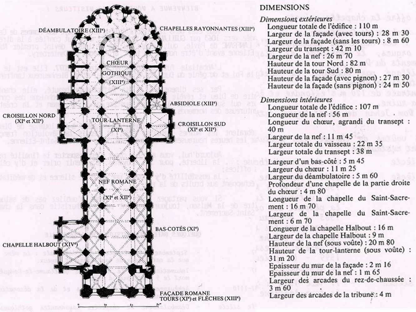 ► D’abord église romane au XI, on la reconstruit en commençant par le cœur au XIII puis témoin d’une transition de styles on construit sa fameuse tour-clocher gothique de 80m. en 1308 – 1330, puis on refait sa façade en rayonnant en 1384. Par la suite, on refait la nef en flamboyant au XV et entre 1518 et 1550 c’est au tour de l’abside፧ et des cinq chapelles d’arborer un style renaissance : on remplace donc son chevet par celui que l’on peut observer actuellement, second élément extérieur permettant d’identifier à coup sur cet édifice.