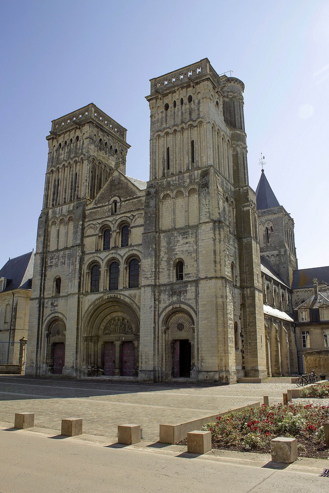 ► Fondée entre 1062 et 1090 par Guillaume le Conquérant en même temps que l’Abbaye aux Dames, l’Abbaye bénédictine aux Hommes est dédié à saint Étienne. L’abbatiale, dans laquelle est inhumé Guillaume le Conquérant depuis 1087 est construite entre 1065 et 1083 et dédicacée le 13 septembre 1077. De 1316 à 1344, on agrandit le chœur en gothique, superposant ainsi ce dernier au roman et on ajoute une abside፧ et des chapelles rayonnantes. Les huguenots pillent l’abbaye en 1562 dont le tombeau de Guillaume et la tour-lanterne s’écroule en 1566 emportant avec elle une partie de l’édifice alors laissé aux intempéries. On reconstruit l’abbatiale entre 1606 et 1626. En 1663, les mauristes s’installent dans l’abbaye, entreprennent des réformes et reconstruisent les bâtiments conventuels en 1704 – 1764.