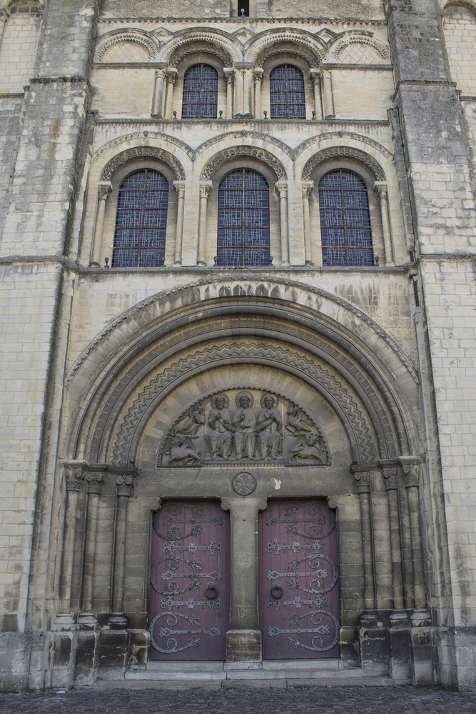 Façade vue de face avec son tympan de 1862 représentant la trinité et le tétramorphe, on distingue en dessous, un sceau frappé d’un chrisme.