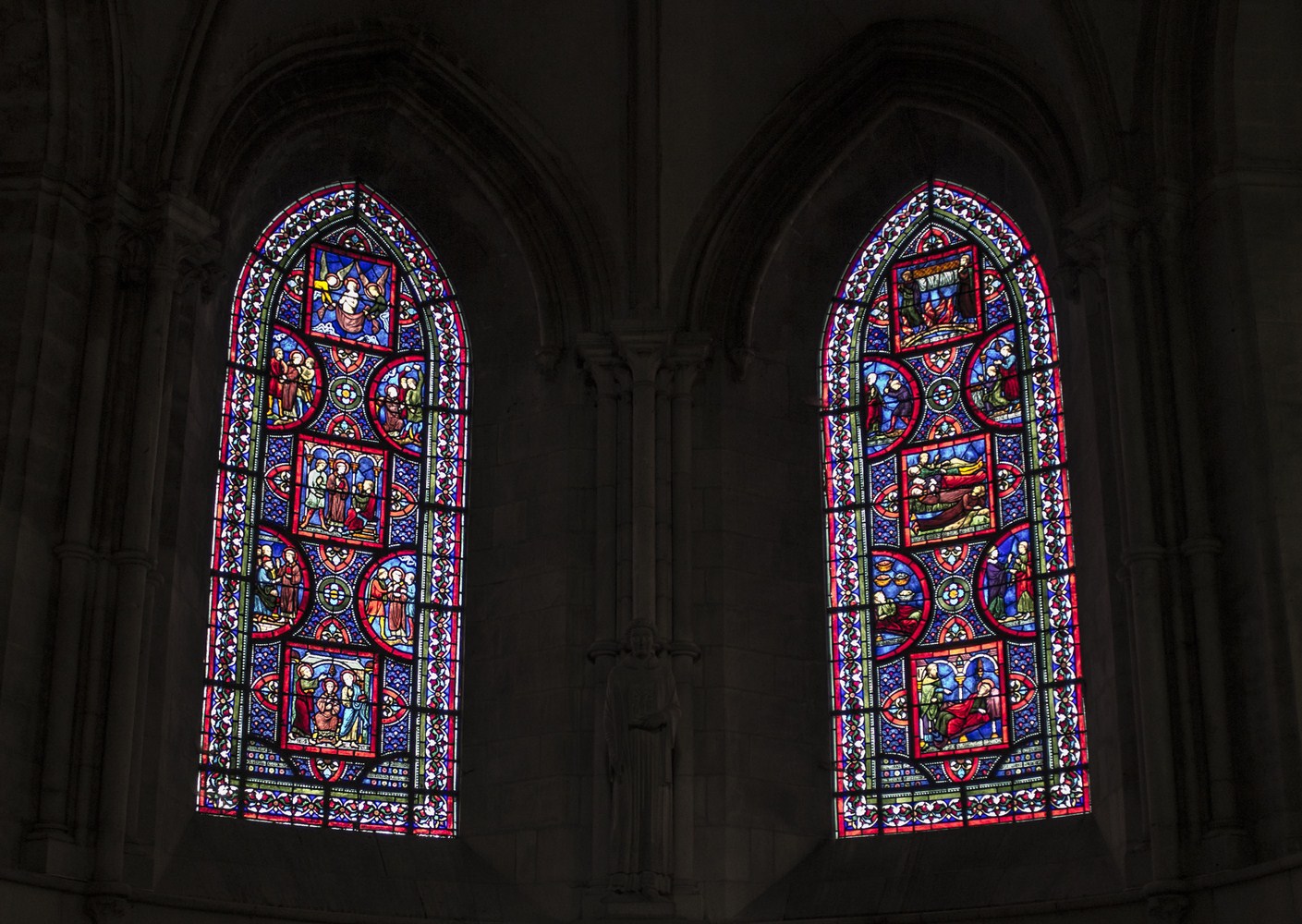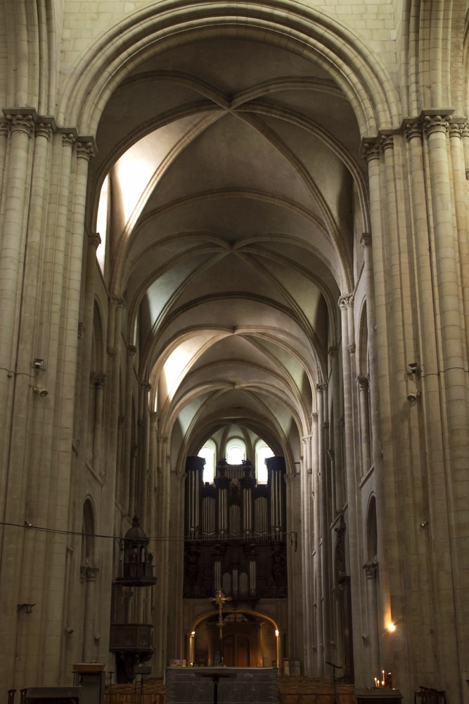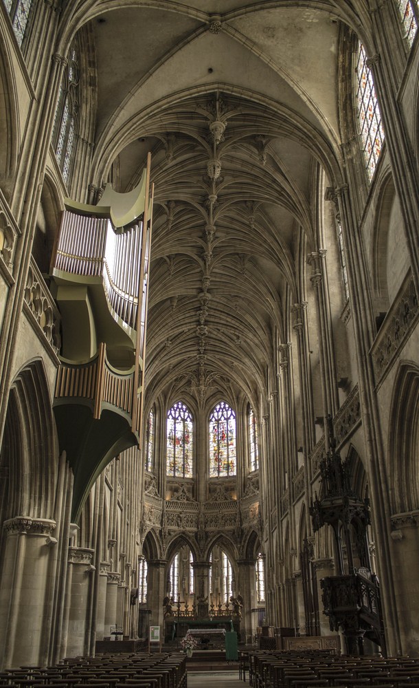 ► Les voûtes à clés pendantes des travées du XIII qui sont les plus profondes ont été installées au XVI. Temple de la raison entre 1793 – 1795, elle est rendue au culte en 1795. En 1825 on tente de restaurer les portails qui furent en 1562, abîmées par les huguenots qui détruisirent également, jubé, statues et orgue. Sévèrement touchée comme le reste de la ville par les bombardements alliés en 1944, la flèche du clocher s’écroule, détruisant la nef dans sa chute. Les travaux n’ont lieu qu’en 1952 – 1957 et ainsi ses vitraux sont tous modernes de même que l’orgue.