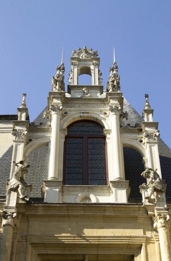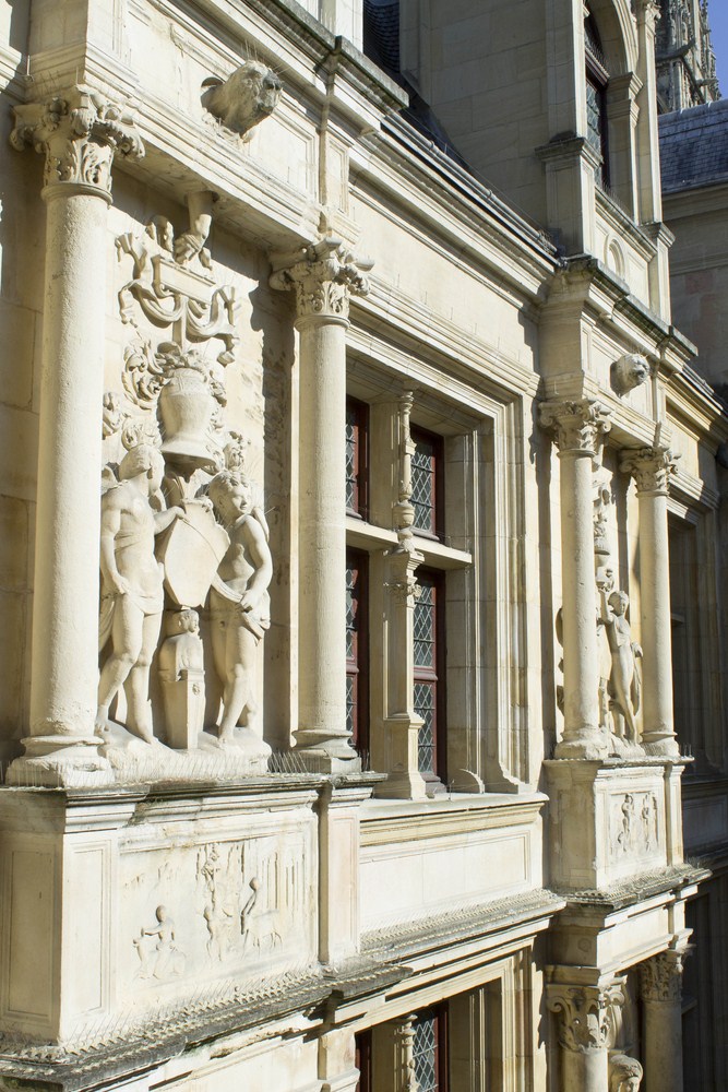 Sur les hauteurs du logis principal, deux écus portés par des nymphes et des génies, on distingue en outre deux scènes sur les linteaux du dessous : L’Enlèvement d’Europe et La Libération d’Andromède.