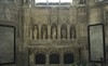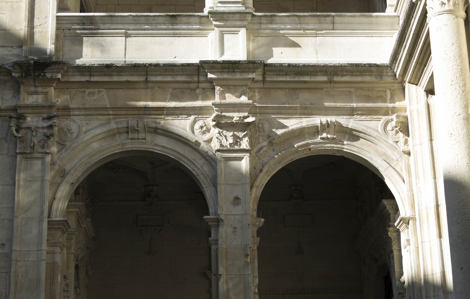 Arcades et sculptures du coté ouest de la cour en haut de l’escalier qui mène à l’entrée.