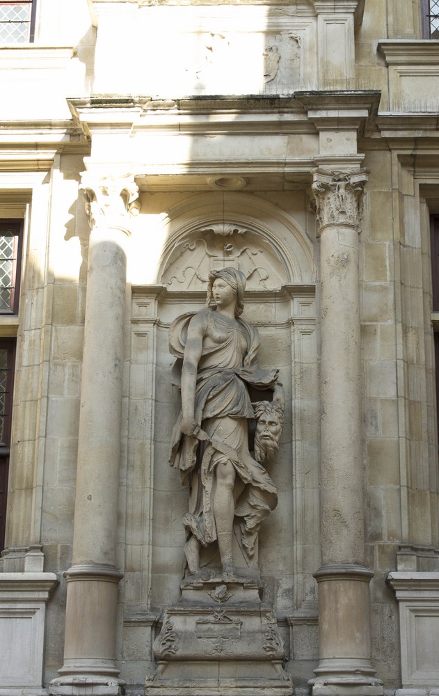Sous les écus, on trouve des statues de Judith avec la tête d’Holopherne et David tenant la tête de Goliath.