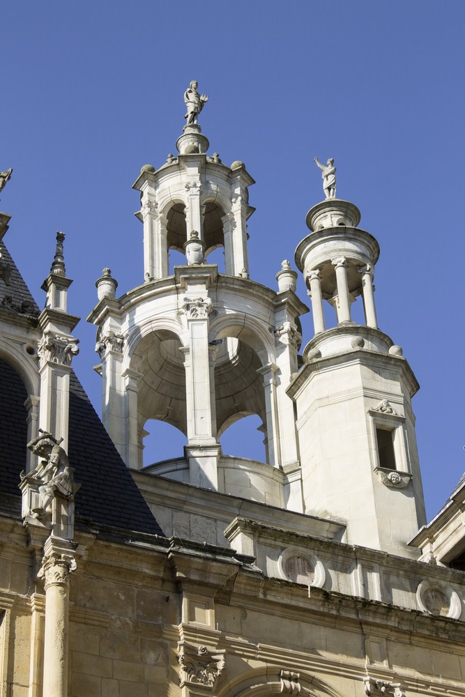 Les hauteurs du coté ouest de la cour où trônent Apollon et Marsyas sur des lanterneaux qui nous rappellent la forme de l’athanor.