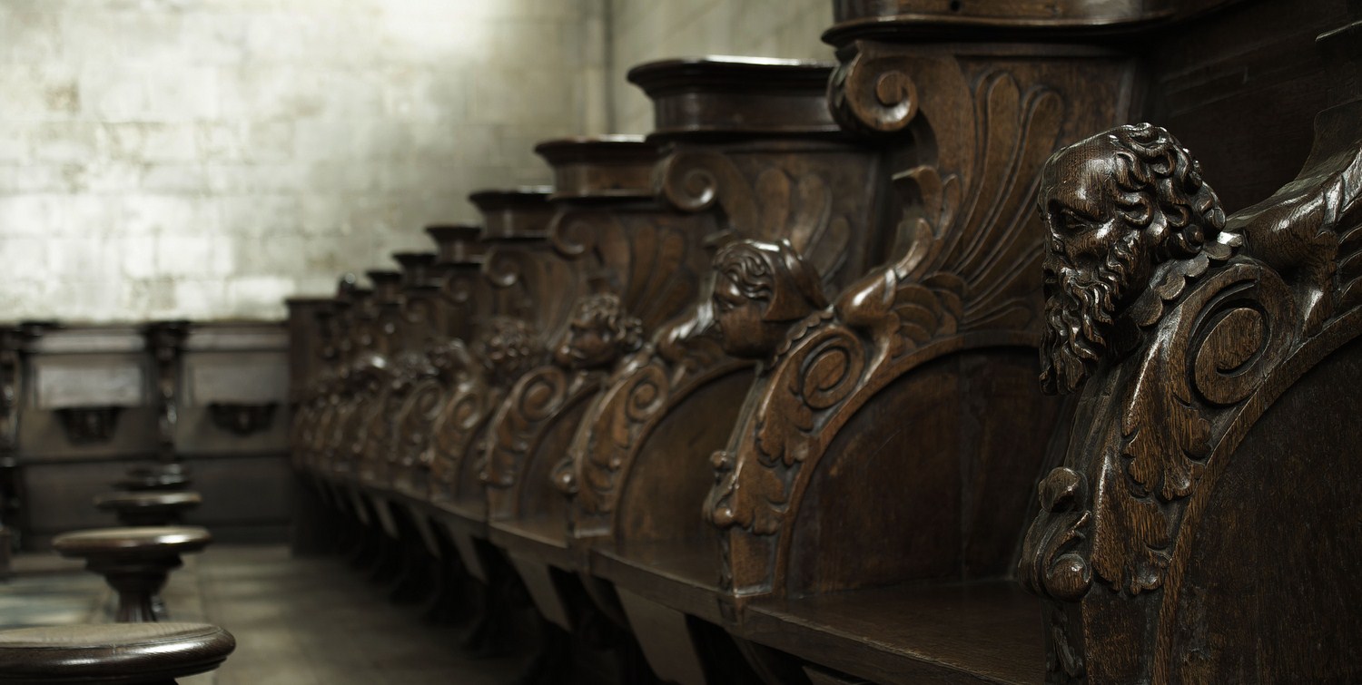 1. La nef avec à gauche l’orgue moderne de 1997 et à droite la chaire à prêcher néogothique du XIX. Au fond, le chœur et sa clef pendante.