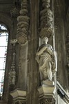 De nombreuses statues sont présentes dans le déambulatoire፧ : trois apôtres et saint Louis de Gonzague portant une branche de lys.