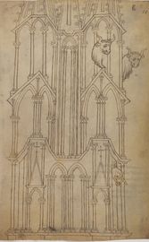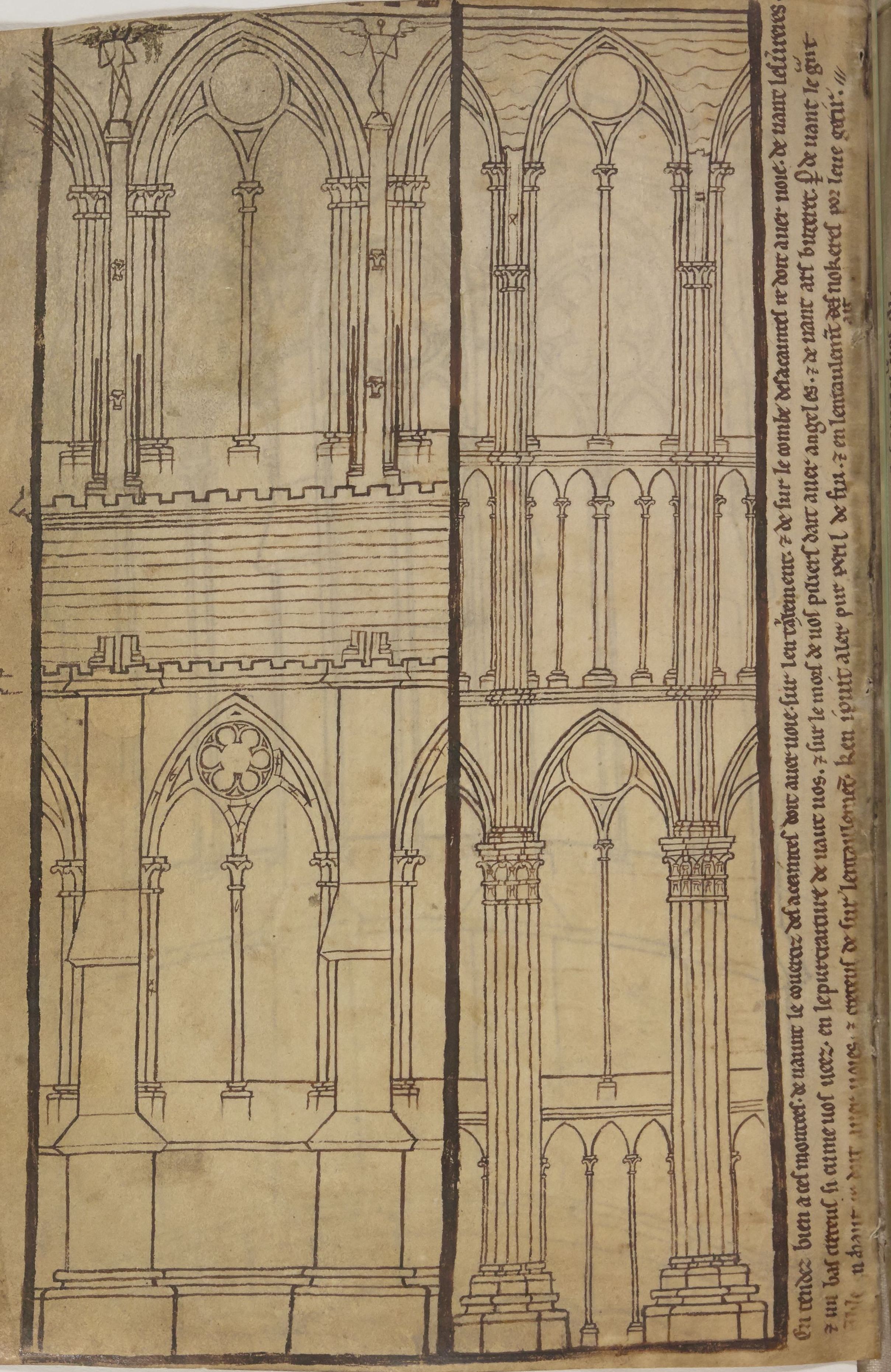 Note : Autres élévations intérieure et extérieure des murs latéraux de la cathédrale de Reims. Entendez bien a ces montées. Devaunt le covertiz des açaintes doit aver voie sur l’entavlement, et desur le combe des açaintes redoit aver voie devant les verreres, et un bas creteus, si cume vos veez en le purtraiture devant vos, et sur le mois de vos piliers dait aver angeles, et devant ars buteret. Par devant le grant conble en haut redoit aver voies et creteus desur l’entavlement, k’en i puit aler pur péril de fui ; et en l’entavlement ait nokeres por l’eve getir ; pur les capeles le vos di.