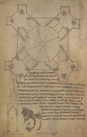Note : Plan de la tour de la cathédrale de Laon. J’ai esté en mult de tieres, si con vos porés trover en cest livre, en aucun liu onques tel tor ne vi com est cele de Loon. Vès ent ci le premier esligement, si con des premieres fenestres. A cest esligement est li tors tornée a VIIJ. arestes ; s’en sont les IIIJ. filloles quarées, seur colonbes de trois ; puis si vienent arket et entavlemens ; se resunt les filloles parties a VIIJ. colonbes, et entre IJ. colonbes saut uns bués, puis viennent arket et entaviemens. Par deseure sunt li conble a VIIJ. crestes ; en cascune espase a une arkiere por avoir clarté. Esgardés devant vos ; s’en vereis mult de le maniéré et tote le montée, et si con les filloles se cangent ; et si penseiz, car se vos volés bien ovrer de toz grans pilers forkiés, vos covient avoir qui asés aient col. Prendés garde en vostre afaire, si ferés que sages et que cortois.