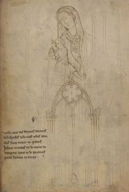 Note : Modèles de dessin. — Vierge assise. — Cerf. — Roi assis. — Batteur en grange. — Homme et femme debout. Chi commence le mate[re] de la portraiture. — Incipit materia porturature.