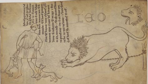 Note : Lion enchaîné à un piquet, et devant lui un dompteur, tenant deux petits chiens en laisse, avec des verges pour les fouetter. De l’ensaignement del lion vos vel ge parleir. Cil qui le lion doctrine, il a IJ. chaiaus. Qant il velt le lion faire faire aucune coze, se li comande. Se li lions groigne, il bat ses kaiaus, dont a li lions grant doutance ; qant il voit les kaiaus batre, se refraint son corage et fait ço c’on li comande. Et s’il est coreciés, sor ço ne paroil mie, car il ne feroit por nelui ne tort ne droit. Et bien saciés que cis lions fu contrefais al vif. — Léo.