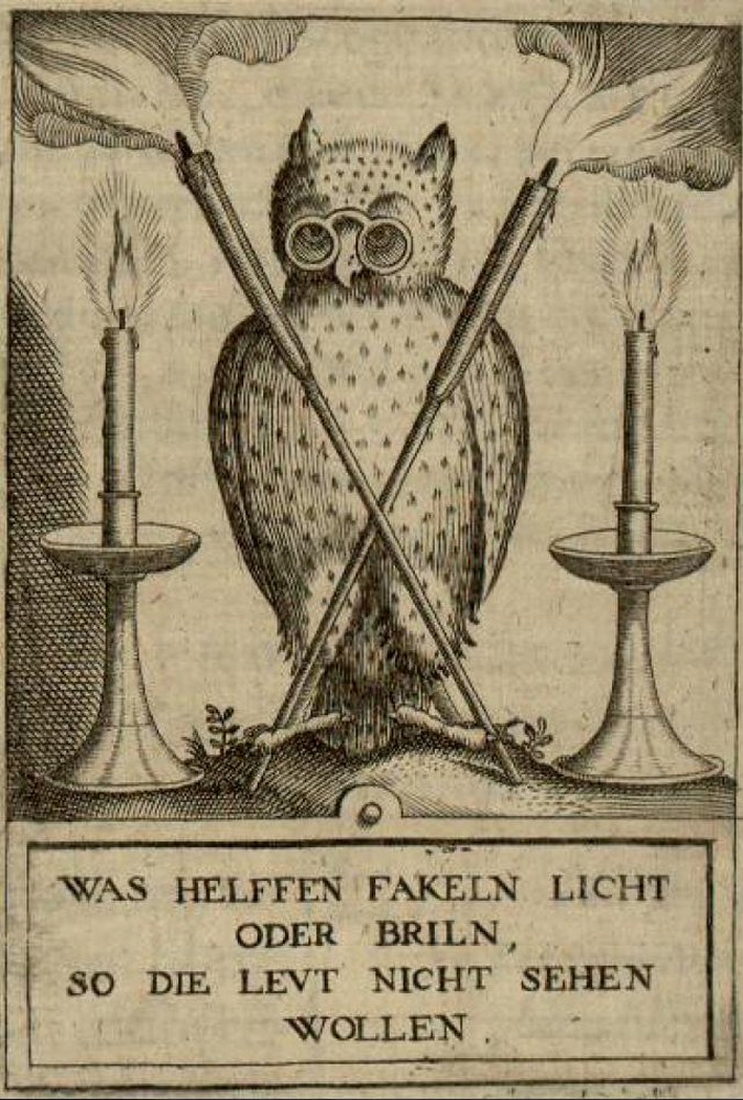 Note : Traduction libre du texte : À quoi servent flambeau et torches et bésicles, pour qui ferme les yeux afin de ne point voir ?