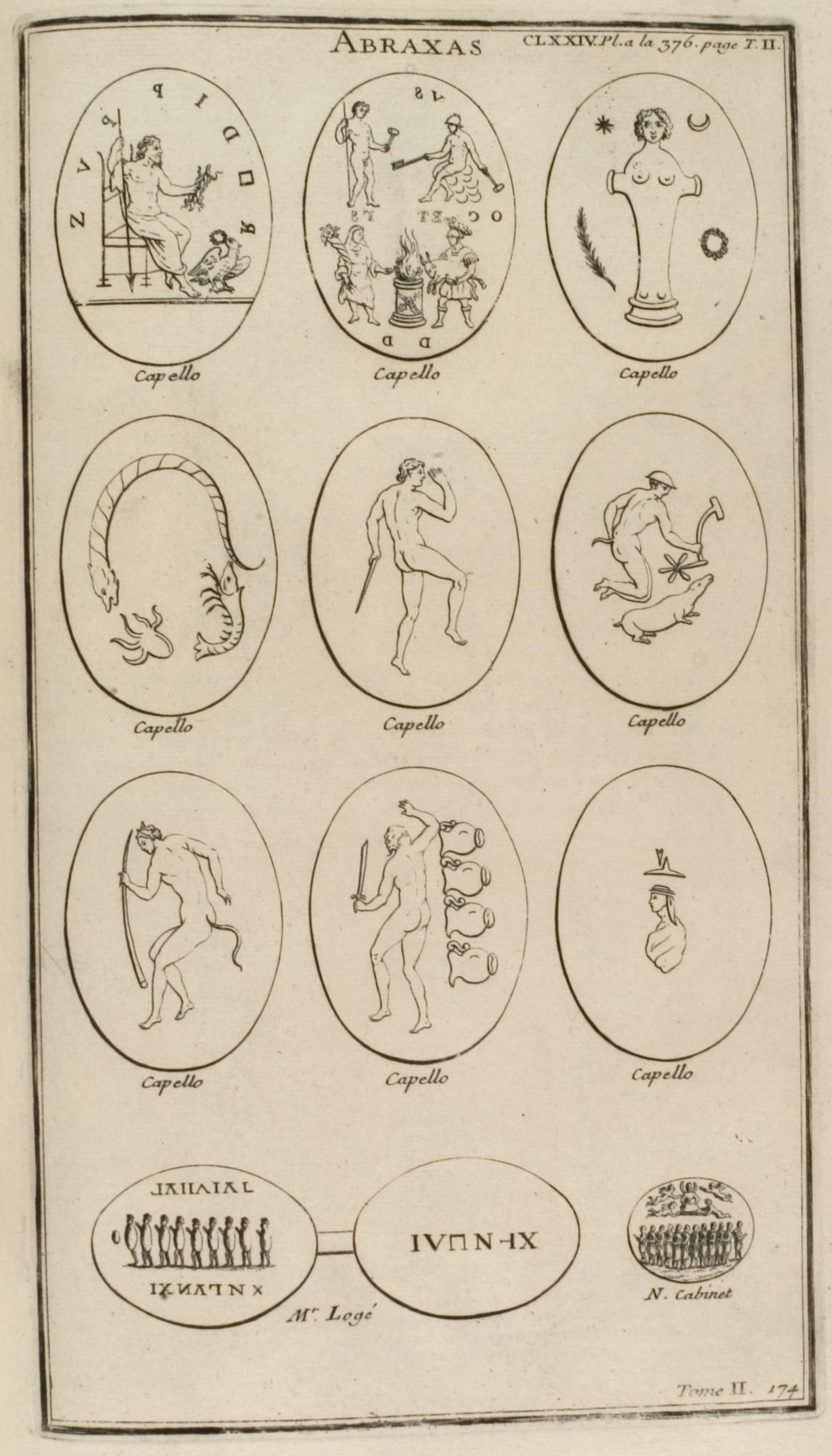 🕮 Dorbon-Aîné, ref.3140-3142 : Très bel exemplaire, dans sa reliure d’origine, de cet ouvrage remarquable, tant pour son texte que pour son illustration qui comprend 780 planches sur cuivre renfermant près de 30.000 figures. — Il se décompose ainsi : I. Les Dieux des Grecs et des Romains et des Héros parvenus à la divinité. — II. Culte des Grecs, des Romains ; Religion des Égyptiens, les Abraxas ; Religion des Arabes, des Syriens, des Perses, des Scythes, des Germains, des Gaulois, des Espagnols et des Carthaginois. — III. Usages de la vie (habits, ornements, chaussures, amulettes, chambres, meubles, viandes, ustensiles de cuisine, maisons de campagne, vases, poids et monnaies, symboles, noces, théâtres, bains, jeux du cirque, pêches, chasses, instruments de musique, etc.). — IV. La guerre, les habits militaires, les armes, les voitures, les grands chemins, les ponts, les aqueducs, la navigation. — V. Funérailles, tombeaux et mausolées, lampes, supplices. — En tête de l’ouvrage a été relié le prospectus-spécimen de publication.