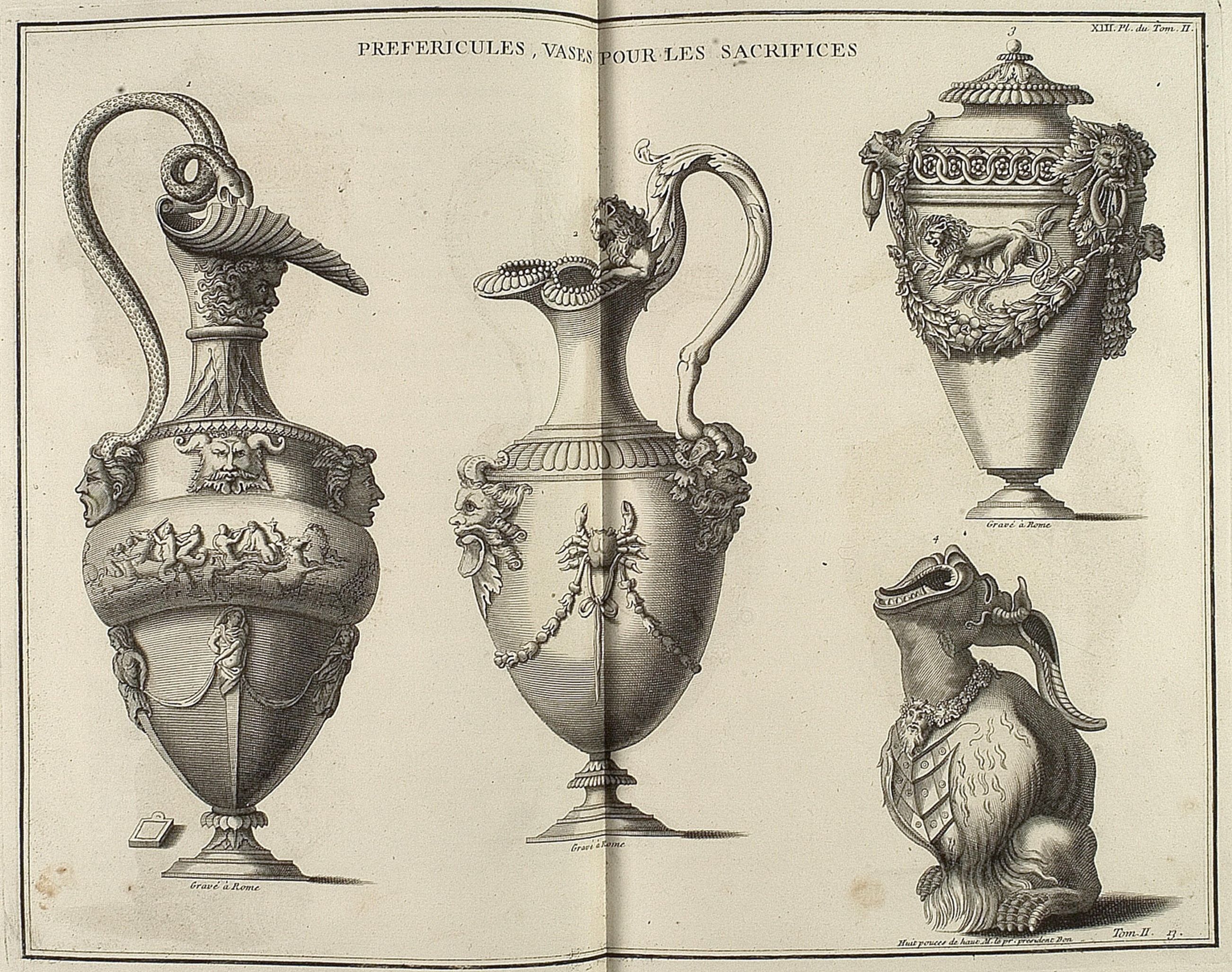 ► Monumental ouvrage en dix volumes(1), il présente au total plus de 1300 planches de qualité illustrant des œuvres d’art, des objets et des monuments de l’antiquité. Fort d’un surprenant succès pour un ouvrage de ce luxe, véritable musée de papier, ce brillant et exhaustif travail d’érudition antiquaire a étendu son importante influence jusque sur la formation de l’archéologie et de l’histoire de l’art. Il ouvre la marche au tout aussi important Recueil d’antiquités de Caylus.