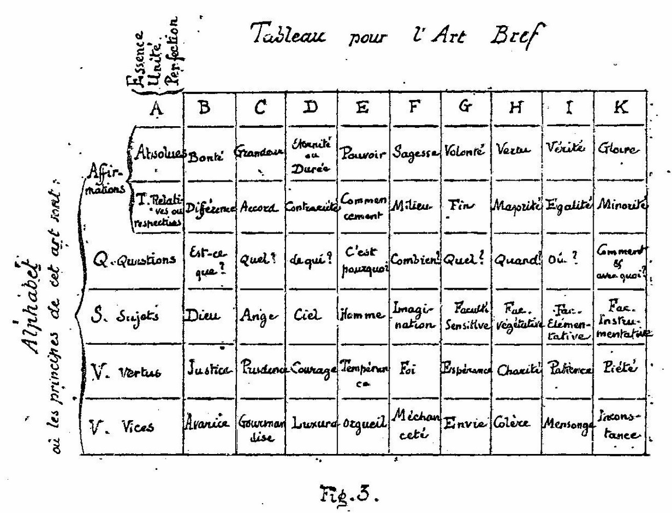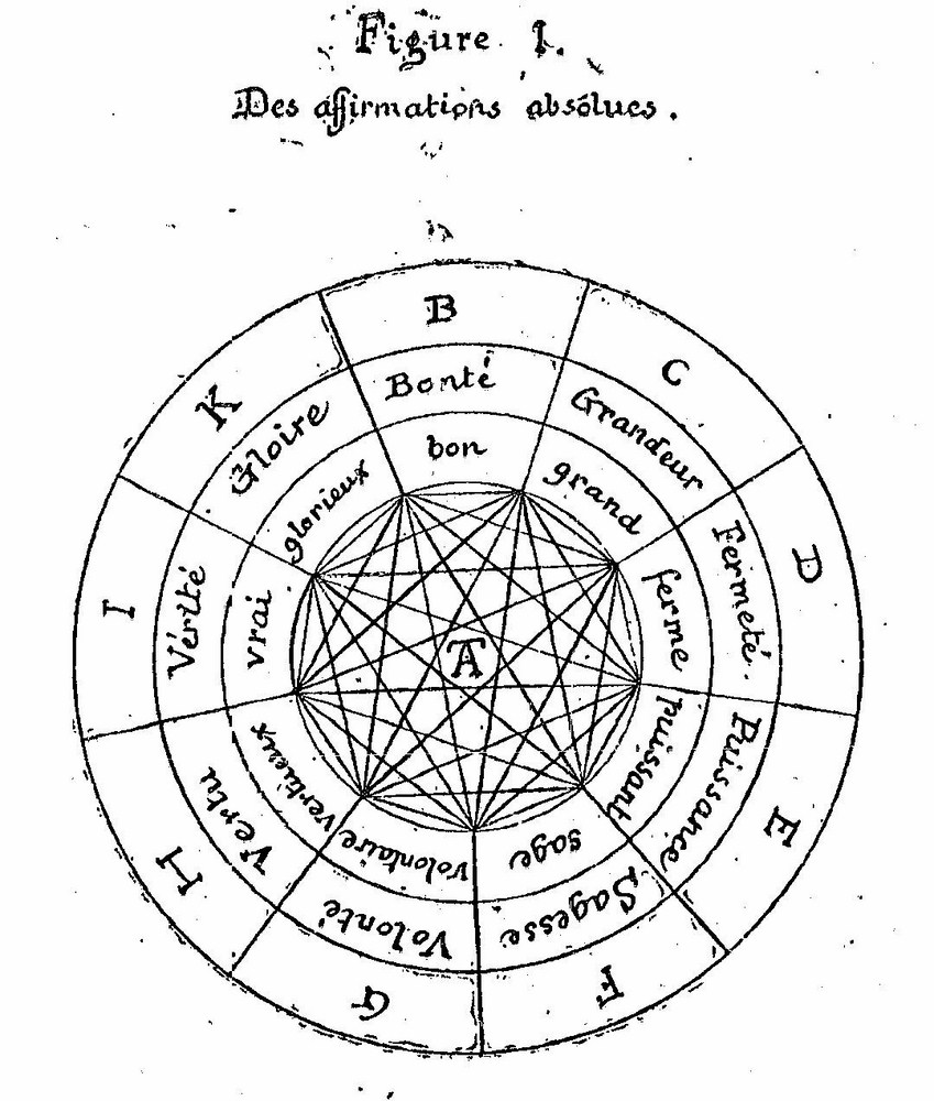 Utilité de l’alphabet. — Nous donnons un alphabet de cet art, pour pouvoir par son moyen faire des figures, et aussi mélanger les principes et les règles afin de rechercher la vérité, Car, au moyen d’une seule lettre ayant beaucoup de significations, l’entendement est plus général pouf examiner ces nombreuses significations, et même pour construire la science.