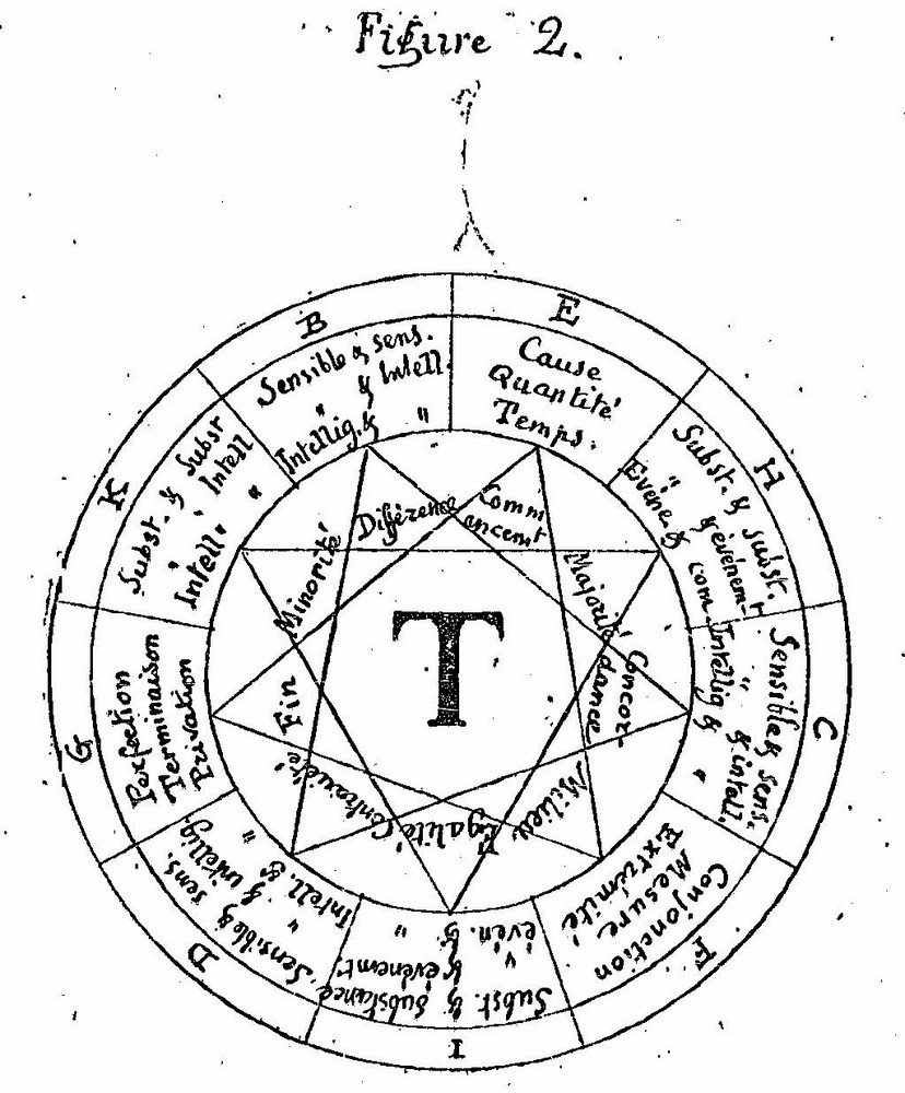 Condition. — La condition de la quatrième figure est que l’esprit applique les lettres qui paraissent le plus à propos pour le but proposé, et la chambre de trois lettres étant faite, qu’il tire des lettres leur signification en ayant égard à la convenance qui peut exister entre le sujet et l’affirmation, en évitant leur non convenance ; à cette condition l’esprit établit la connaissance au moyen de la quatrième figure, et reçoit beaucoup d’arguments pour la même conclusion.
