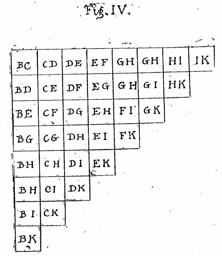 Cette figure est plus générale que la troisième, parce que dans une chambre quelconque de cette quatrième figure il y a trois lettres, alors que dans un chambre quelconque de la troisième figure il n’y a que deux lettres, c’est pourquoi l’esprit est plus général, par la quatrième figure que par la troisième.