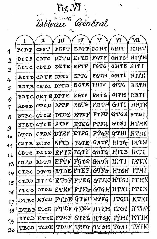 II. Autres révolutions. — Ensuite, les lettres se rencontrent avec B du même cercle supérieur, et D du cercle médian, et ainsi les autres du cercle médian et du cercle inférieur étant changées, le B du cercle supérieur restant immobile, jusqu’à ce que l’on parvienne avec B du cercle supérieur à l’I du cercle médian et au K du cercle inférieur ; on obtiendra deux cent cinquante deux chambres.