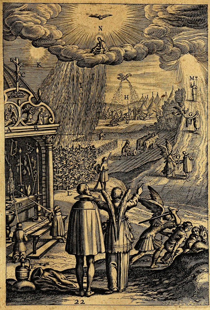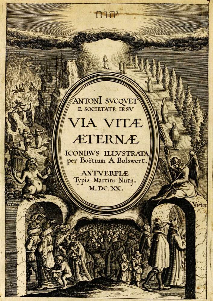 ► Orné de figures allégoriques et de conseils spirituels dans la lignée d’Ignace de Loyola (Antoine Sucquet est jésuite), ce célèbre ouvrage d’emblèmes à jouit d’un grand succès : il eut un grand nombre de rééditions et des traductions jusqu’en Europe de l’est.