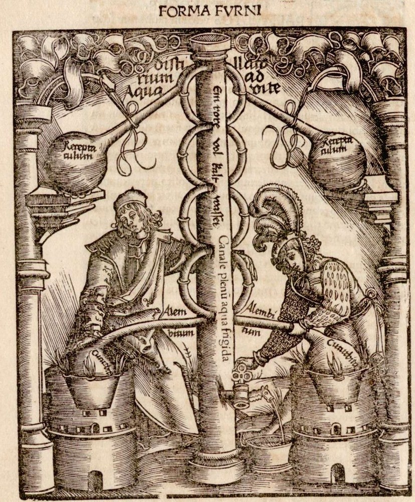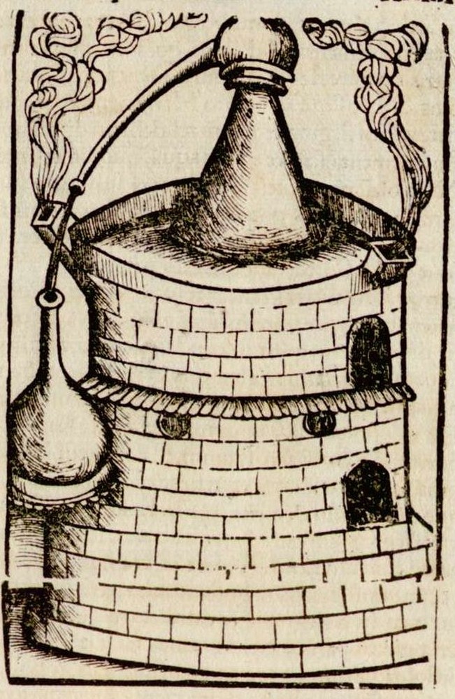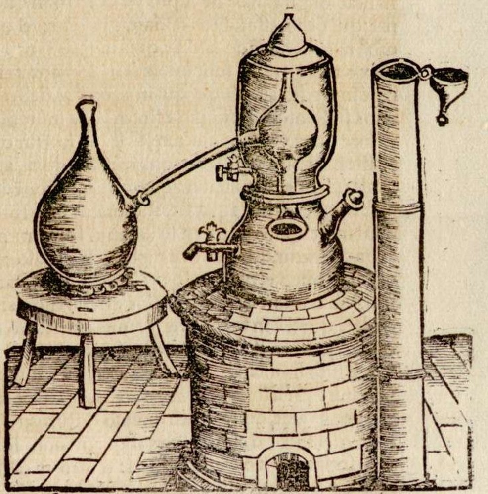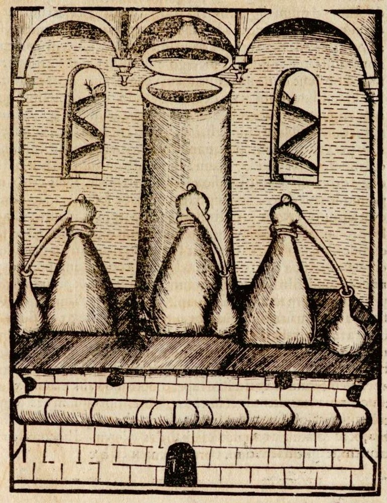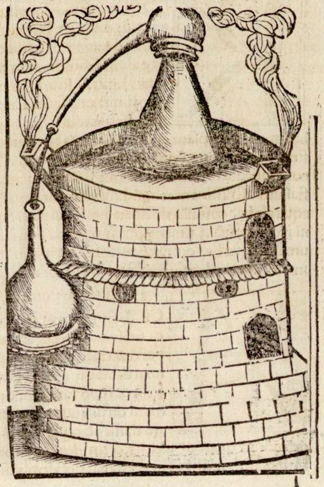 1. Cet ouvrage, encore plus rare dans la traduction française que dans l’édition originale latine de 1525, orné de nombreuses figures gravées sur bois représentant des fourneaux philosophiques, des cornues, des athanors et d’autres ustensiles employés par les alchimistes, constitue un traité complet de l’art distillatoire. Parmi les différentes espèces de distillations citées par l’auteur, l’on note la « distillation circulatoire » fort en usage au XVe siècle, mais abandonnée aujourd’hui. Ulstade loue les propriétés de l’Or potable et celles de l’eau-de-vie. Il nous donne, entre autres, la recette d’une liqueur, « Eau-de-vie de l’Empereur Frédéric troisiesme », fort goûtée des gourmets du Moyen Age.