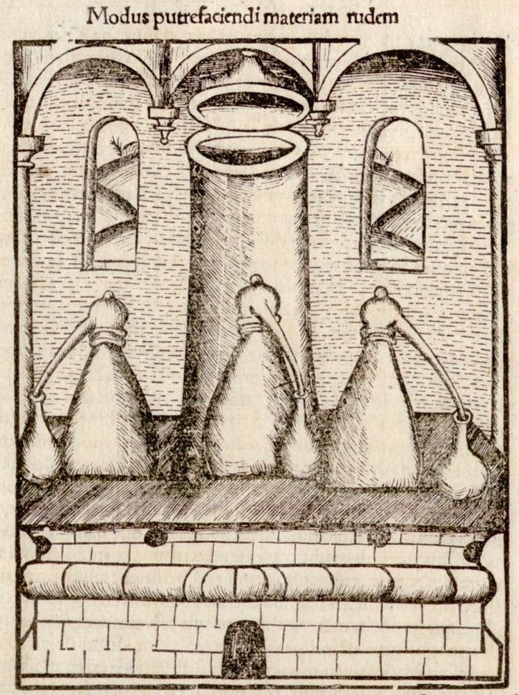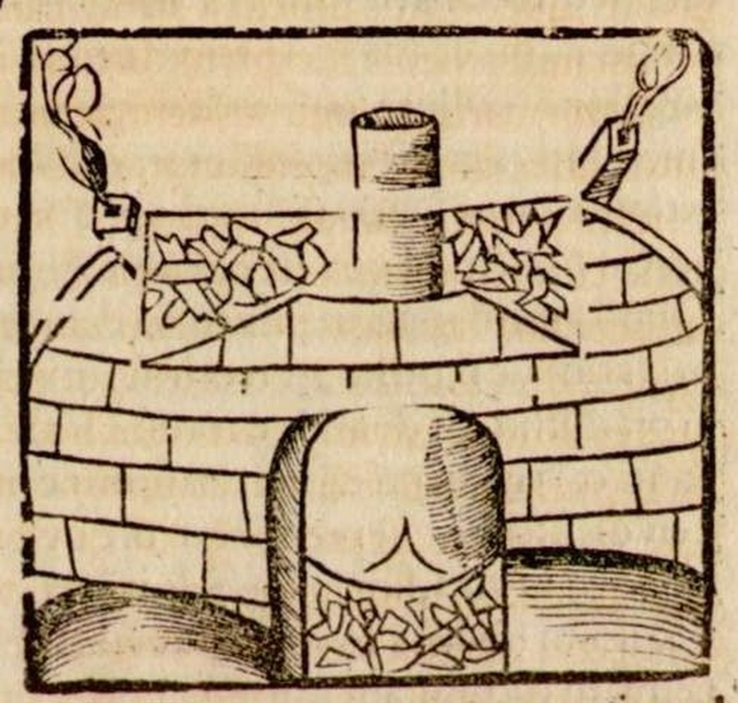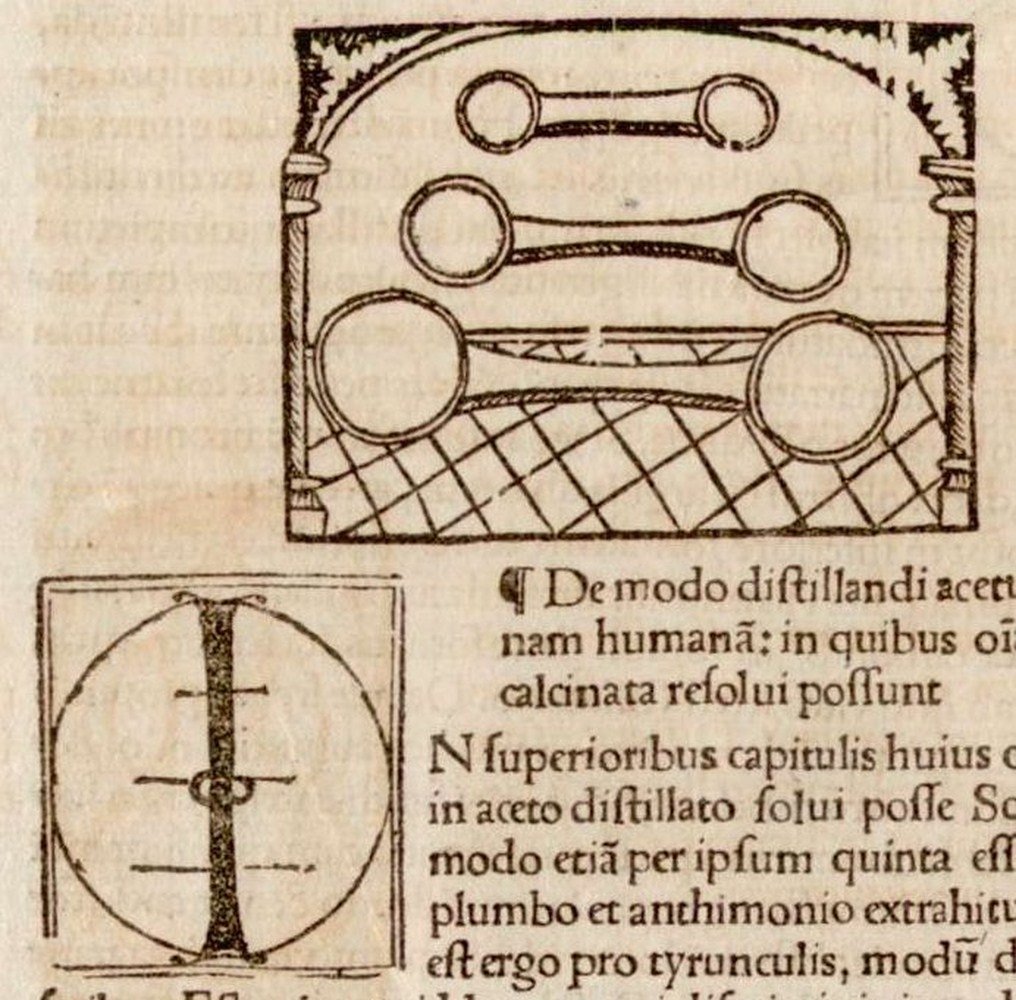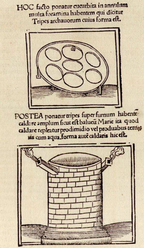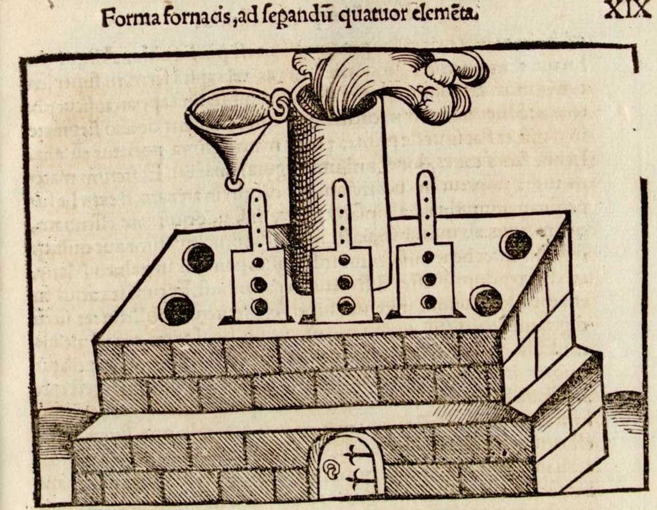 2. […] Le premier est orné, au titre, d’une figure symbolique et, dans le texte, de nombreuses gravures sur bois, dont 3 à pleine page, représentant des fourneaux philosophiques, des cornues, (des athanors et autres ustensiles employés par les alchimistes. La figure du « Forma Furni » est particulièrement curieuse.