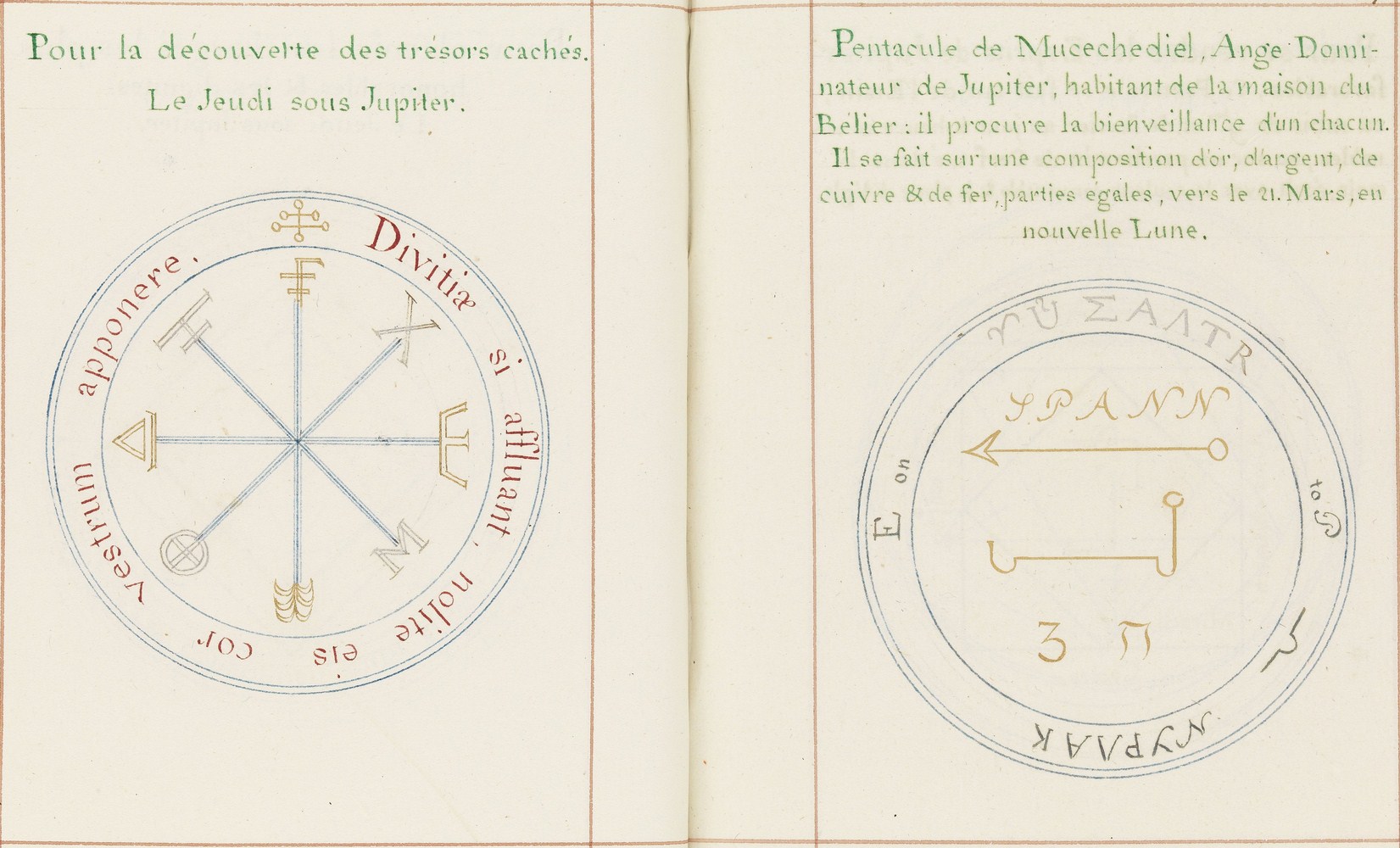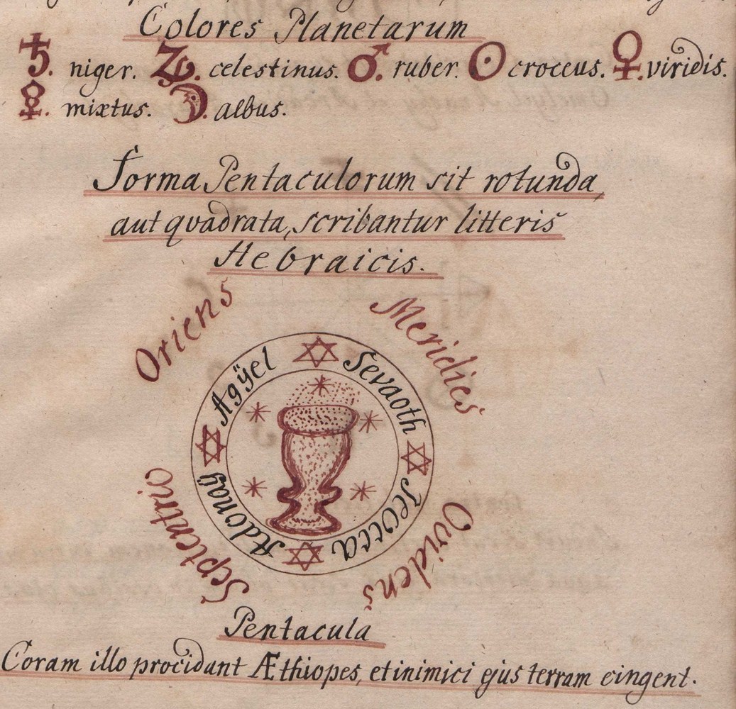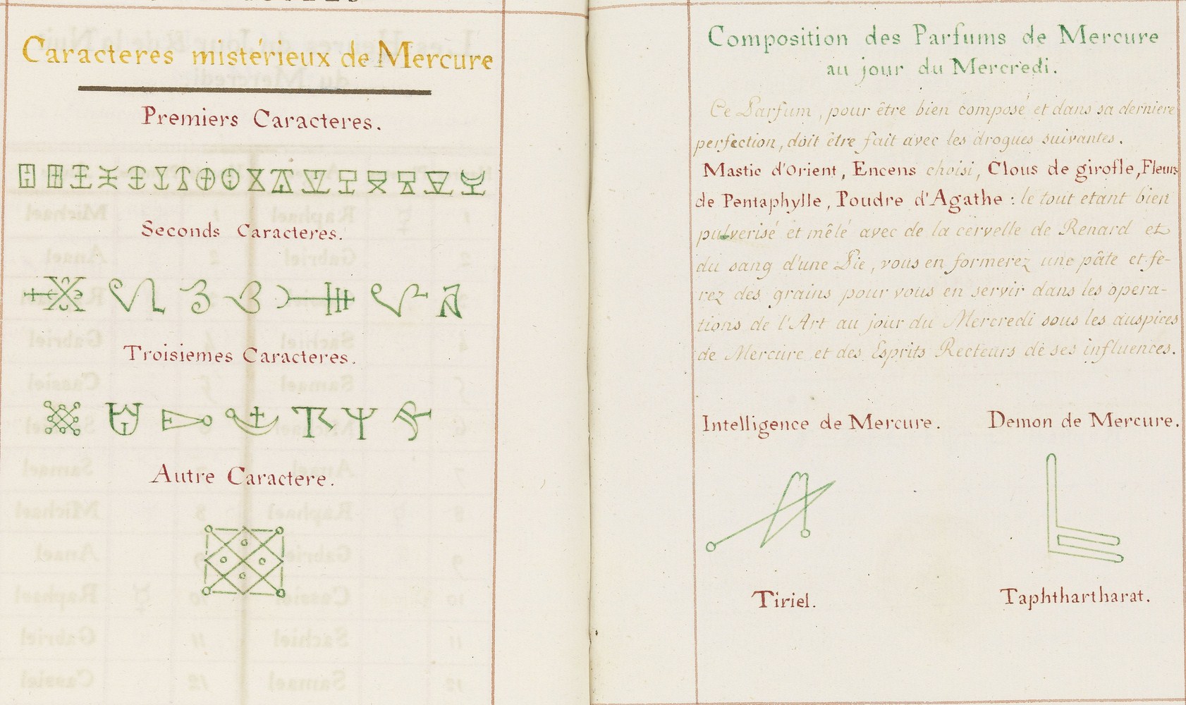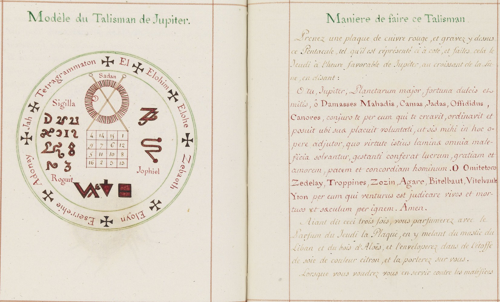 ► Le contenu de chaque ms. peut différer du tout au tout, néanmoins des thèmes récurrents reviennent, comme l’évocation d’esprits par le biais de la magie cérémonielle, la talismanie ou bien des recettes magiques telles qu’on peut les trouver dans les grimoires du type Albert.