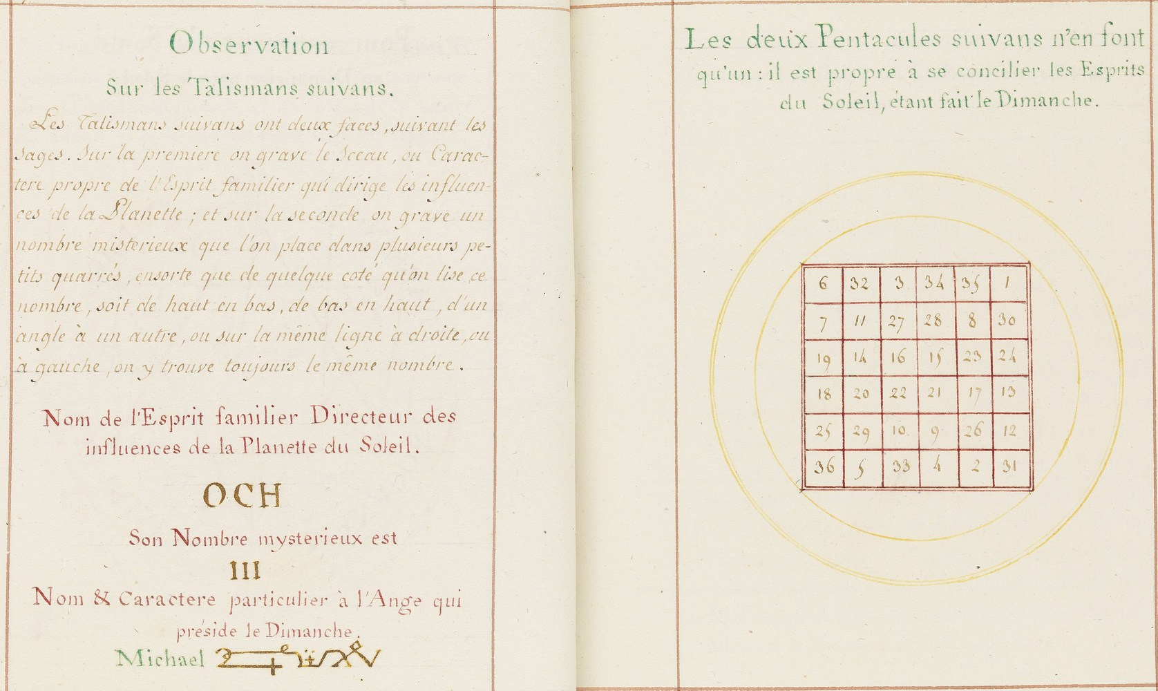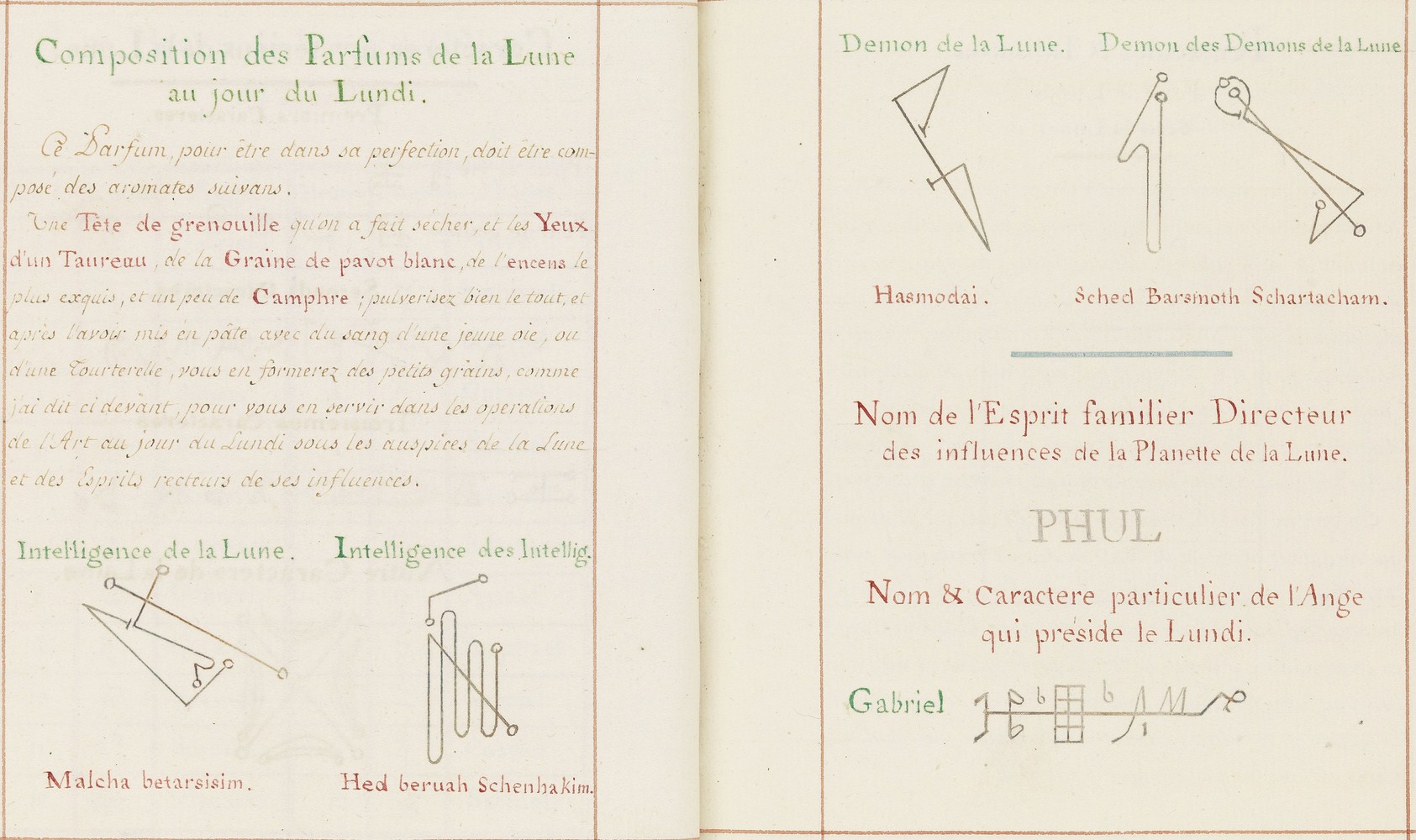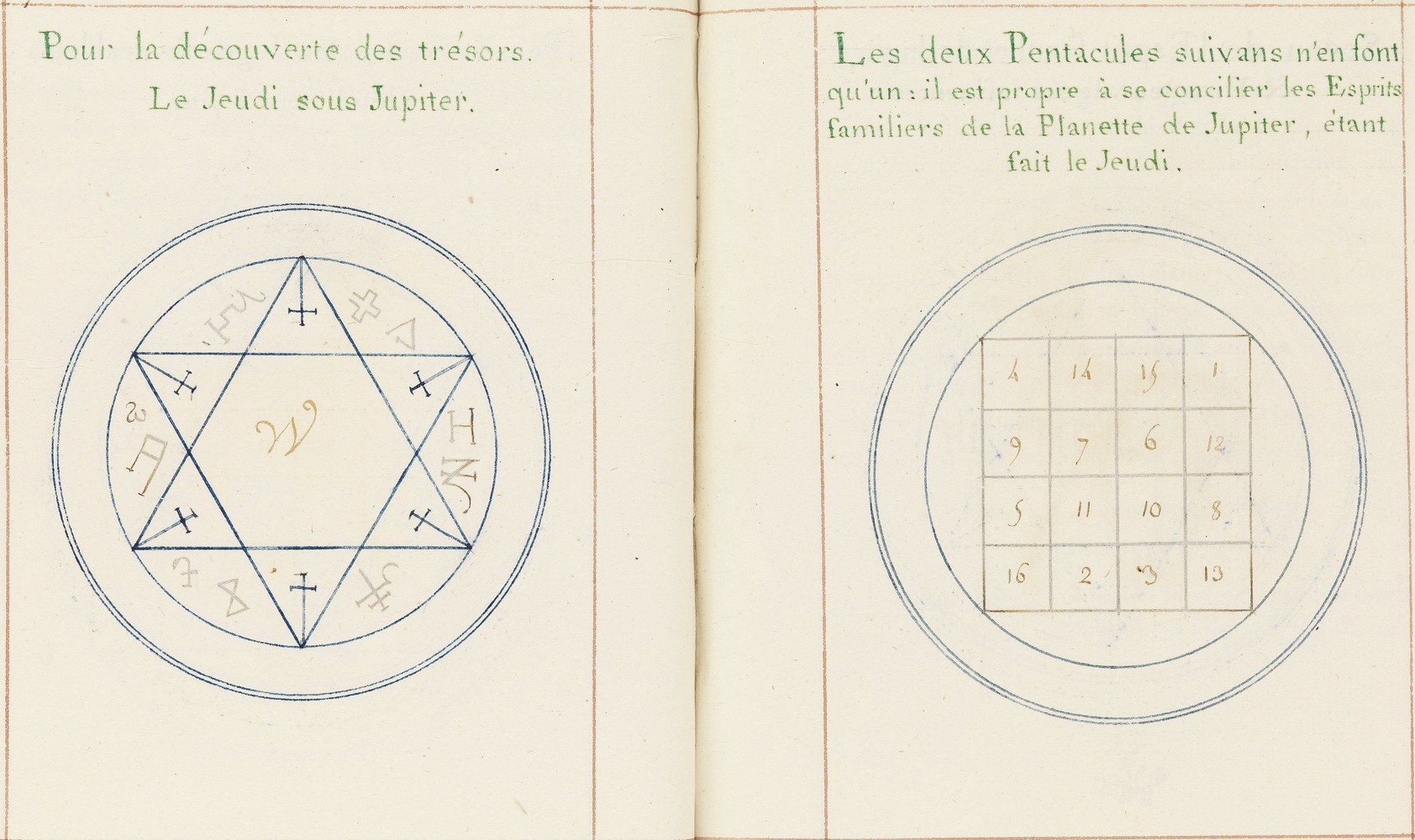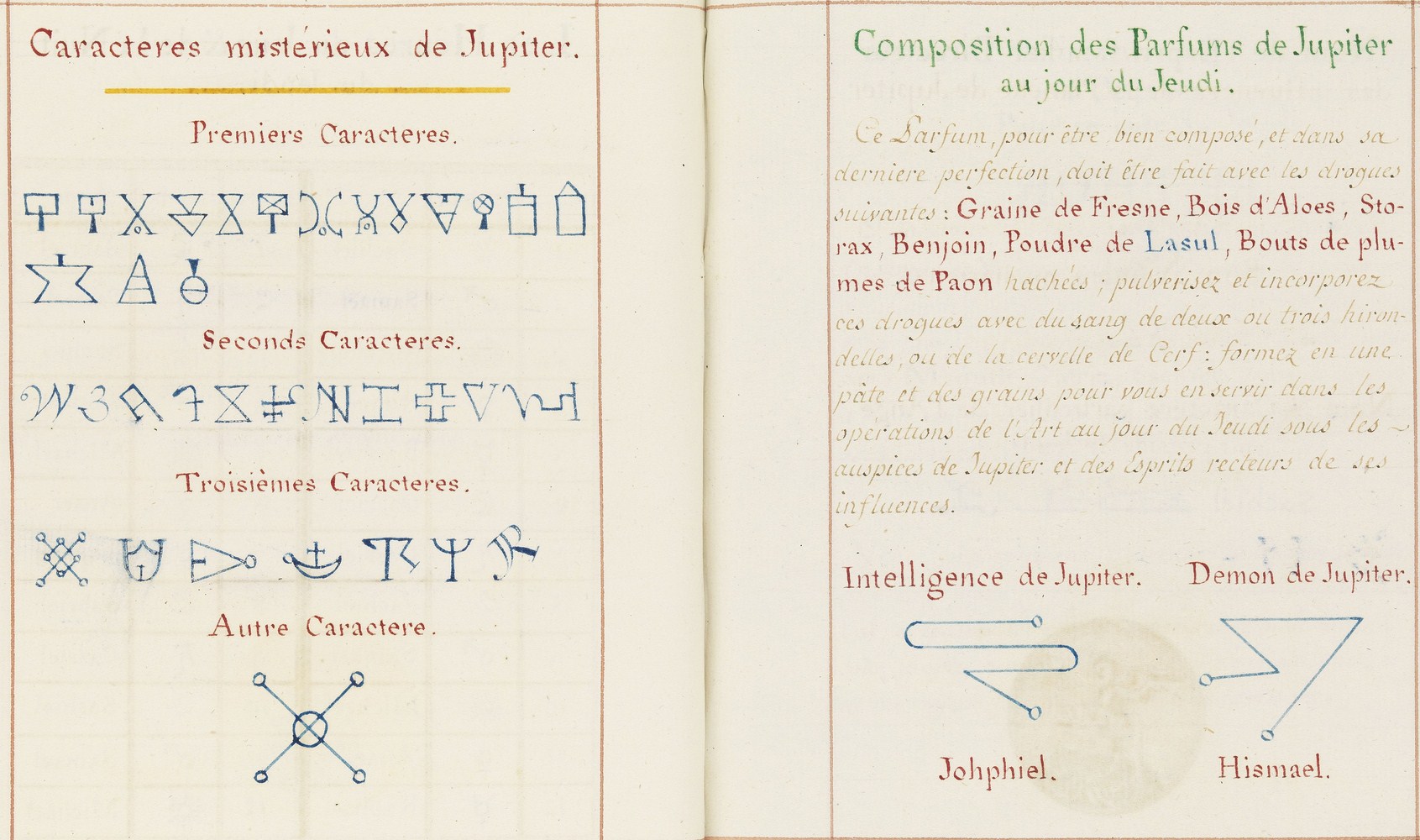 ► Le contenu de chaque ms. peut différer du tout au tout, néanmoins des thèmes récurrents reviennent, comme l’évocation d’esprits par le biais de la magie cérémonielle, la talismanie ou bien des recettes magiques telles qu’on peut les trouver dans les grimoires du type Albert.
