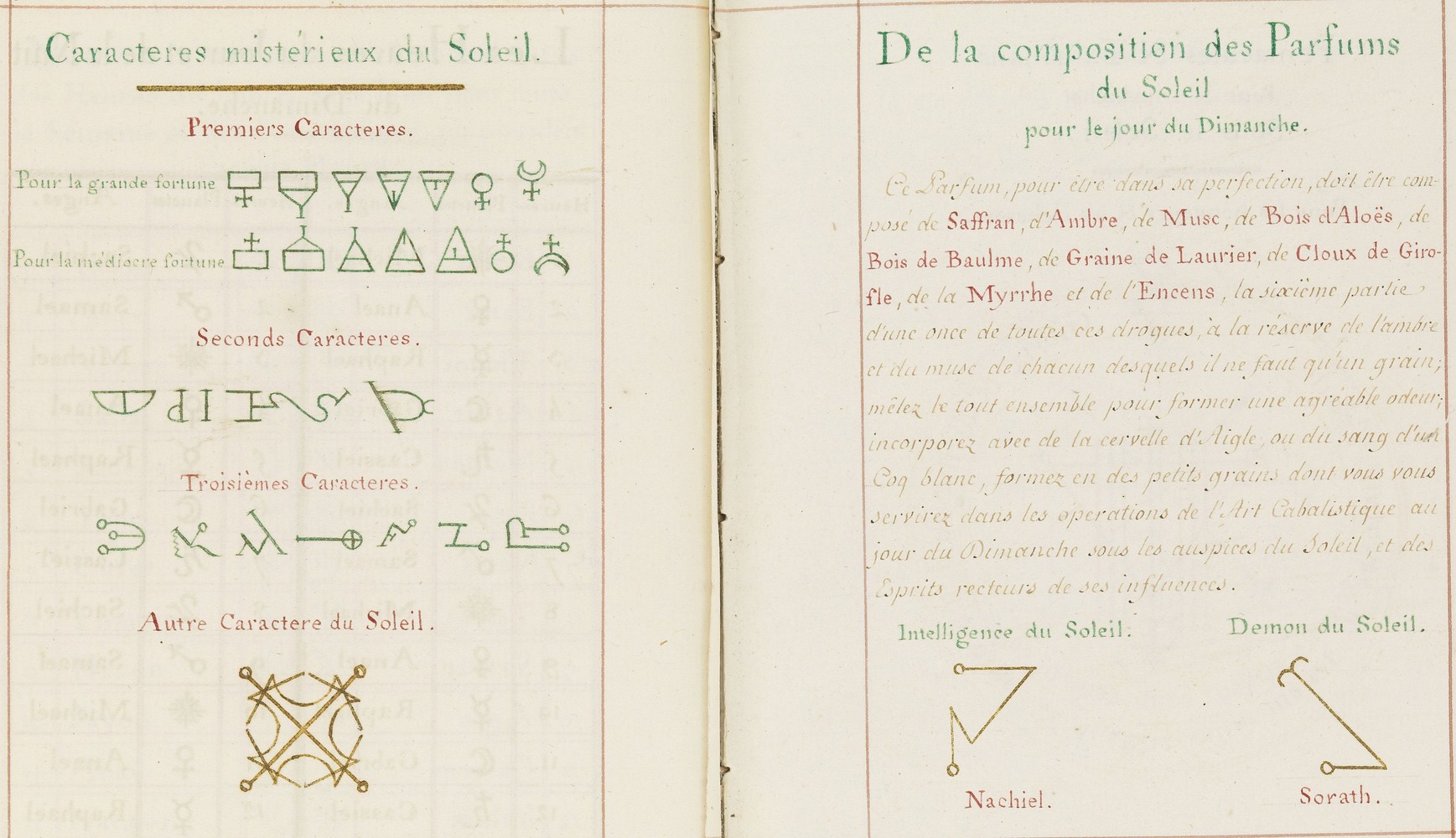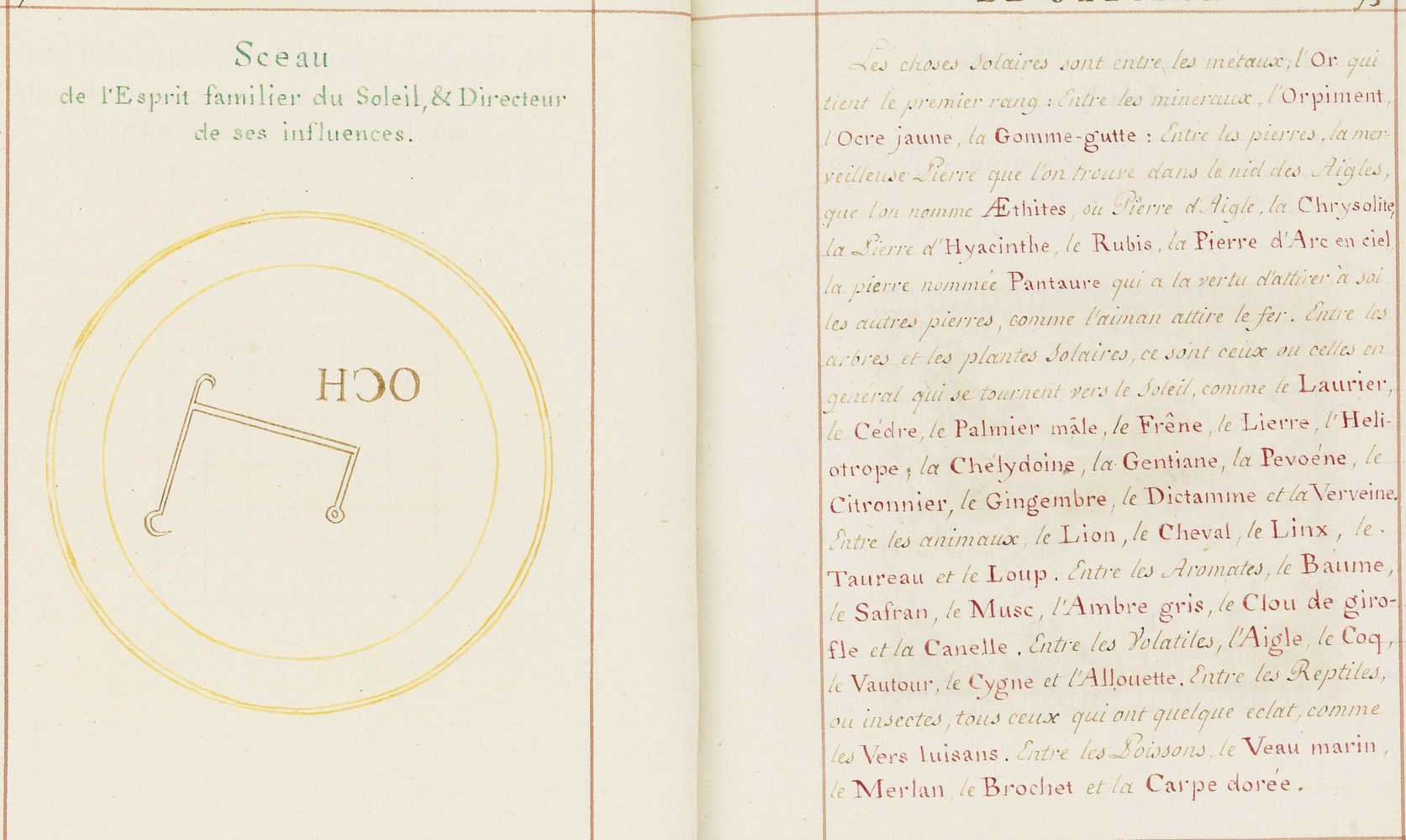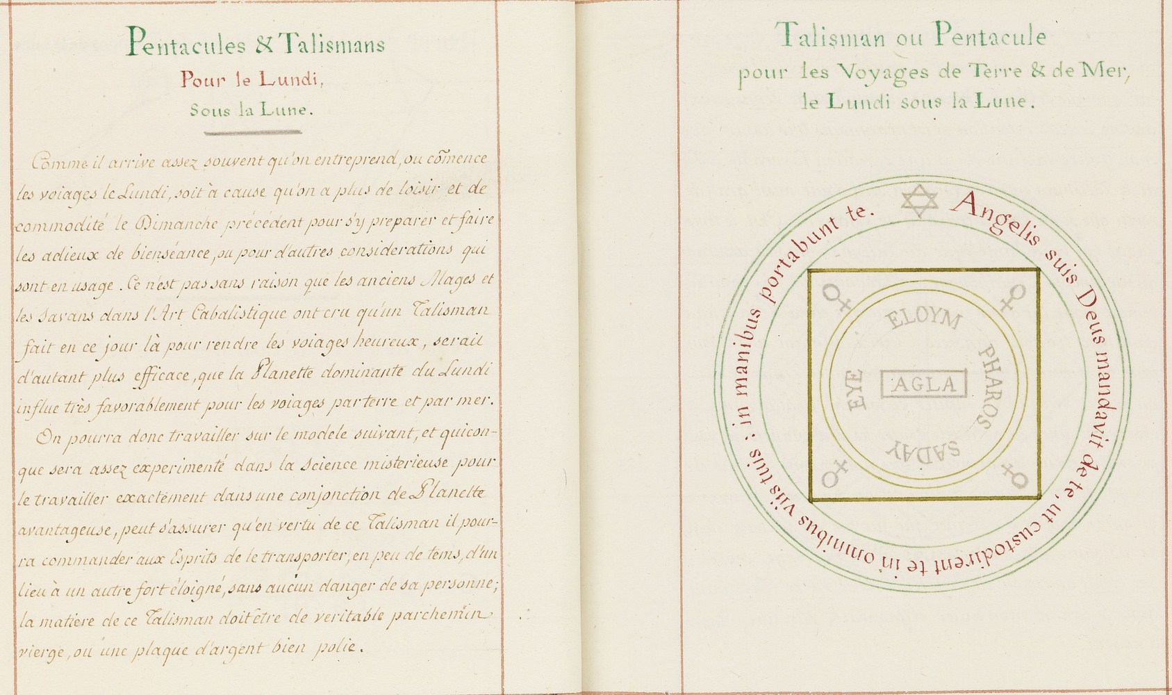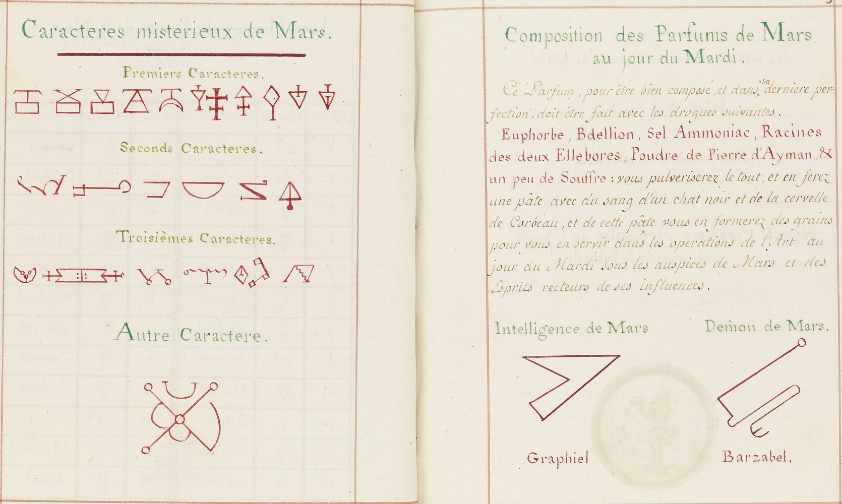 ► Le contenu de chaque ms. peut différer du tout au tout, néanmoins des thèmes récurrents reviennent, comme l’évocation d’esprits par le biais de la magie cérémonielle, la talismanie ou bien des recettes magiques telles qu’on peut les trouver dans les grimoires du type Albert.
