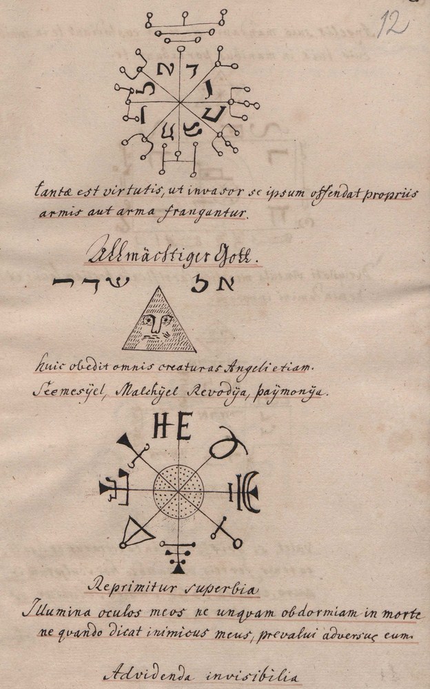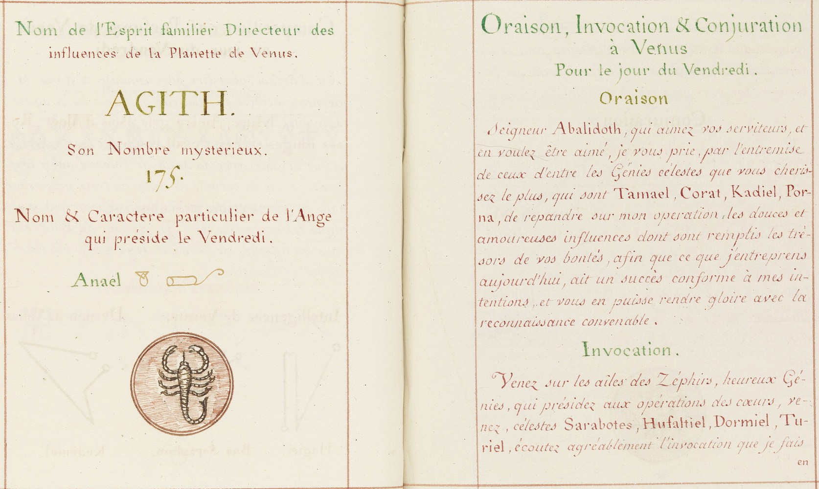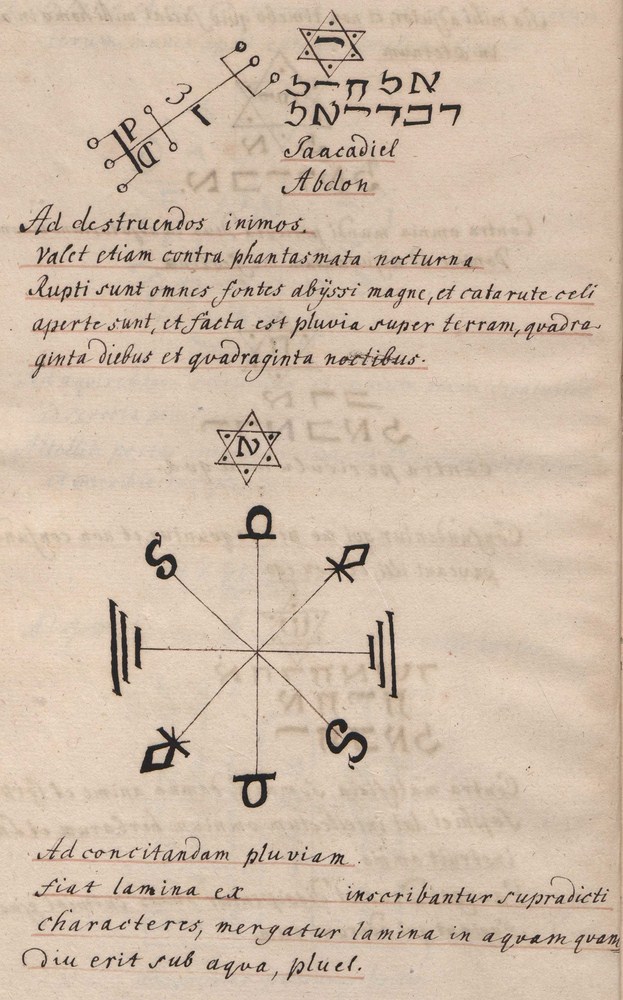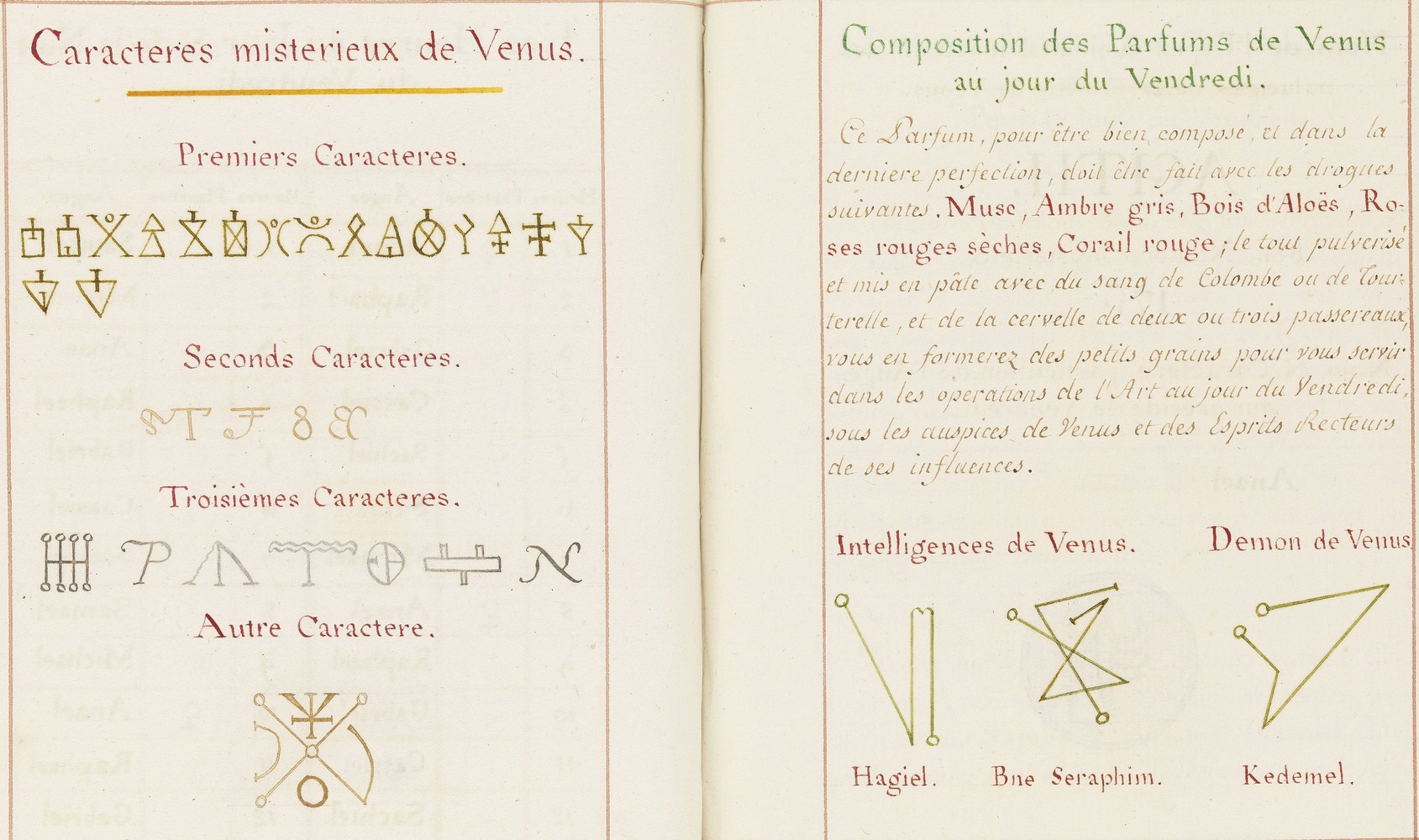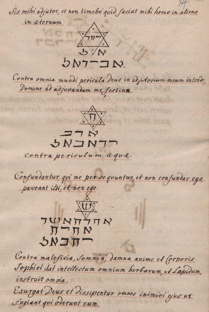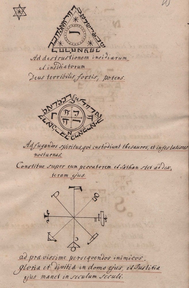 ► Le contenu de chaque ms. peut différer du tout au tout, néanmoins des thèmes récurrents reviennent, comme l’évocation d’esprits par le biais de la magie cérémonielle, la talismanie ou bien des recettes magiques telles qu’on peut les trouver dans les grimoires du type Albert.