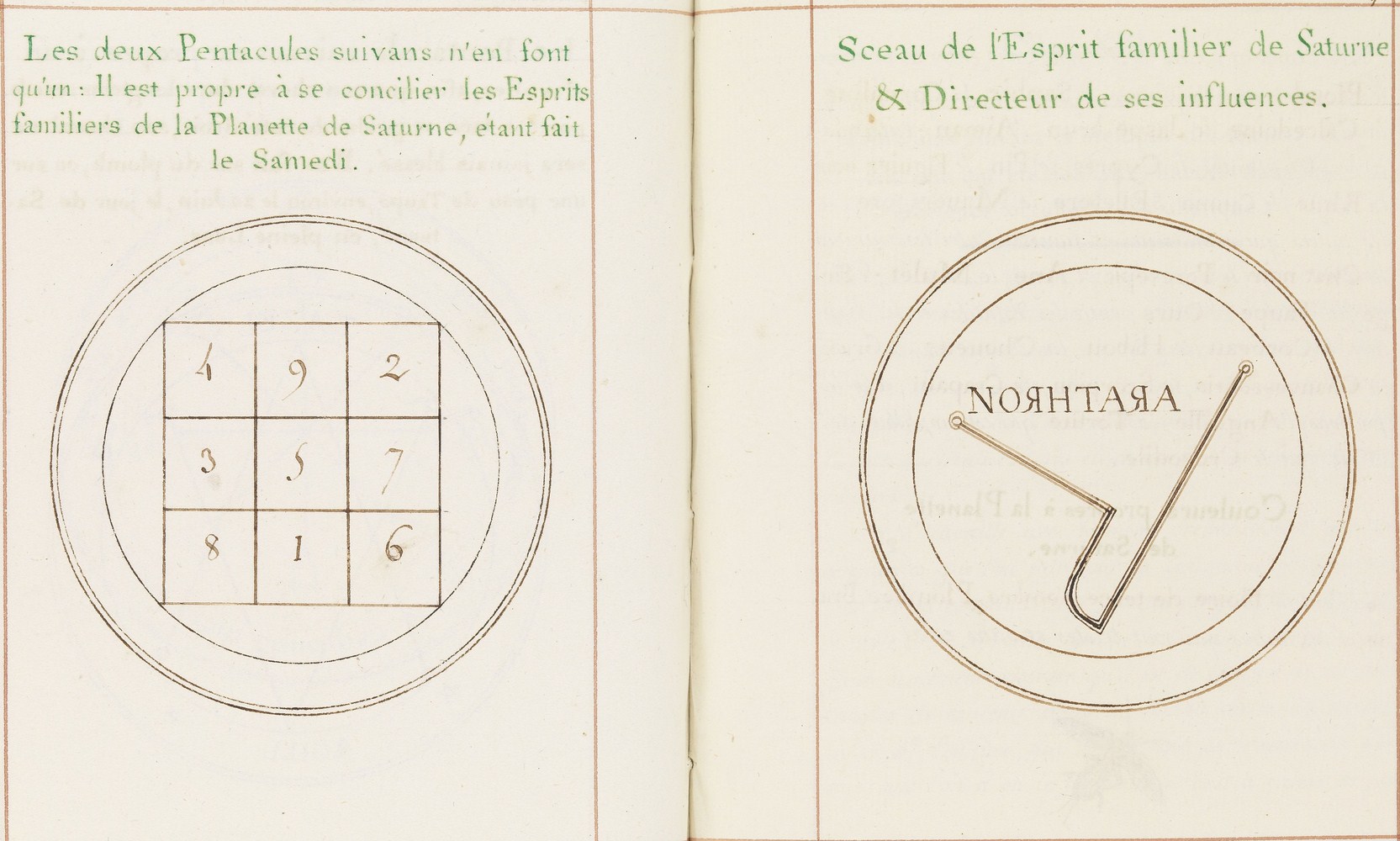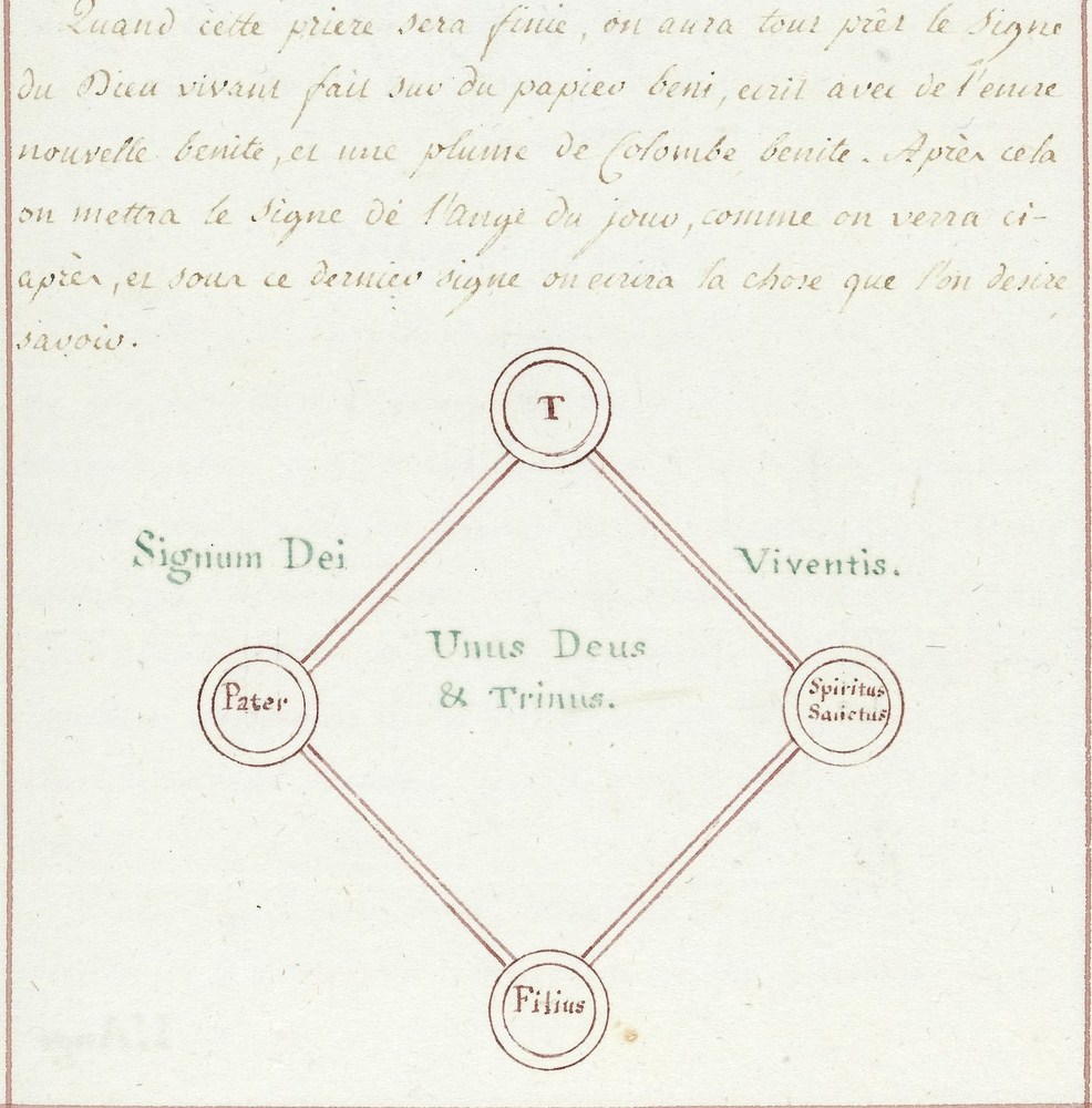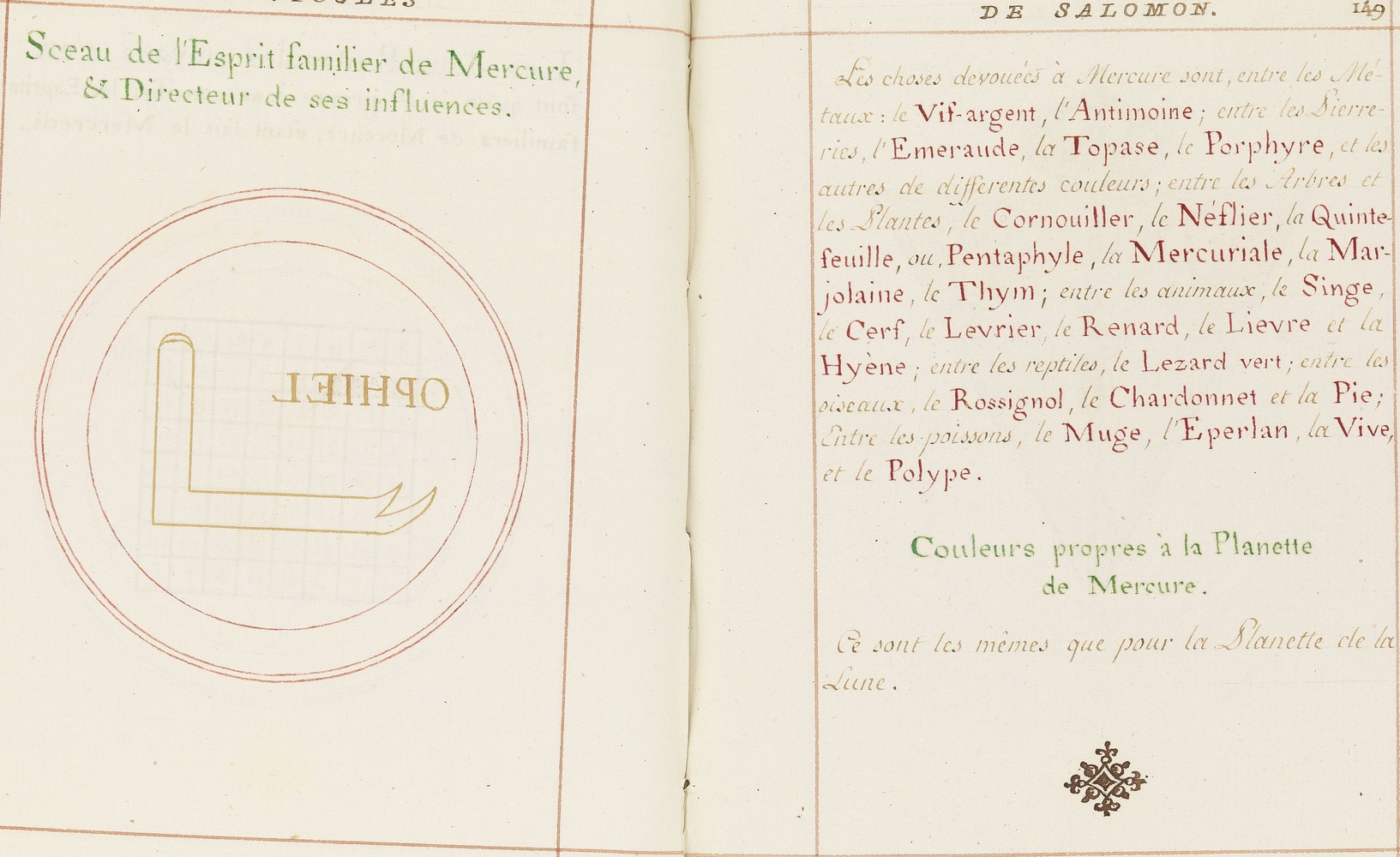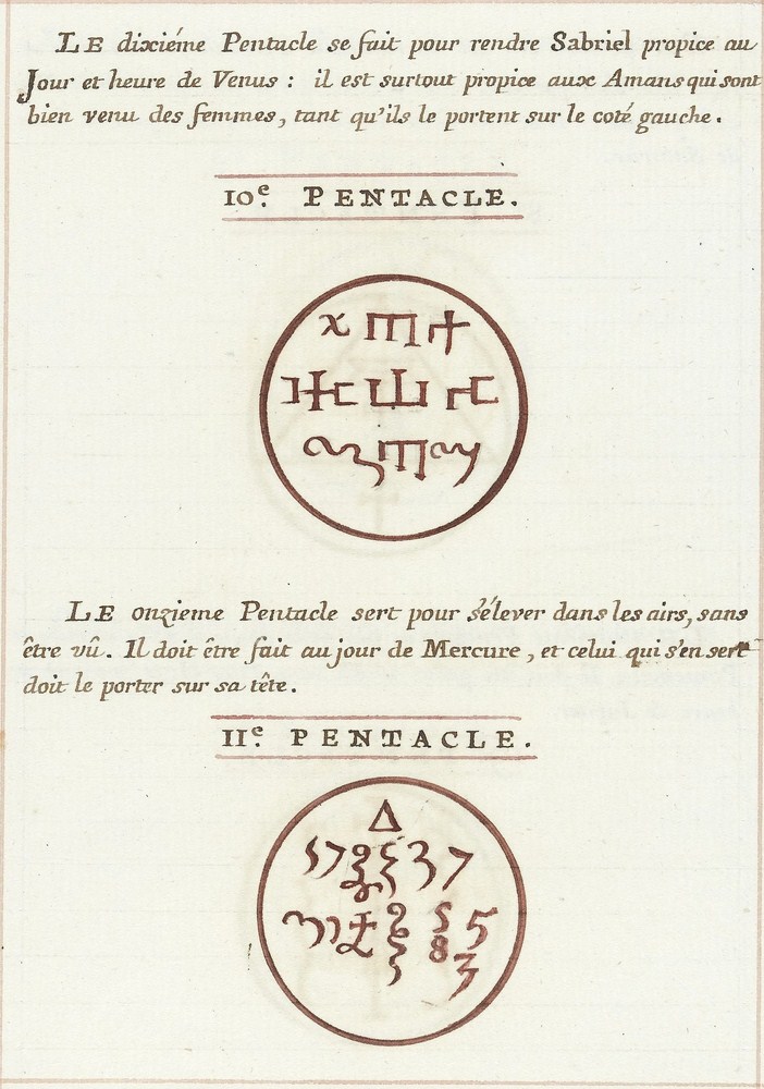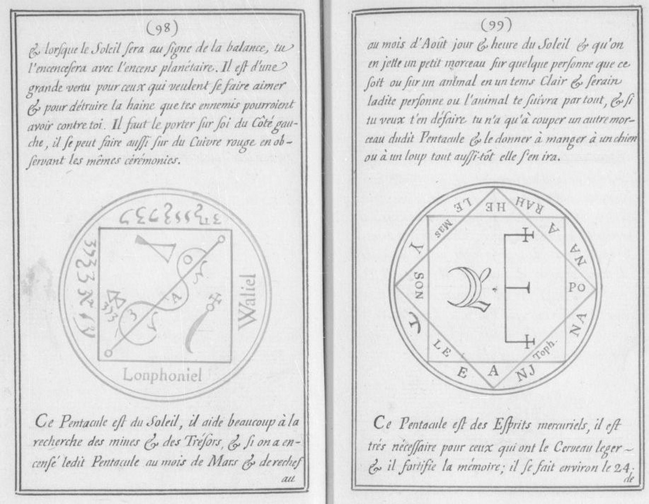 🕮 Dorbon-Aîné, ref.770 (pour le ms. WL) : Manuscrit très complet du XVIIIe siècle, l’un des rares, dans ce genre d’ouvrages, portant la date d’exécution et le nom du scribe. Il [est] d’ailleurs bien écrit sur papier vergé, texte encadré d’un filet rouge, et est illustré de 116 pantacles et tableaux, non compris quelques vignettes et caractères cabalistiques. — À la suite des « Clavicules » proprement dites se trouve un « Livre contenant plusieurs beaux et rares Secrets recueillis de divers bons et anciens autheurs cabalistes et negromantiens, et autres bien approuvés et expérimentés ».