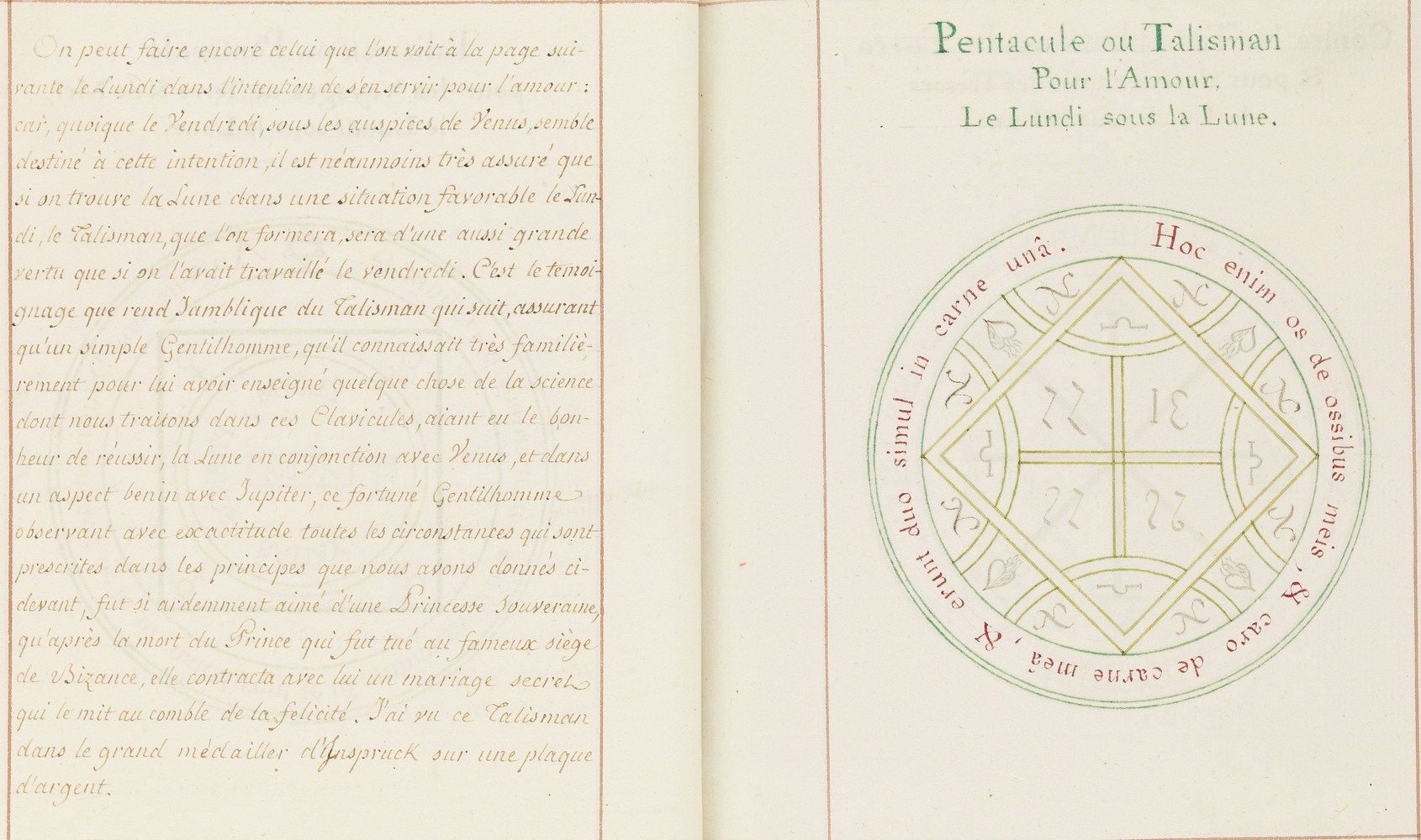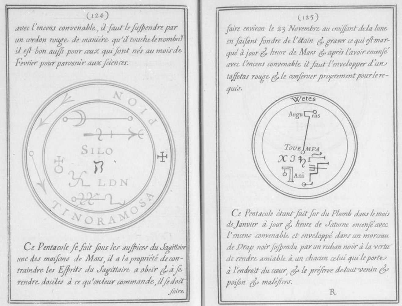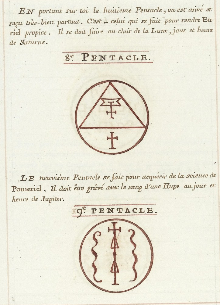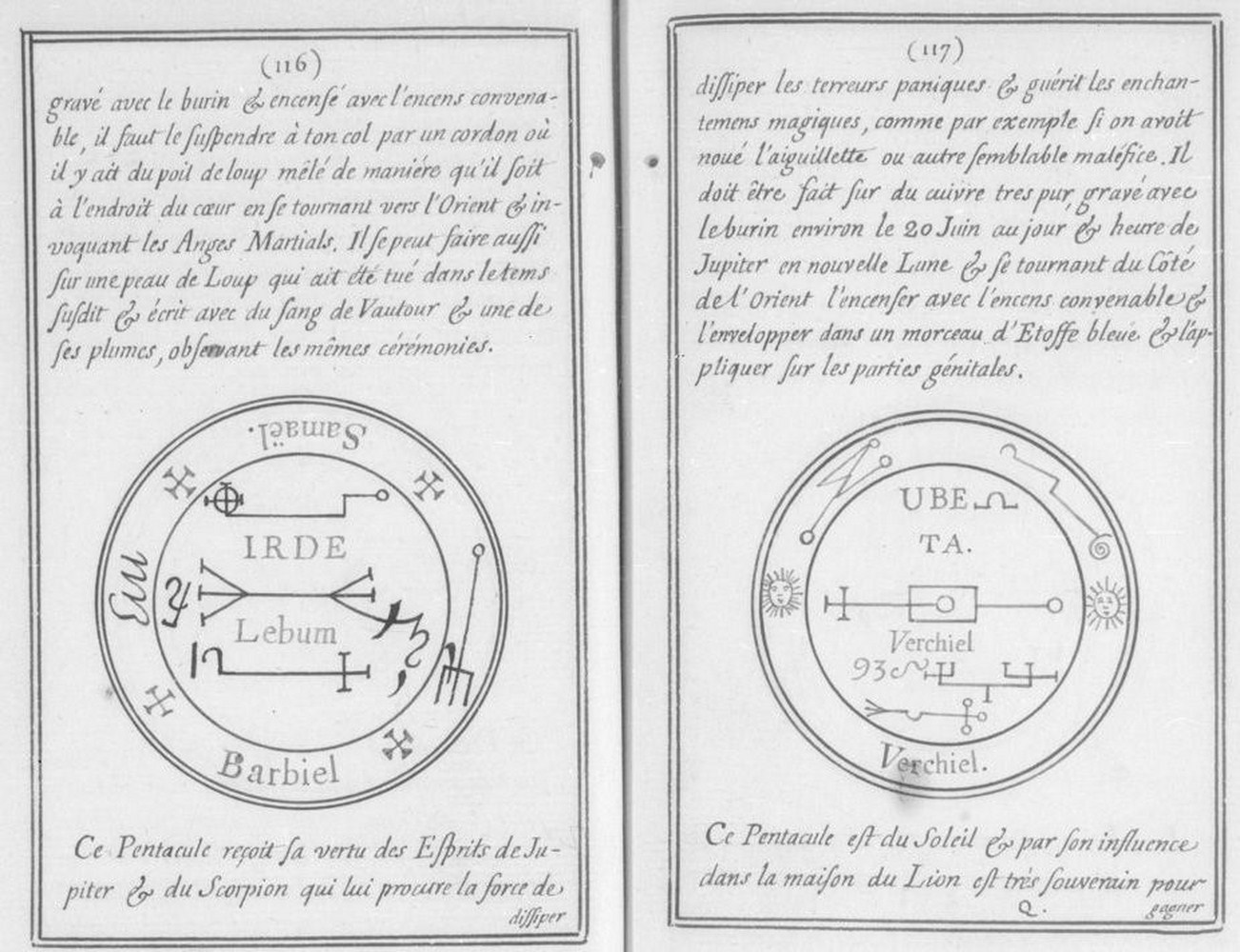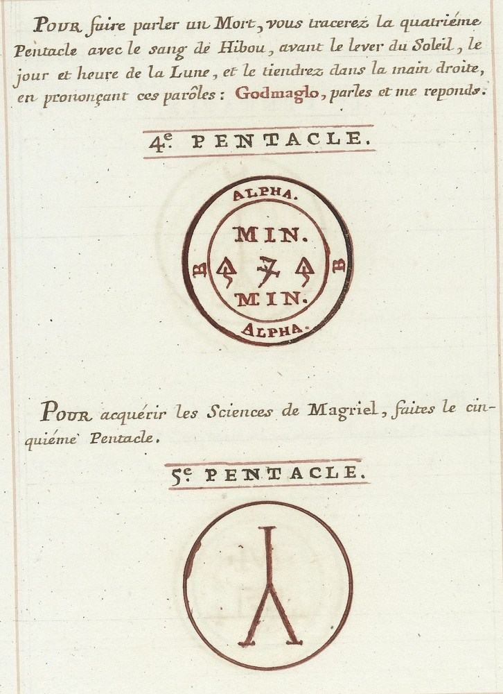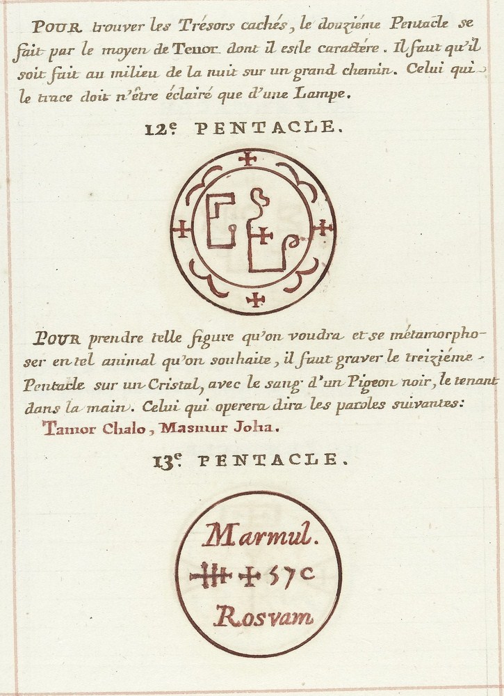 🕮 Dorbon-Aîné, ref.770 (pour le ms. WL) : Manuscrit très complet du XVIIIe siècle, l’un des rares, dans ce genre d’ouvrages, portant la date d’exécution et le nom du scribe. Il [est] d’ailleurs bien écrit sur papier vergé, texte encadré d’un filet rouge, et est illustré de 116 pantacles et tableaux, non compris quelques vignettes et caractères cabalistiques. — À la suite des « Clavicules » proprement dites se trouve un « Livre contenant plusieurs beaux et rares Secrets recueillis de divers bons et anciens autheurs cabalistes et negromantiens, et autres bien approuvés et expérimentés ».