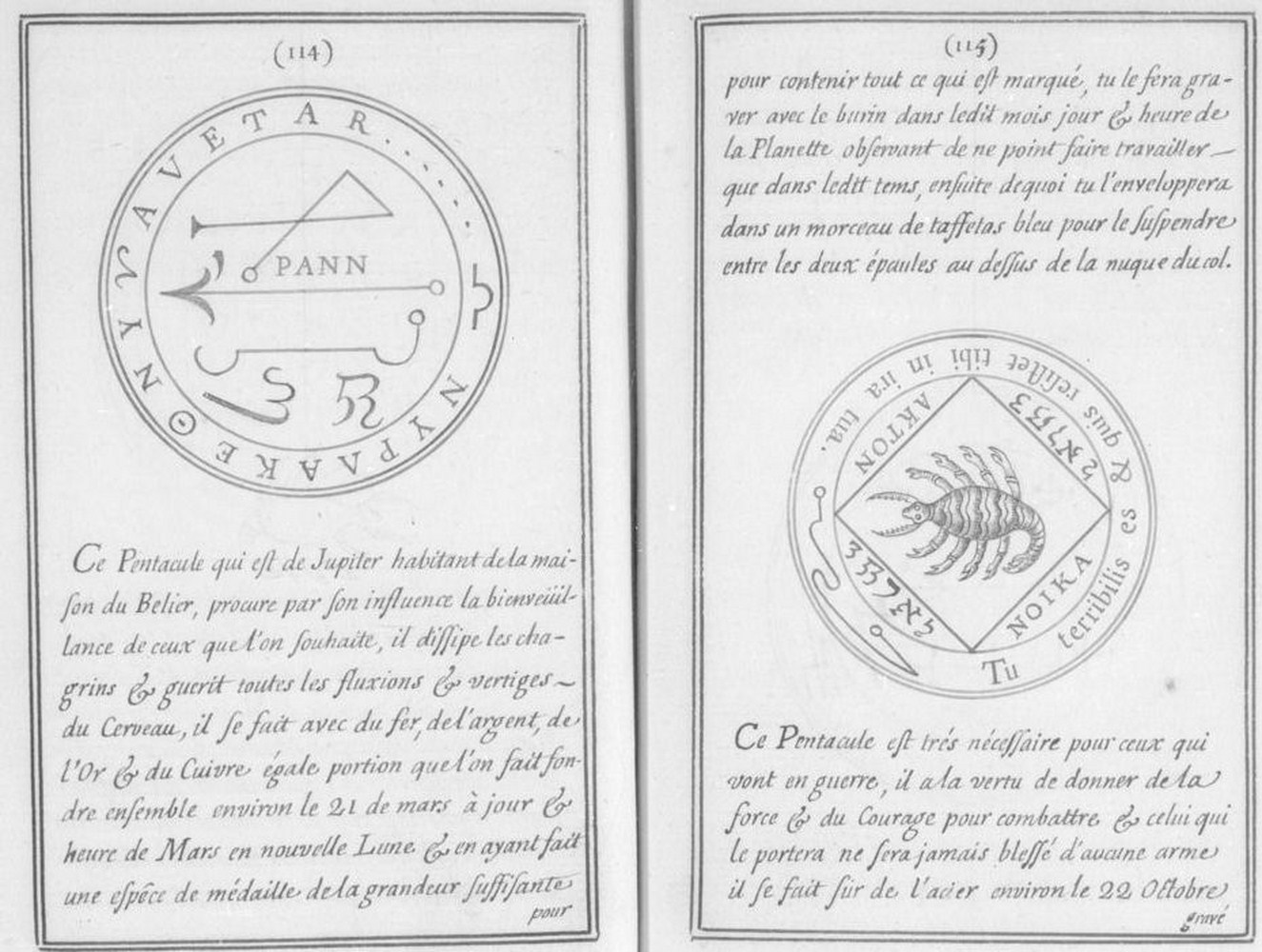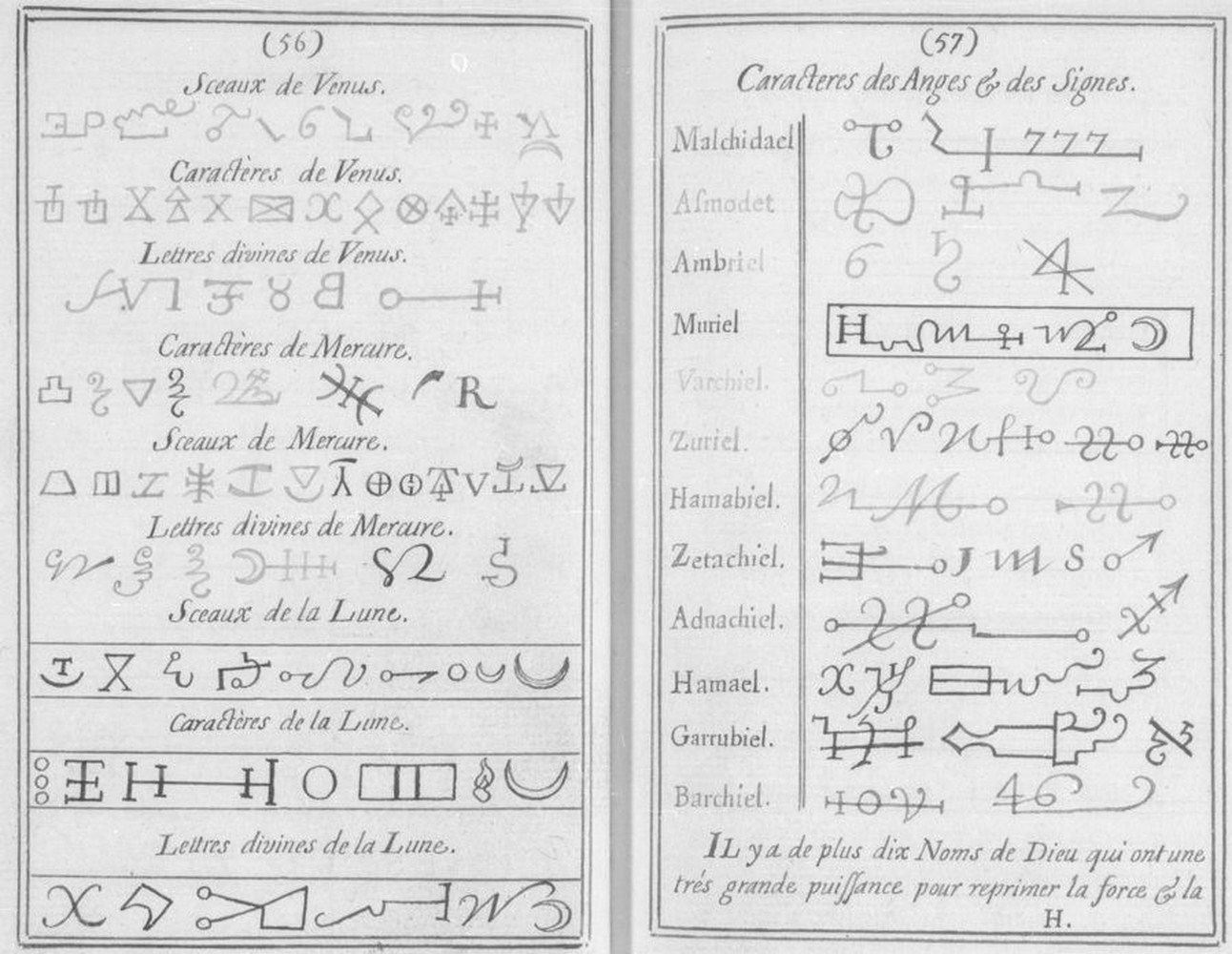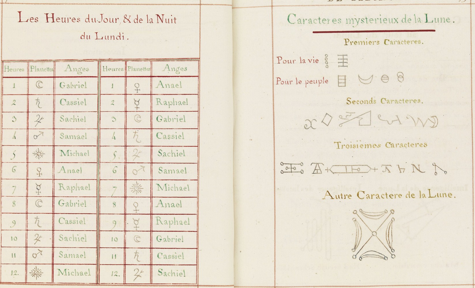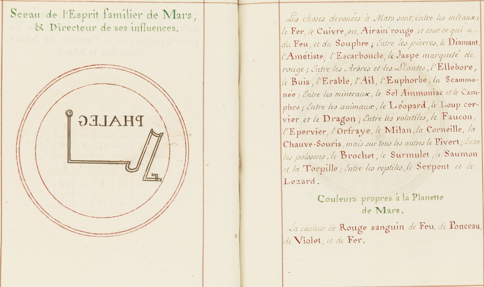 🕮 Dorbon-Aîné, ref.770 (pour le ms. WL) : Manuscrit très complet du XVIIIe siècle, l’un des rares, dans ce genre d’ouvrages, portant la date d’exécution et le nom du scribe. Il [est] d’ailleurs bien écrit sur papier vergé, texte encadré d’un filet rouge, et est illustré de 116 pantacles et tableaux, non compris quelques vignettes et caractères cabalistiques. — À la suite des « Clavicules » proprement dites se trouve un « Livre contenant plusieurs beaux et rares Secrets recueillis de divers bons et anciens autheurs cabalistes et negromantiens, et autres bien approuvés et expérimentés ».