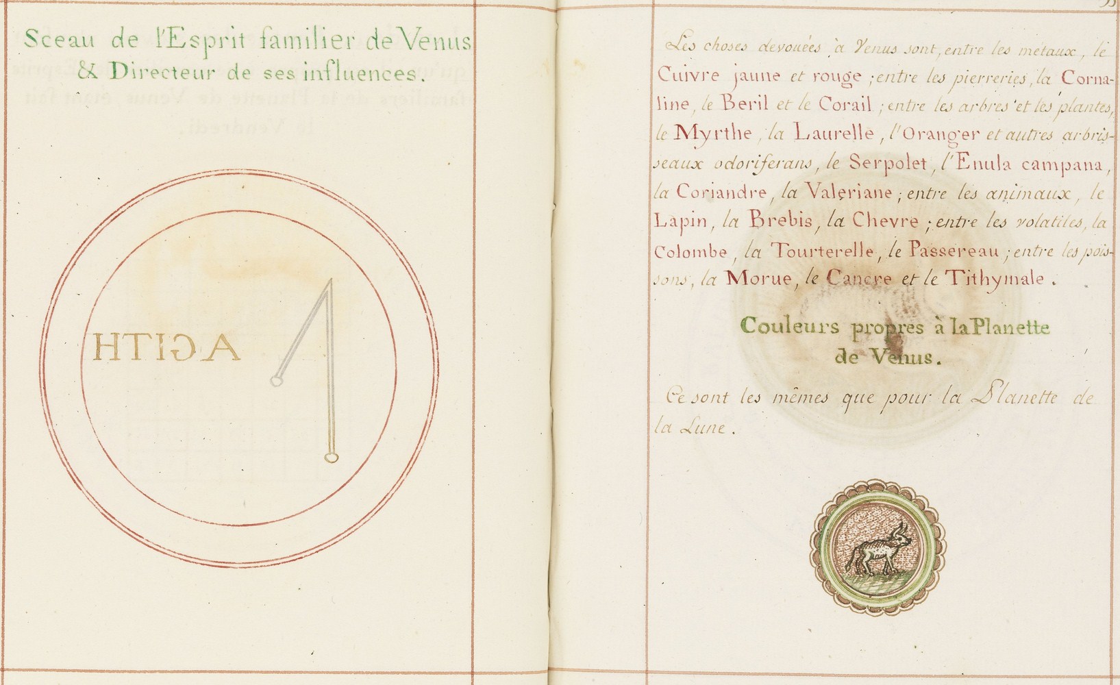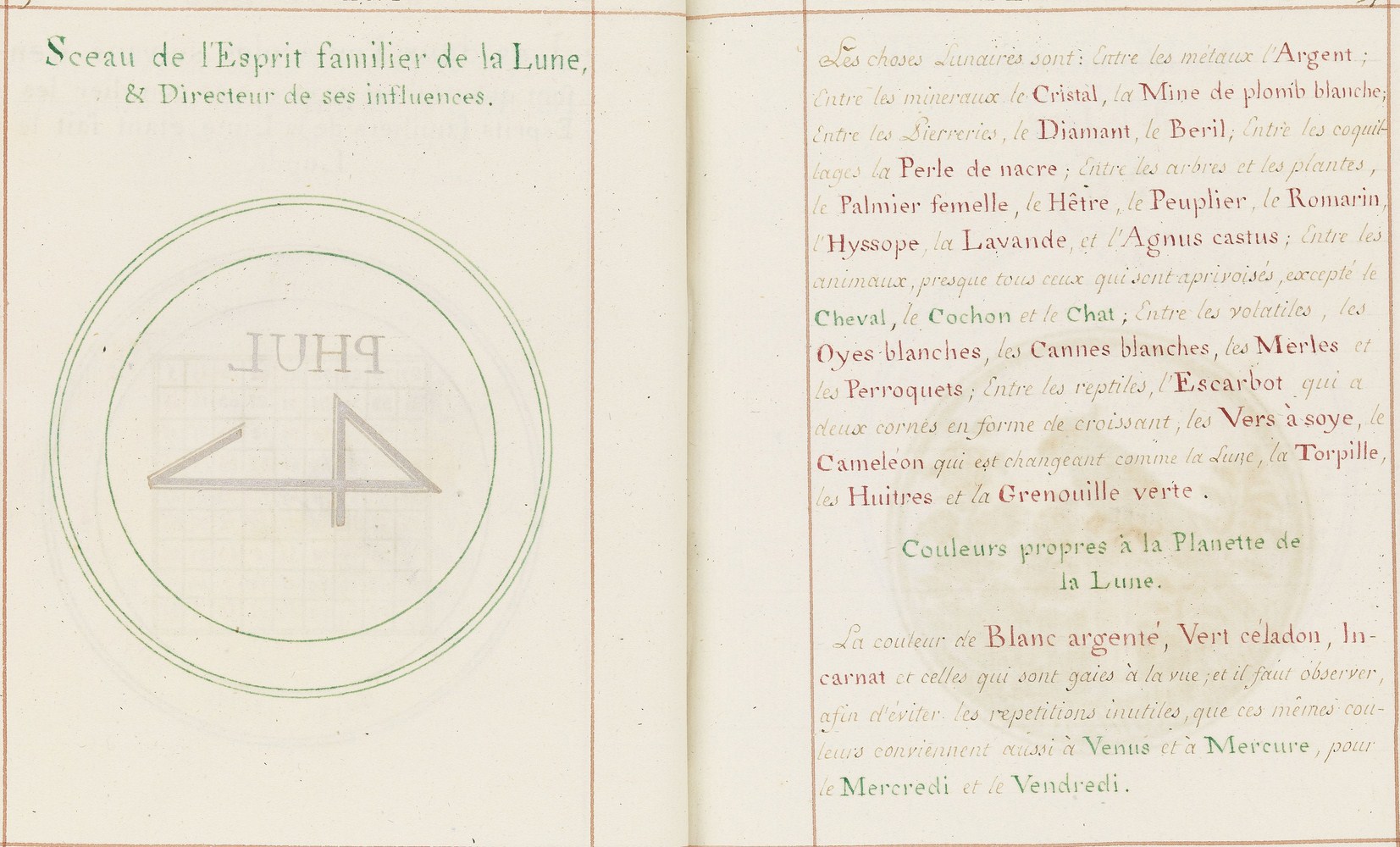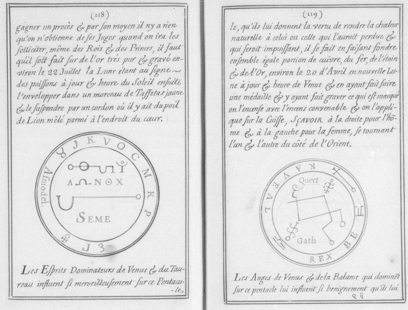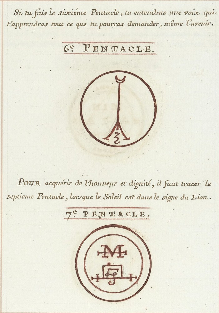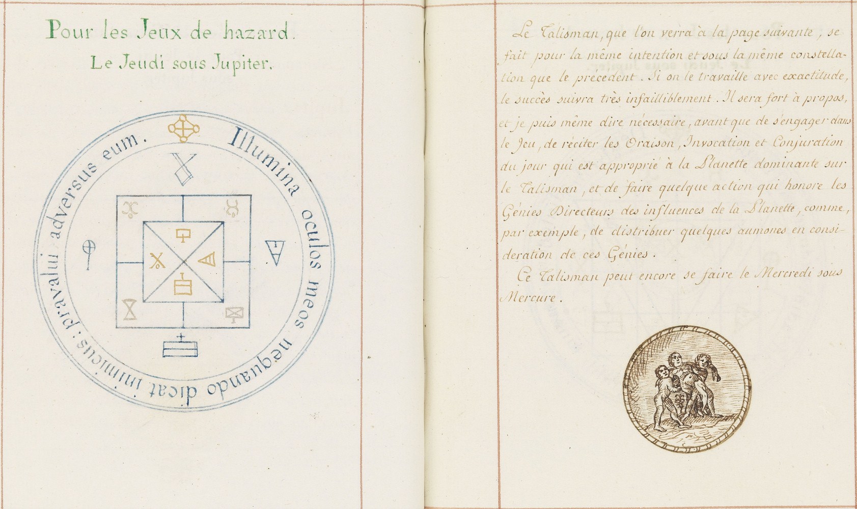 🕮 Dorbon-Aîné, ref.770 (pour le ms. WL) : Manuscrit très complet du XVIIIe siècle, l’un des rares, dans ce genre d’ouvrages, portant la date d’exécution et le nom du scribe. Il [est] d’ailleurs bien écrit sur papier vergé, texte encadré d’un filet rouge, et est illustré de 116 pantacles et tableaux, non compris quelques vignettes et caractères cabalistiques. — À la suite des « Clavicules » proprement dites se trouve un « Livre contenant plusieurs beaux et rares Secrets recueillis de divers bons et anciens autheurs cabalistes et negromantiens, et autres bien approuvés et expérimentés ».