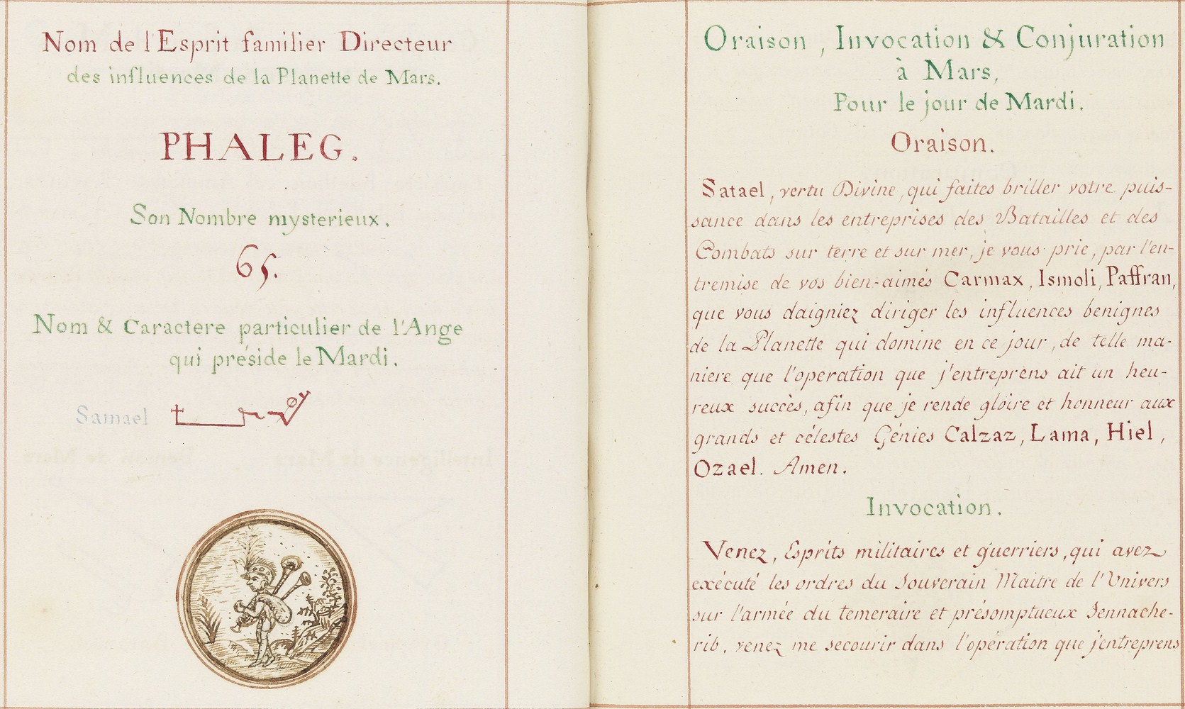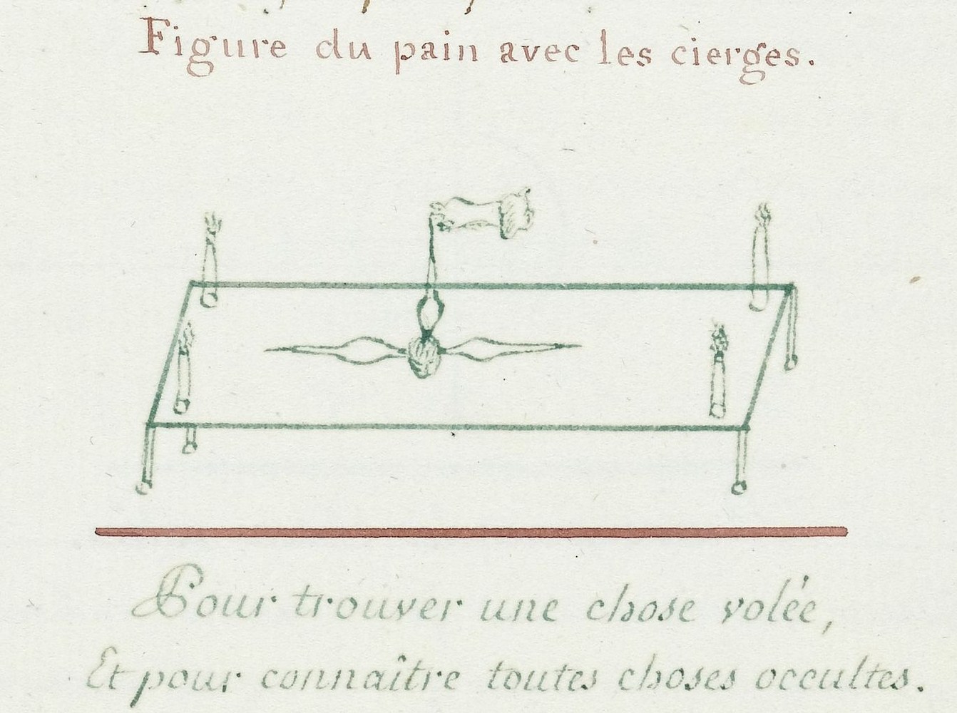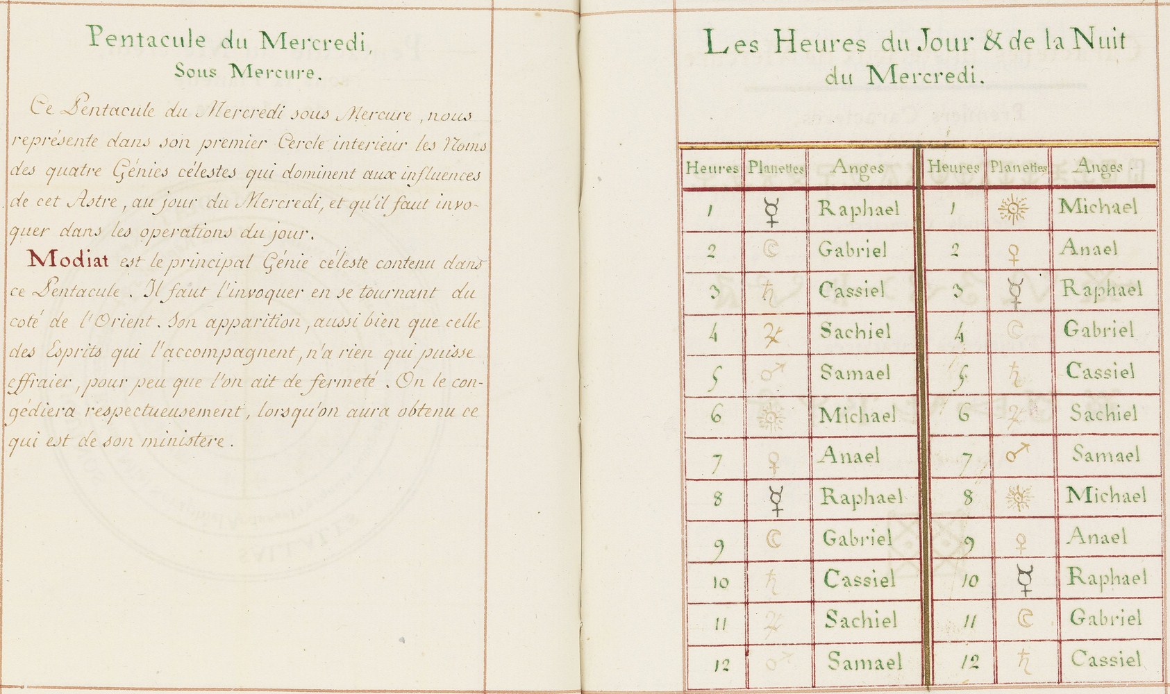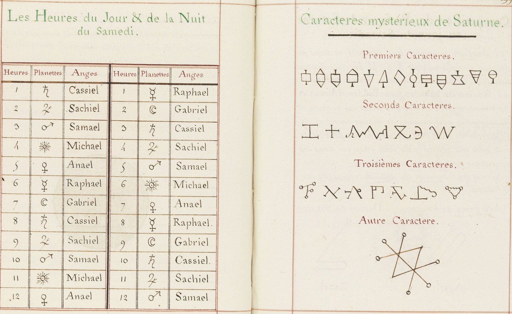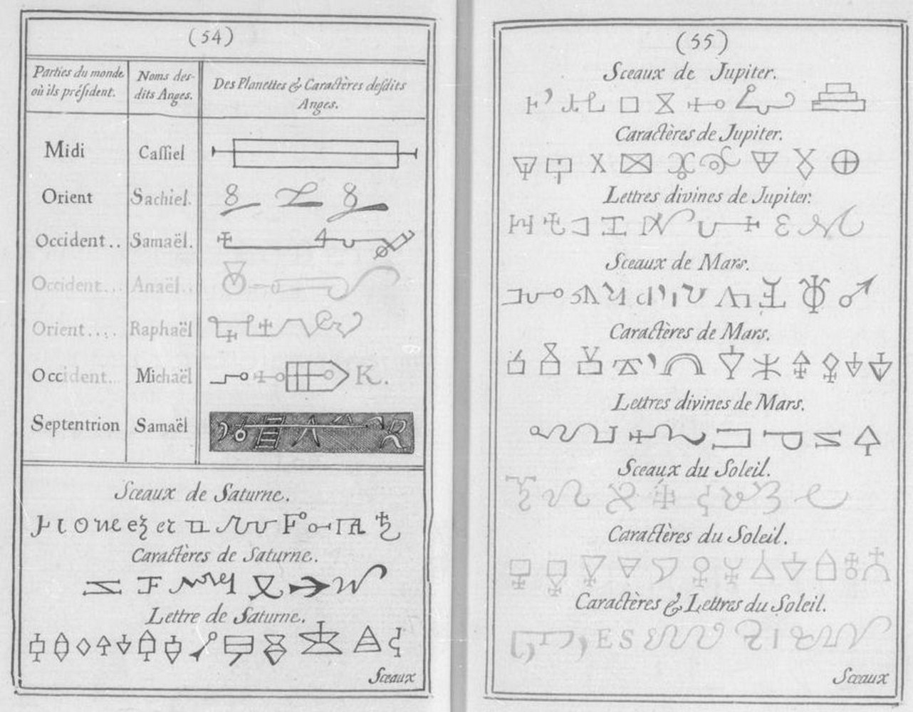 🕮 Dorbon-Aîné, ref.770 (pour le ms. WL) : Manuscrit très complet du XVIIIe siècle, l’un des rares, dans ce genre d’ouvrages, portant la date d’exécution et le nom du scribe. Il [est] d’ailleurs bien écrit sur papier vergé, texte encadré d’un filet rouge, et est illustré de 116 pantacles et tableaux, non compris quelques vignettes et caractères cabalistiques. — À la suite des « Clavicules » proprement dites se trouve un « Livre contenant plusieurs beaux et rares Secrets recueillis de divers bons et anciens autheurs cabalistes et negromantiens, et autres bien approuvés et expérimentés ».
